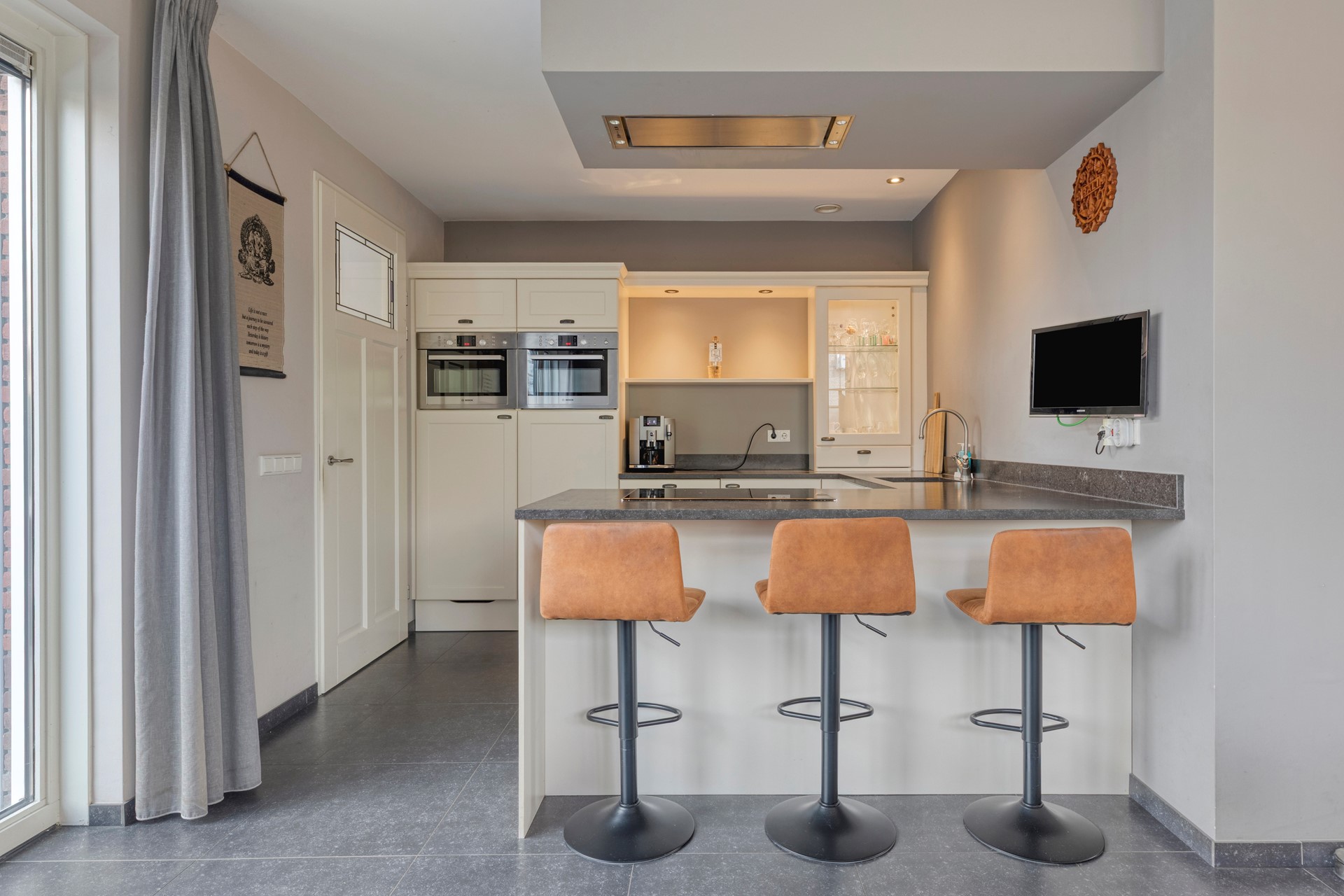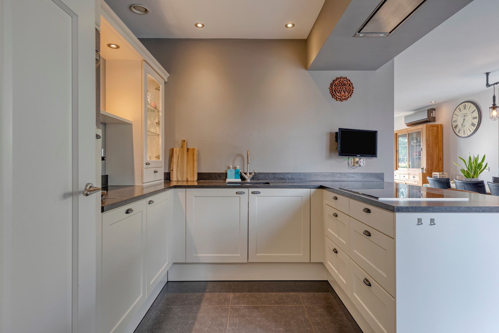 De open woonkeuken is afgewerkt met een betegelde vloer, gestucte wanden en een gestuct plafond. De in U-vorm opgestelde keukeninrichting is voorzien van o.a. een dubbele spoelbak, inductiekookplaat, koelkast, vriezer, vaatwasser, twee combi-ovens en voldoende kastruimte. Een ideale plek waar koken, gezelligheid en samen genieten moeiteloos samenkomen. De keuken biedt toegang tot de bijkeuken.