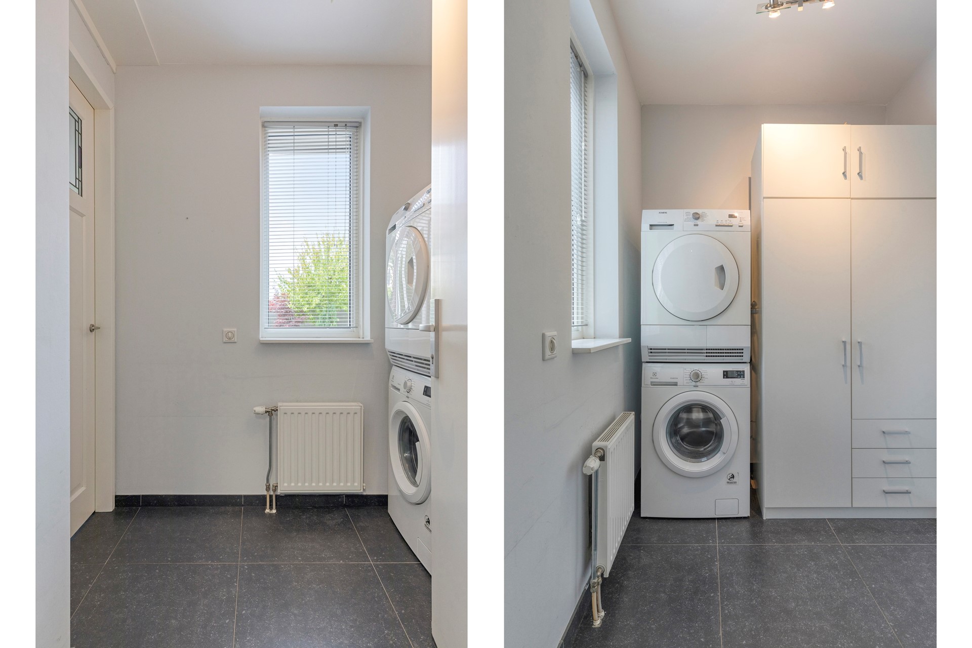 De bijkeuken is afgewerkt met een betegelde vloer, gestucte wanden en een gestuct plafond. De bijkeuken is voorzien van de aansluiting voor wasmachine en droger. De garage is voorzien van elektra, water en elektrische deur. Vanuit de garage is er toegang tot de tuinkamer.