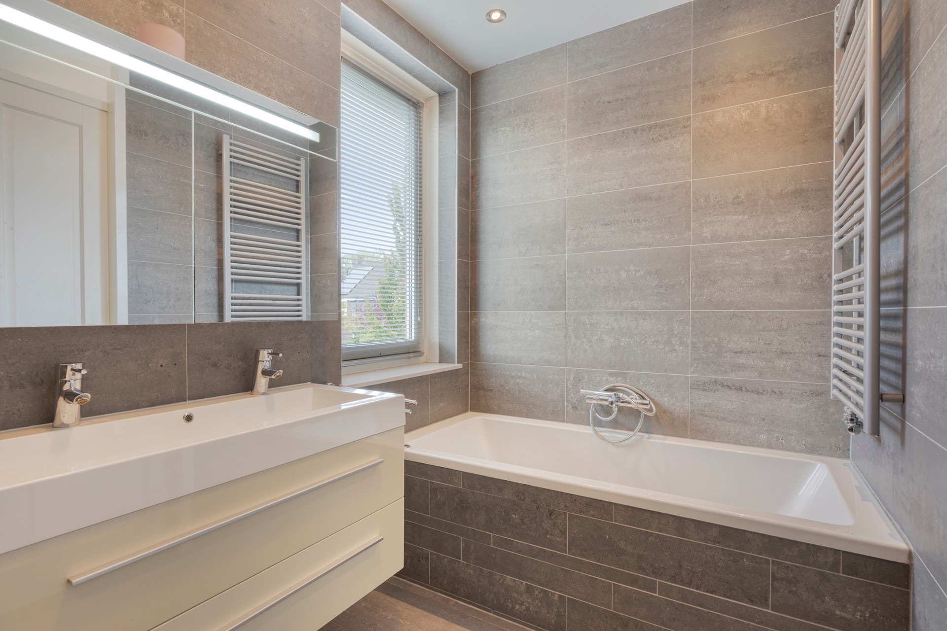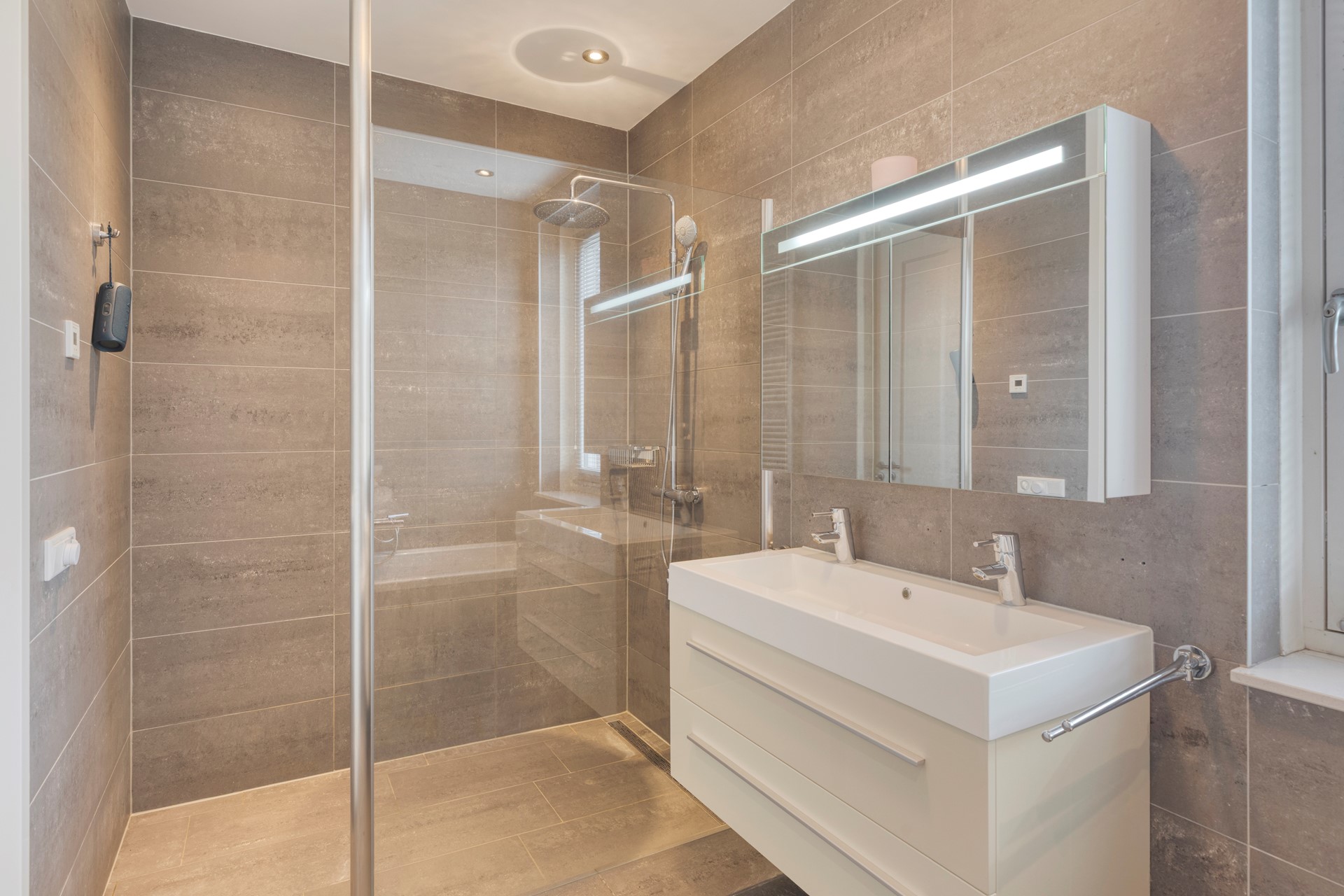 Kom na een lange werkdag heerlijk tot rust in het ligbad. De badkamer is afgewerkt met een betegelde vloer, betegelde wanden en een gestuct plafond met inbouwverlichting. De badkamer is voorzien van een ligbad, inloopdouche, wastafelmeubel, design radiator en natuurlijke- en mechanische ventilatie.