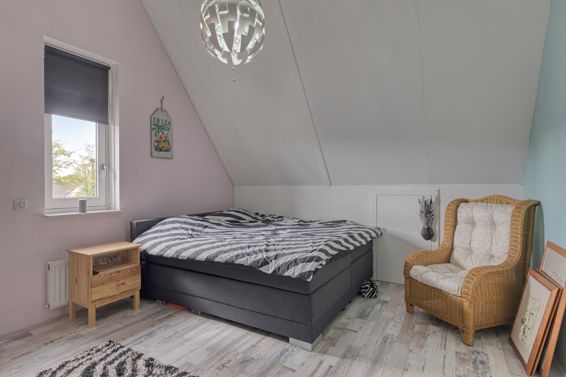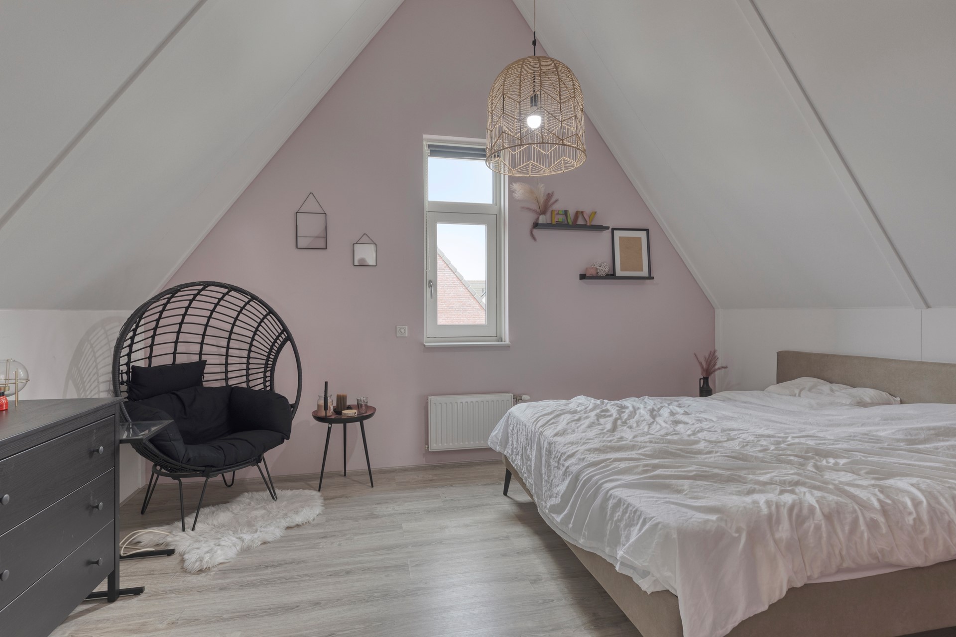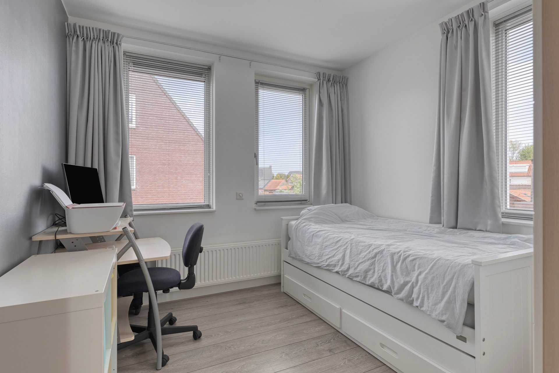 Slaapkamer 4 is afgewerkt met een laminaat vloer en gestucte wanden. . De slaapkamer is voorzien van een elektrisch rolluik en knieschotkasten.