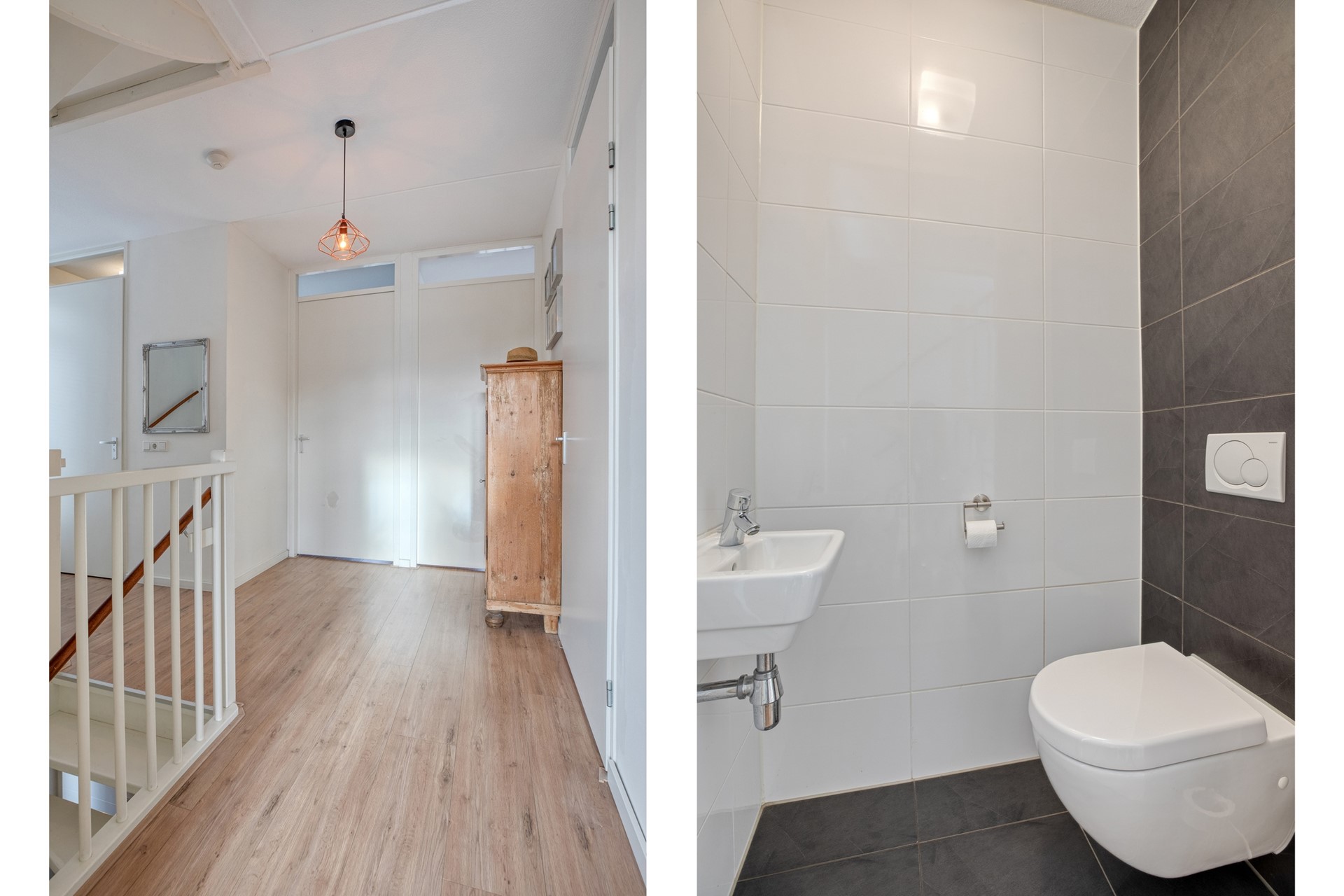 Middels de vaste trap op de begane grond bereiken jullie de overloop op de eerste verdieping. De overloop is afgewerkt met een laminaat vloer, gestucte wanden en een spuitwerk plafond. De overloop biedt toegang tot 3 slaapkamers, de badkamer, separaat toilet en de tweede verdieping middels een vaste trapopgang.