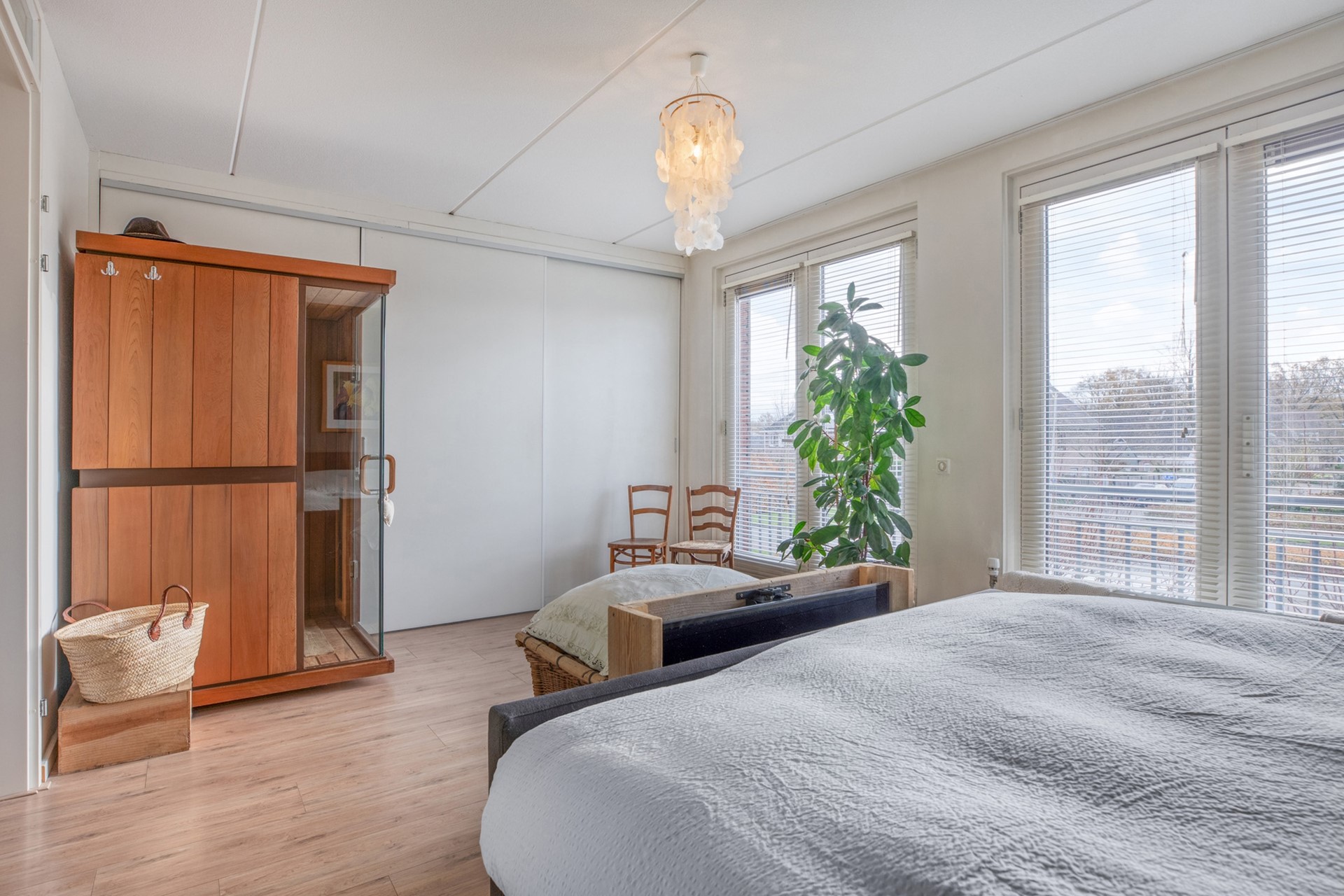 Slaapkamer 1 is afgewerkt met een laminaat vloer, gestucte wanden en een spuitwerk plafond. De slaapkamer is voorzien van een sauna, riante inbouwkast, rolluiken en frans balkon.
