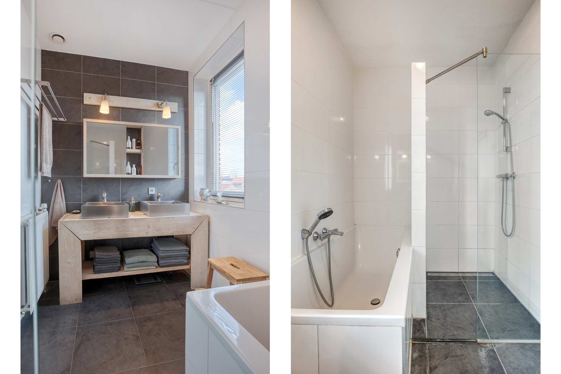 Geniet van pure ontspanning in het comfortabele ligbad. De badkamer is afgewerkt met een betegelde vloer, betegelde wanden en een spuitwerk plafond. De badkamer is voorzien van een modern wastafelmeubel met dubbele wasbakken, ligbad, inloopdouche en radiator.