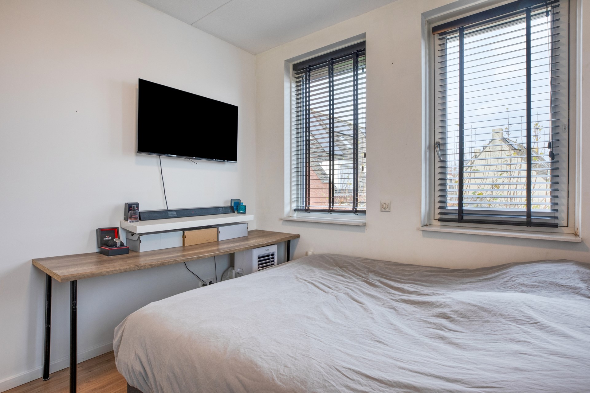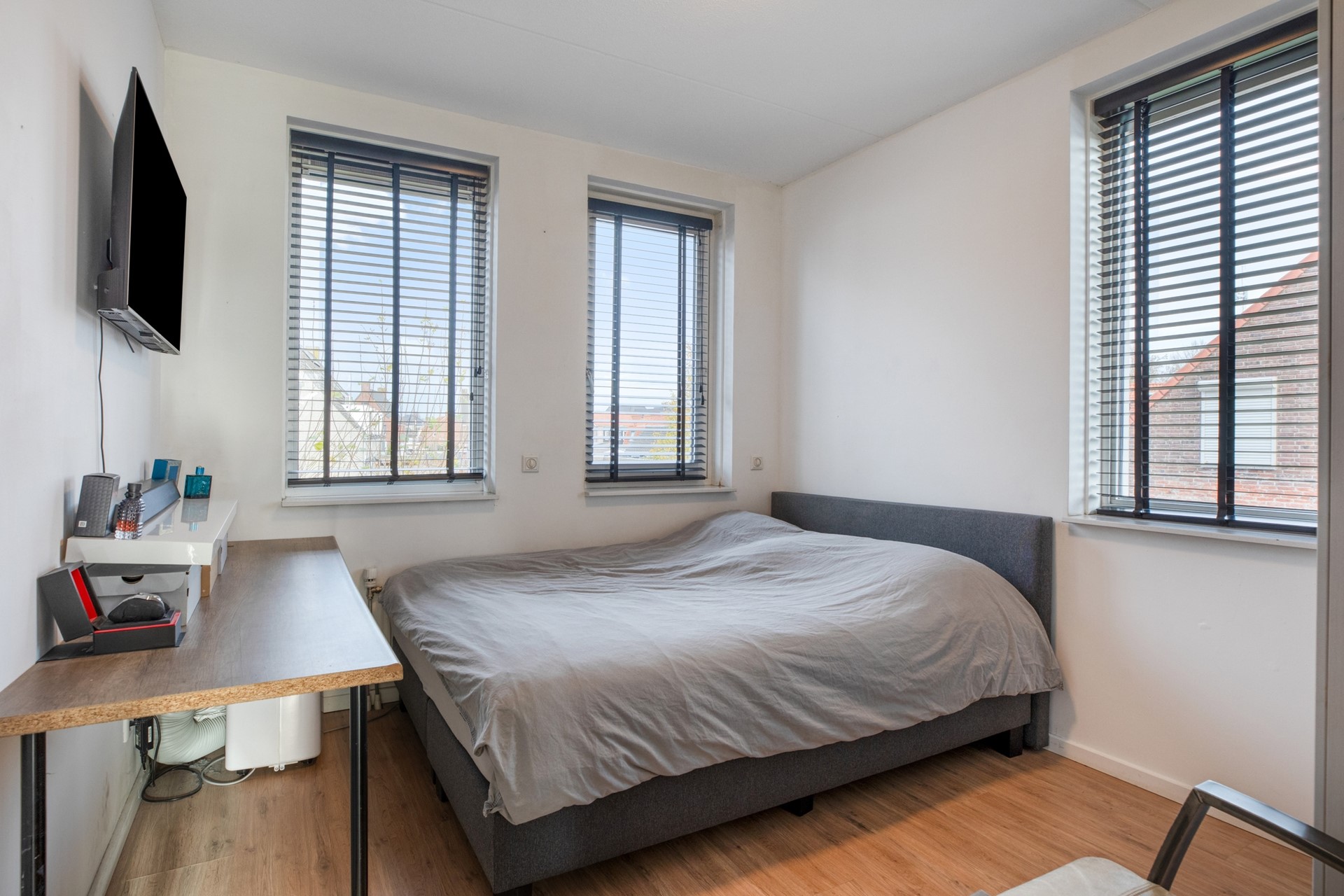 Slaapkamer 3 is afgewerkt met een laminaat vloer, gestucte wanden en een spuitwerk plafond.