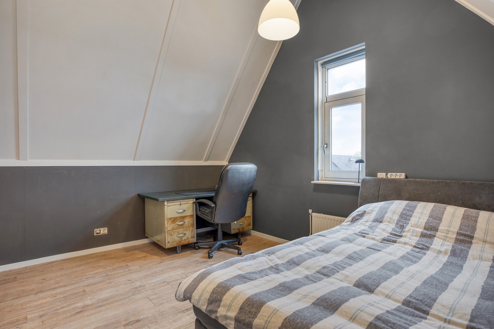 Slaapkamer 4 is afgewerkt met een laminaat vloer, gesauste wanden en plafondplaten. De slaapkamer is voorzien van een knieschotkast.