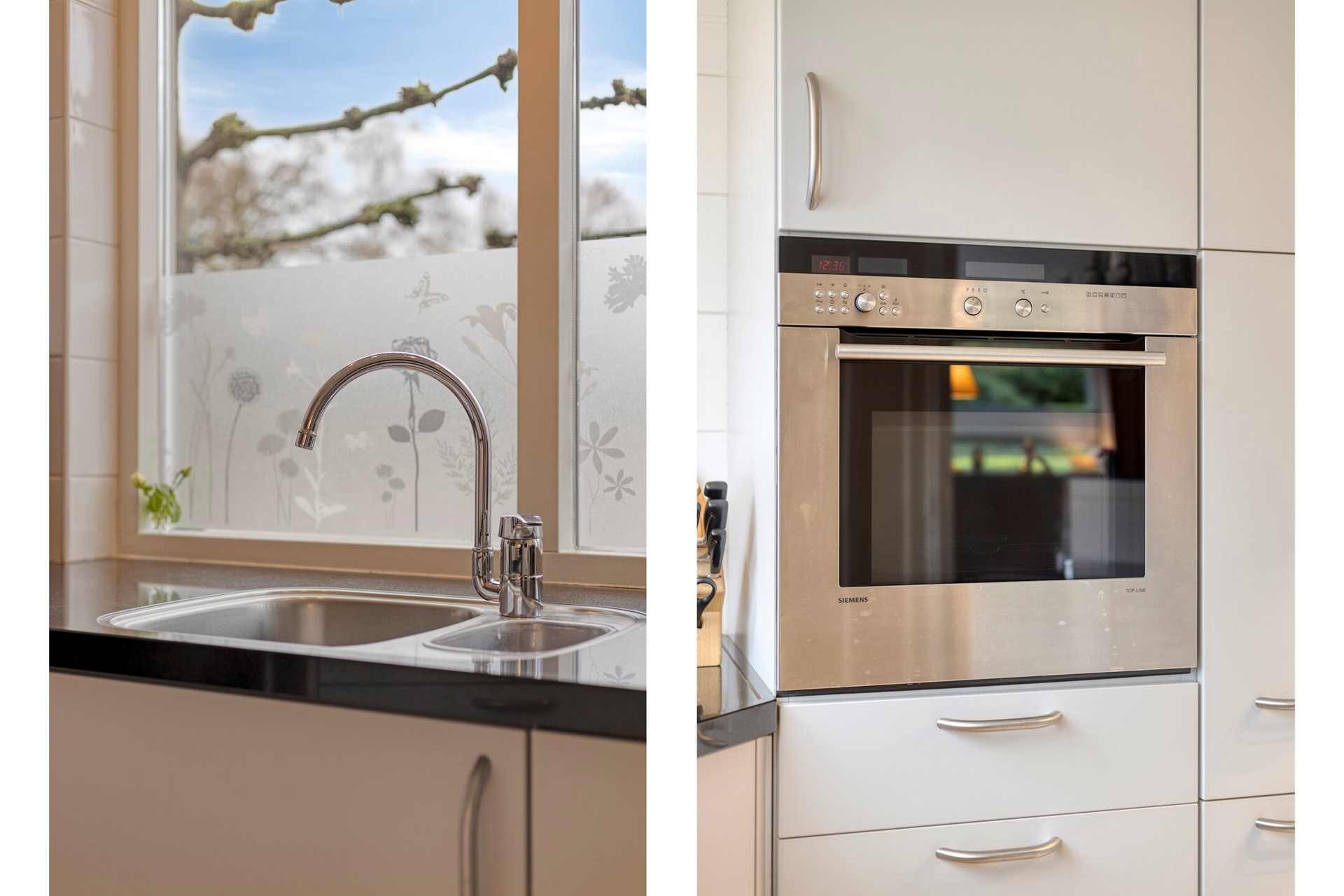 Nieuwe recepten uitproberen? Deze zullen zeker lukken in deze lichte open keuken! De keuken is afgewerkt met een marmeren vloer, betegelde wanden en een kunststof delen plafond. De in een hoek opgestelde keukeninrichting is voorzien van een inductie kookplaat, onder- en bovenkastjes, spoelbak, combi-oven, koelkast en screens. De keuken biedt toegang tot de bijkeuken die toegang biedt tot de zij-ingang van de woning.