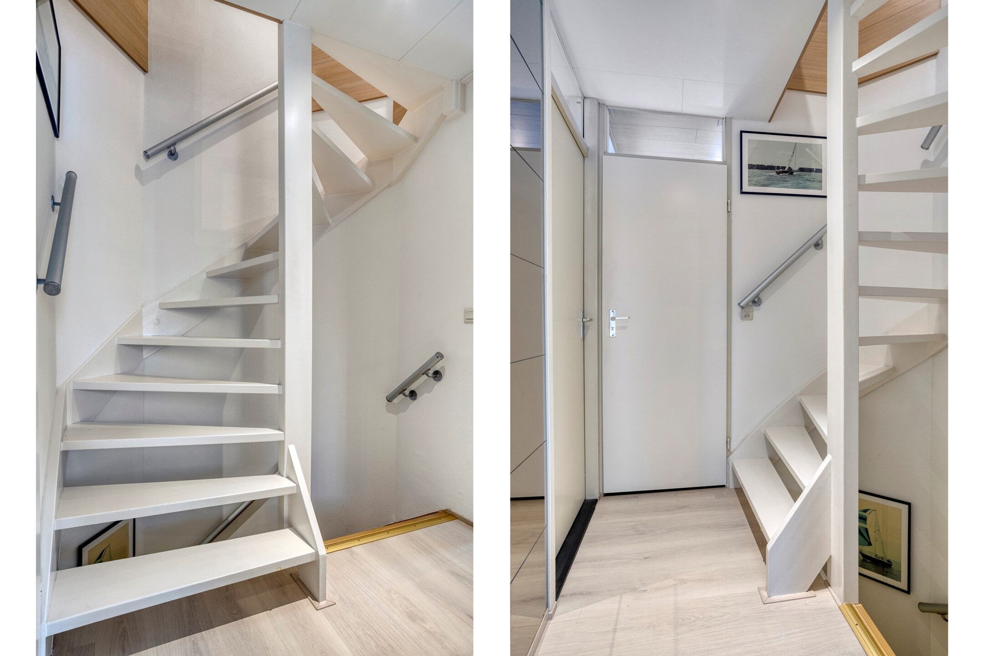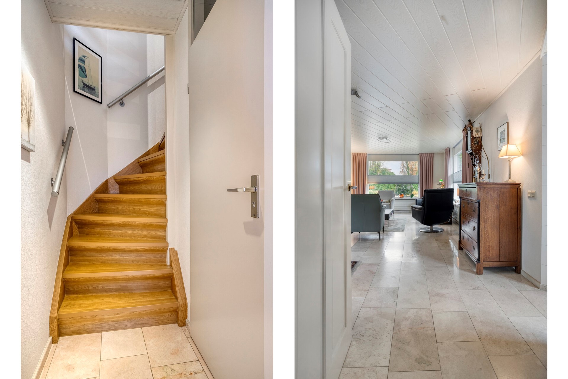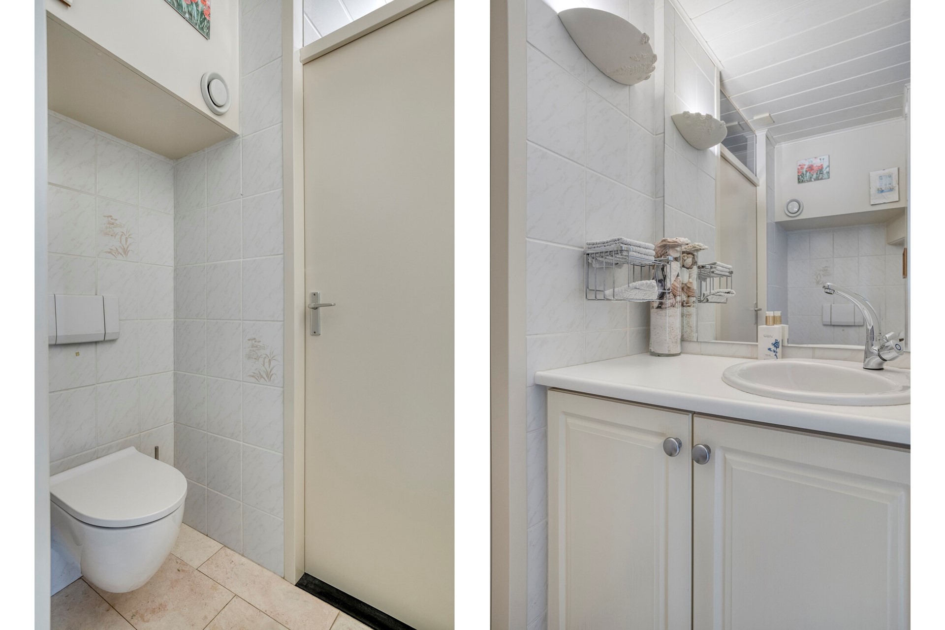 De tweede hal beschikt over de trapopgang naar de eerste verdieping en biedt toegang tot het betegeld toilet met fonteintje.