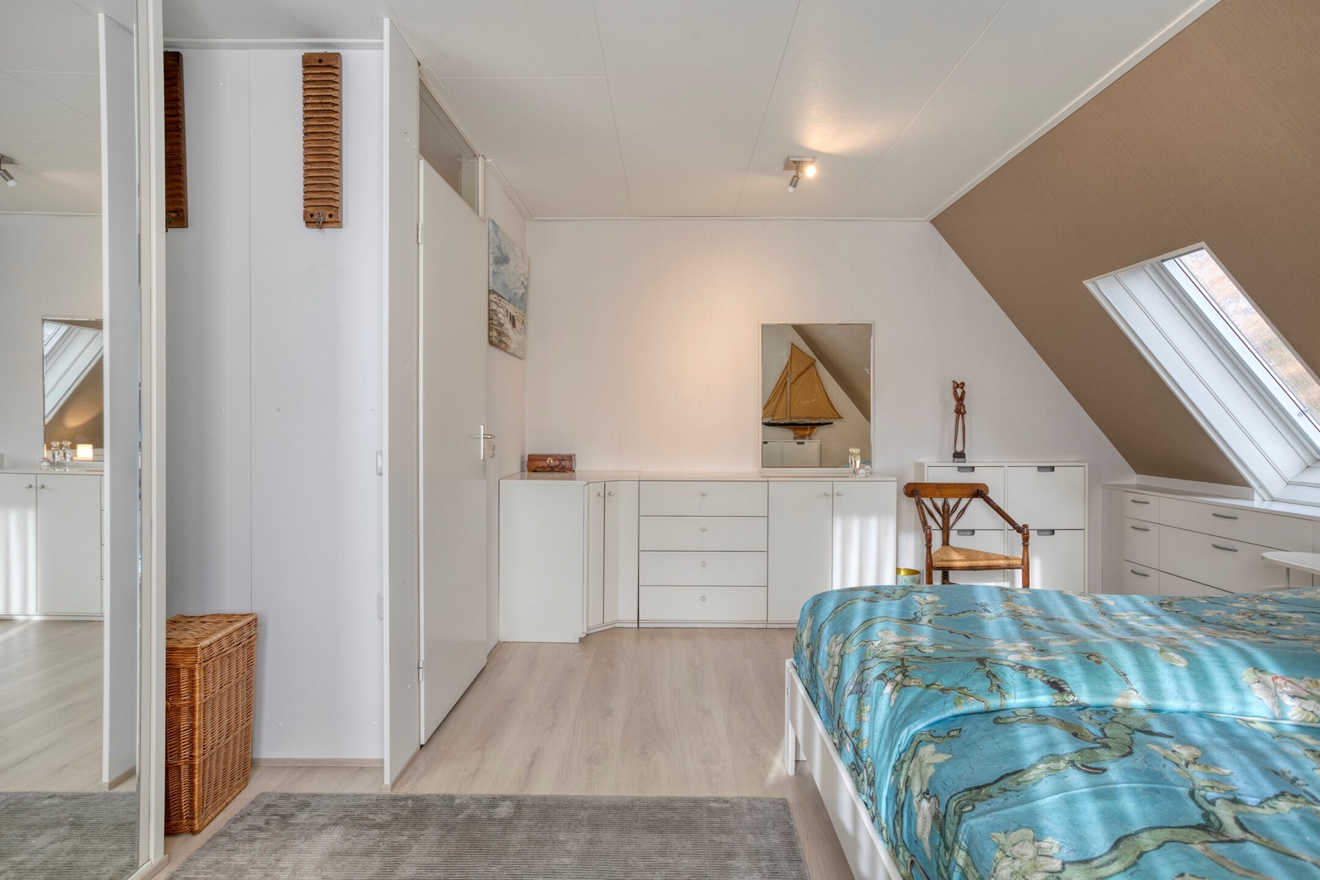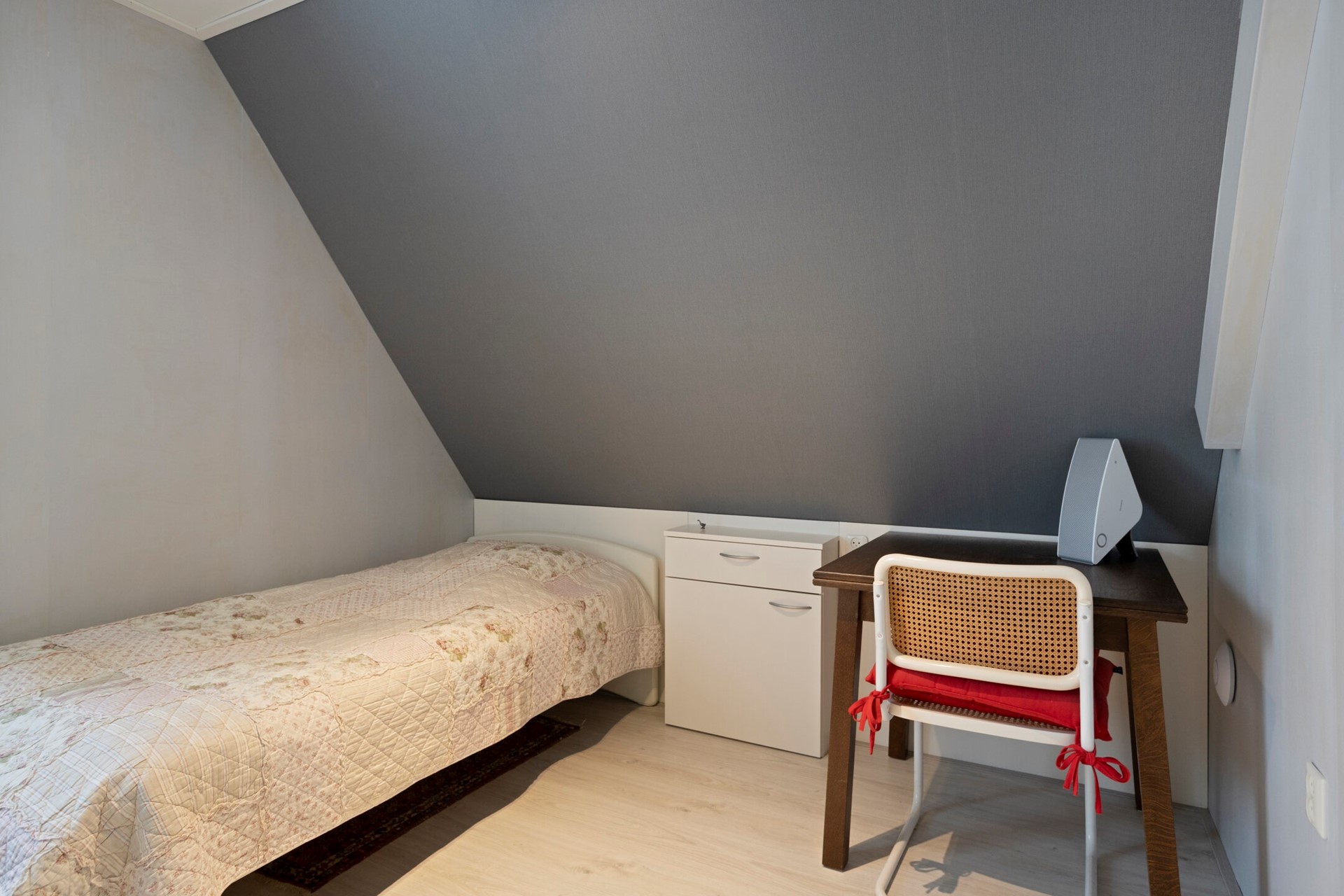Slaapkamer 3 is afgewerkt met een laminaat vloer, behangen wanden en plafondplaten. De slaapkamer is voorzien van inbouwkasten en een dakraam.