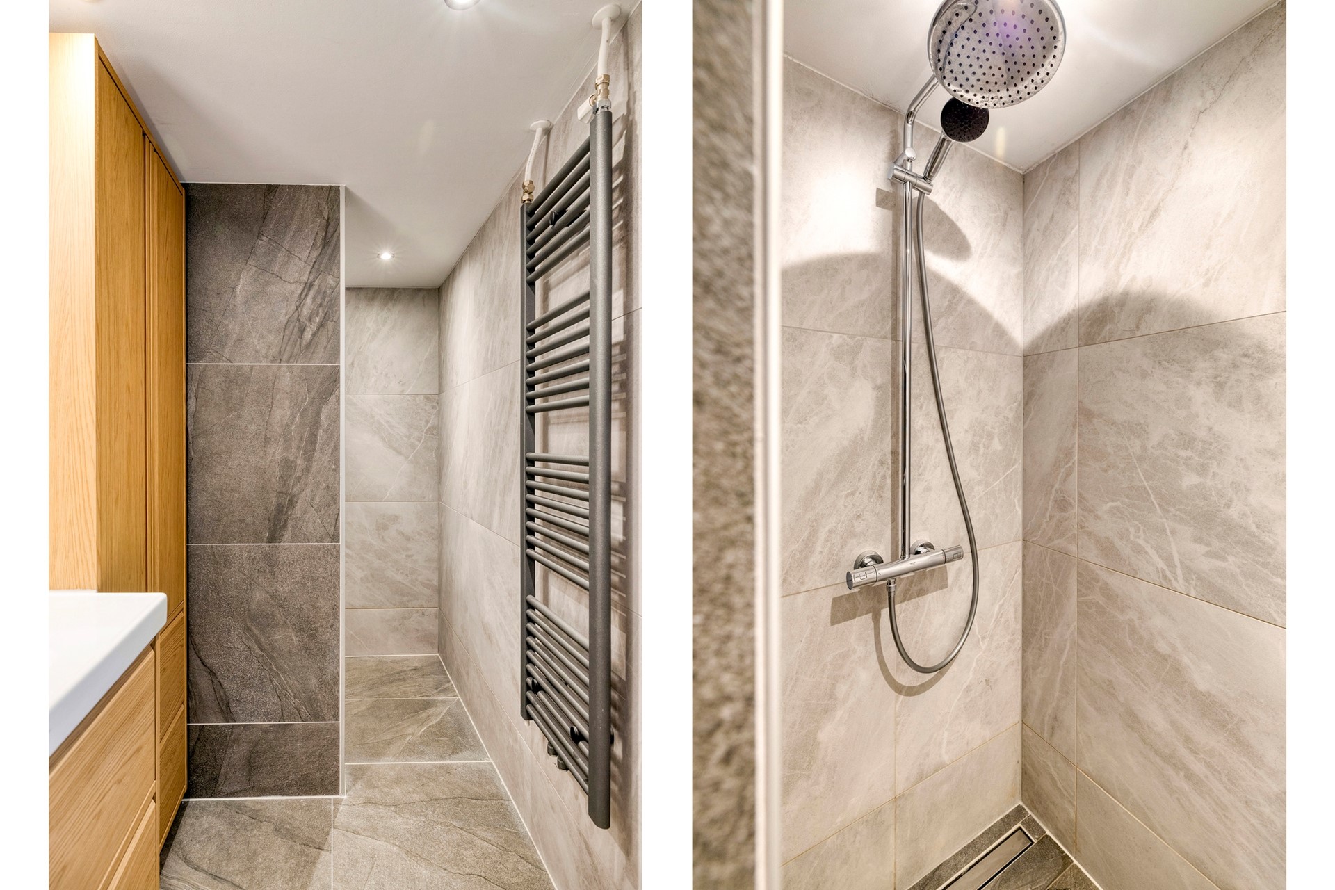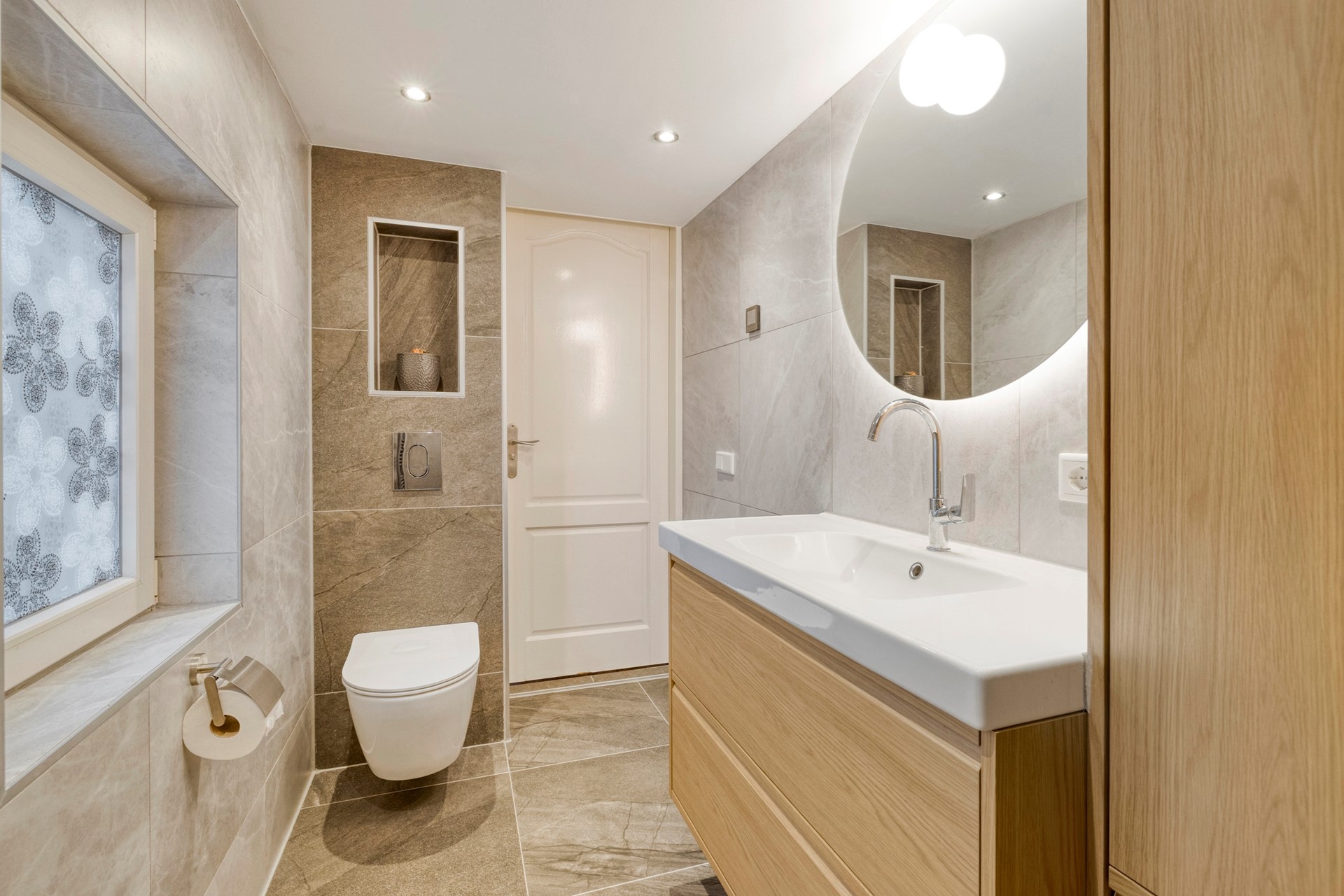 De luxe badkamer uit 2025 is een ware eyecatcher! De badkamer is afgewerkt met een betegelde vloer, betegelde wanden en een gestuct plafond met inbouwverlichting. De badkamer is voorzien van een toilet, wastafelmeubel en inloopdouche.