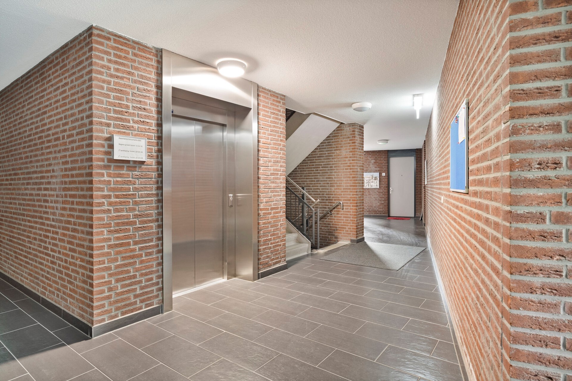 Het appartementencomplex 'Adel' is gelegen aan het begin van de moderne woonwijk 'Buiten de Veste'. Het portiek is voorzien van een deurbeltableau met beeldcamera. In de centrale hal bevinden zich de brievenbussen, lift en trappenhuis. Vanuit hier is er toegang tot het souterrain.