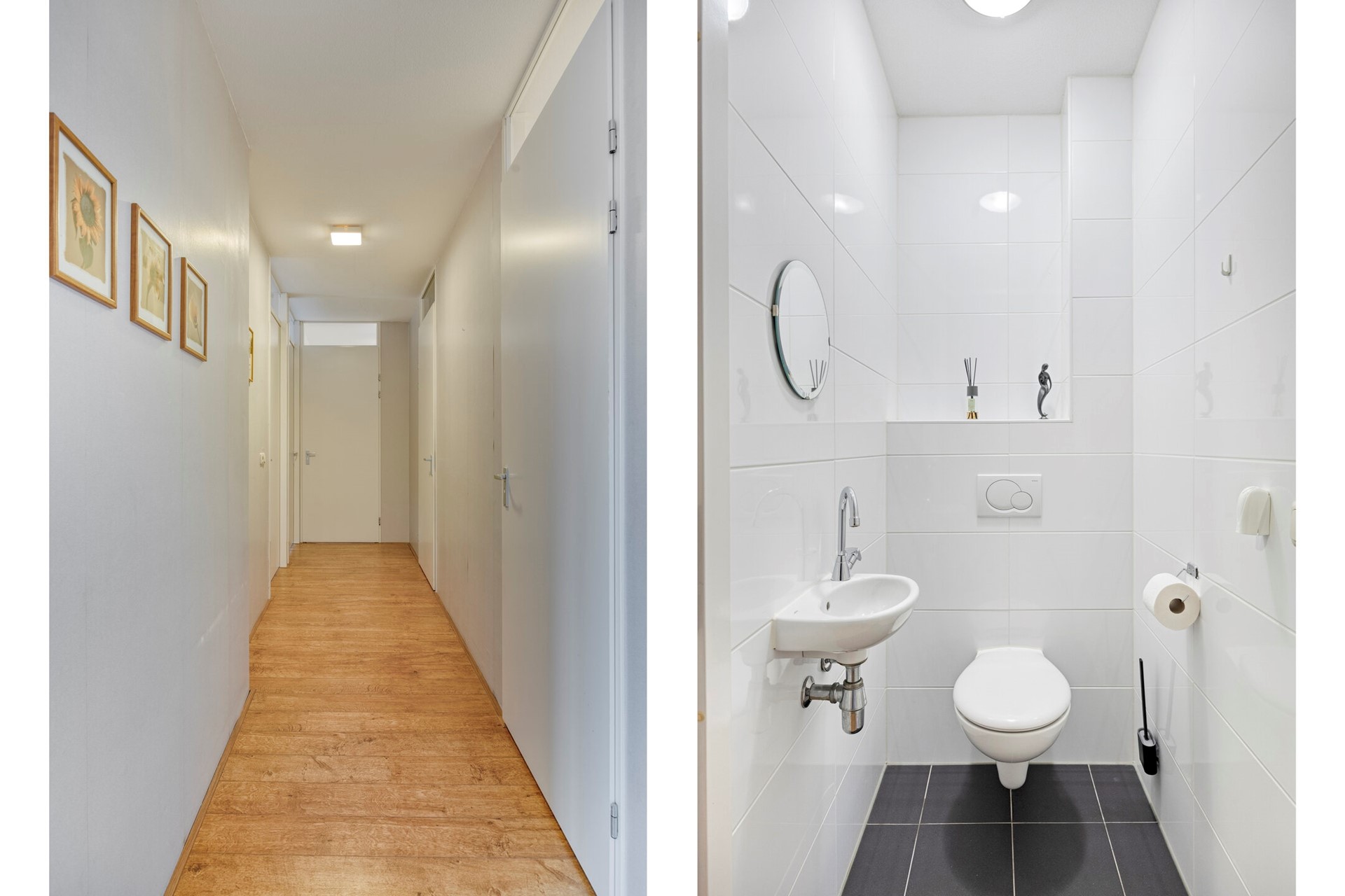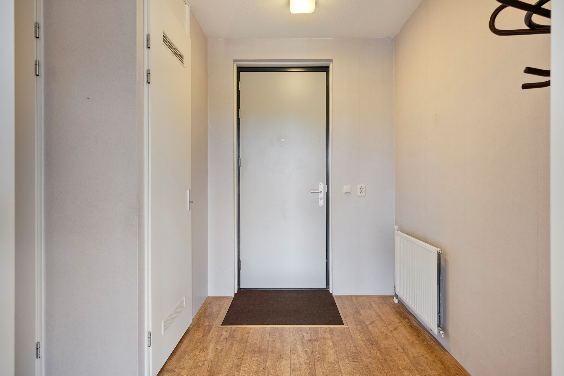 Aangekomen op de tweede verdieping, bereikt u middels de hal de voordeur van het appartement. De entree is afgewerkt met een hoge kwaliteit laminaat vloer, behangen wanden en een spuitwerk plafond. De hal biedt toegang tot de meterkast, woonkamer met open keuken, betegeld toilet met fonteintje, twee slaapkamers, de bijkeuken en de badkamer.