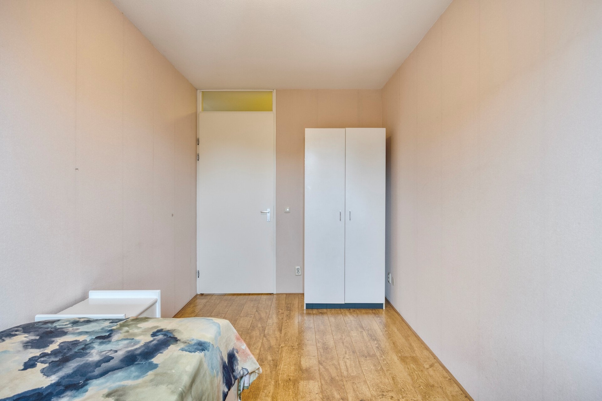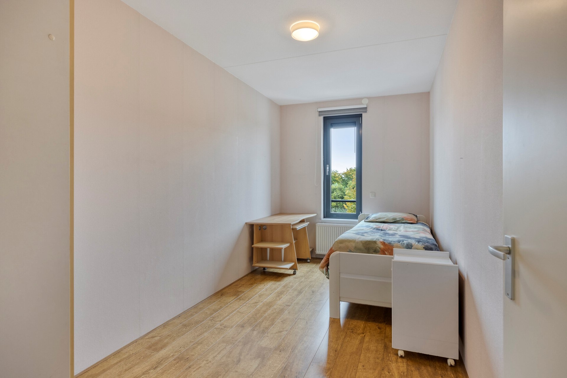Slaapkamer 2 is afgewerkt met een hoge kwaliteit laminaat vloer, behangen wanden en een spuitwerk plafond. De slaapkamer is voorzien van elektrische screens.