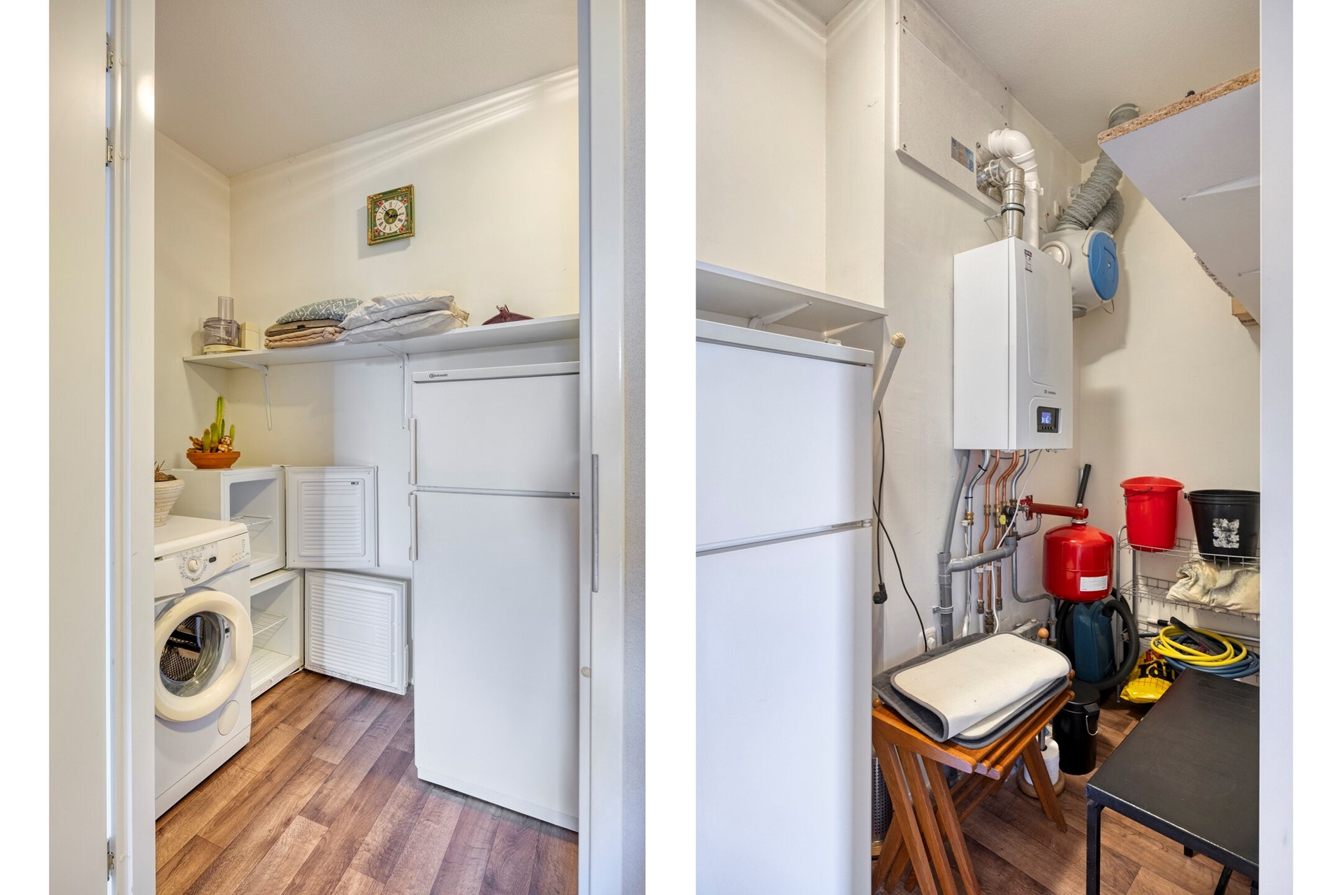 De bijkeuken c.q. wasruimte is afgewerkt met een zeil vloer, gesauste wanden en een spuitwerk plafond. De bijkeuken is voorzien van de aansluiting voor wasmachine- en droger, MV-Unit en CV-Ketel (Remeha, 2025).