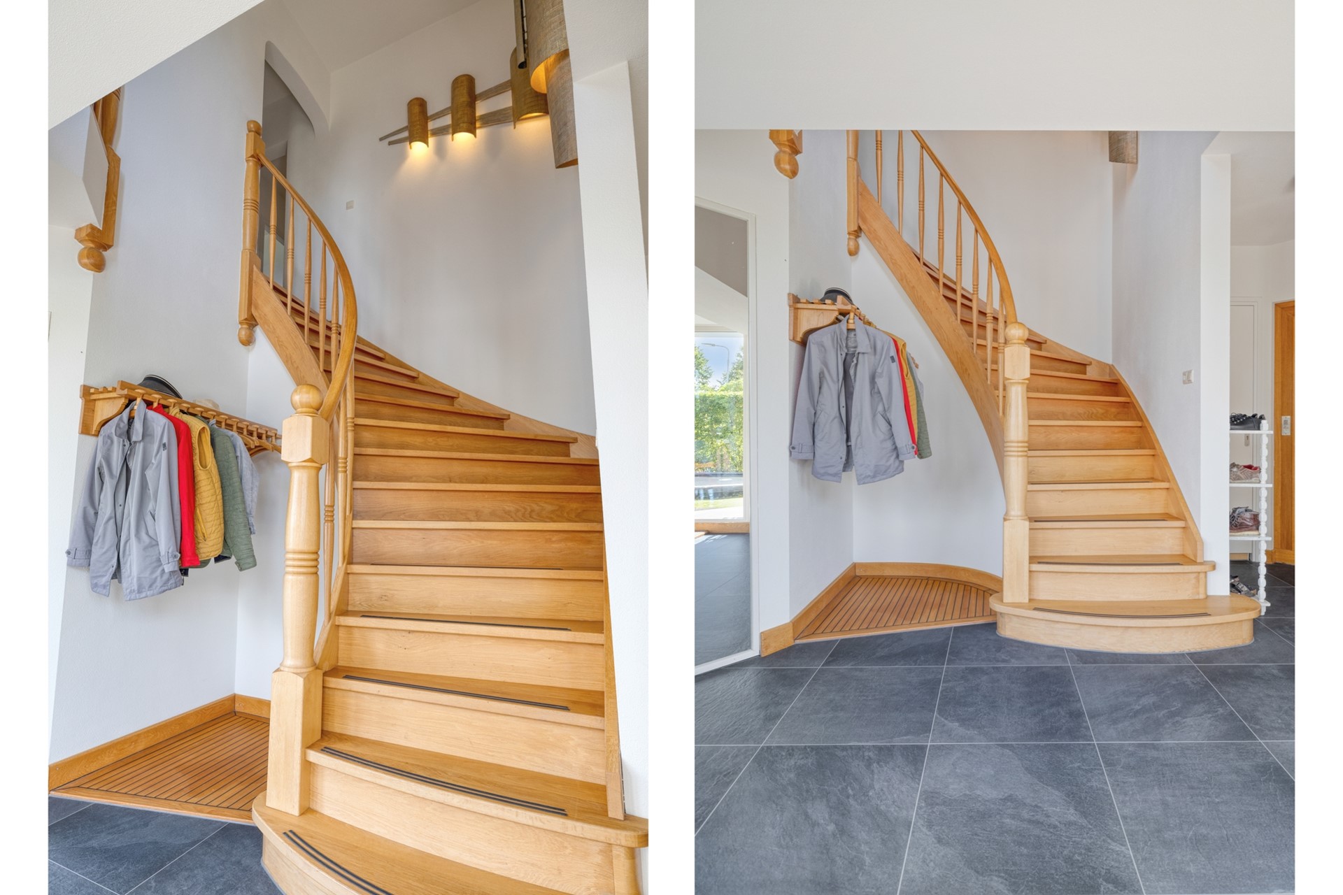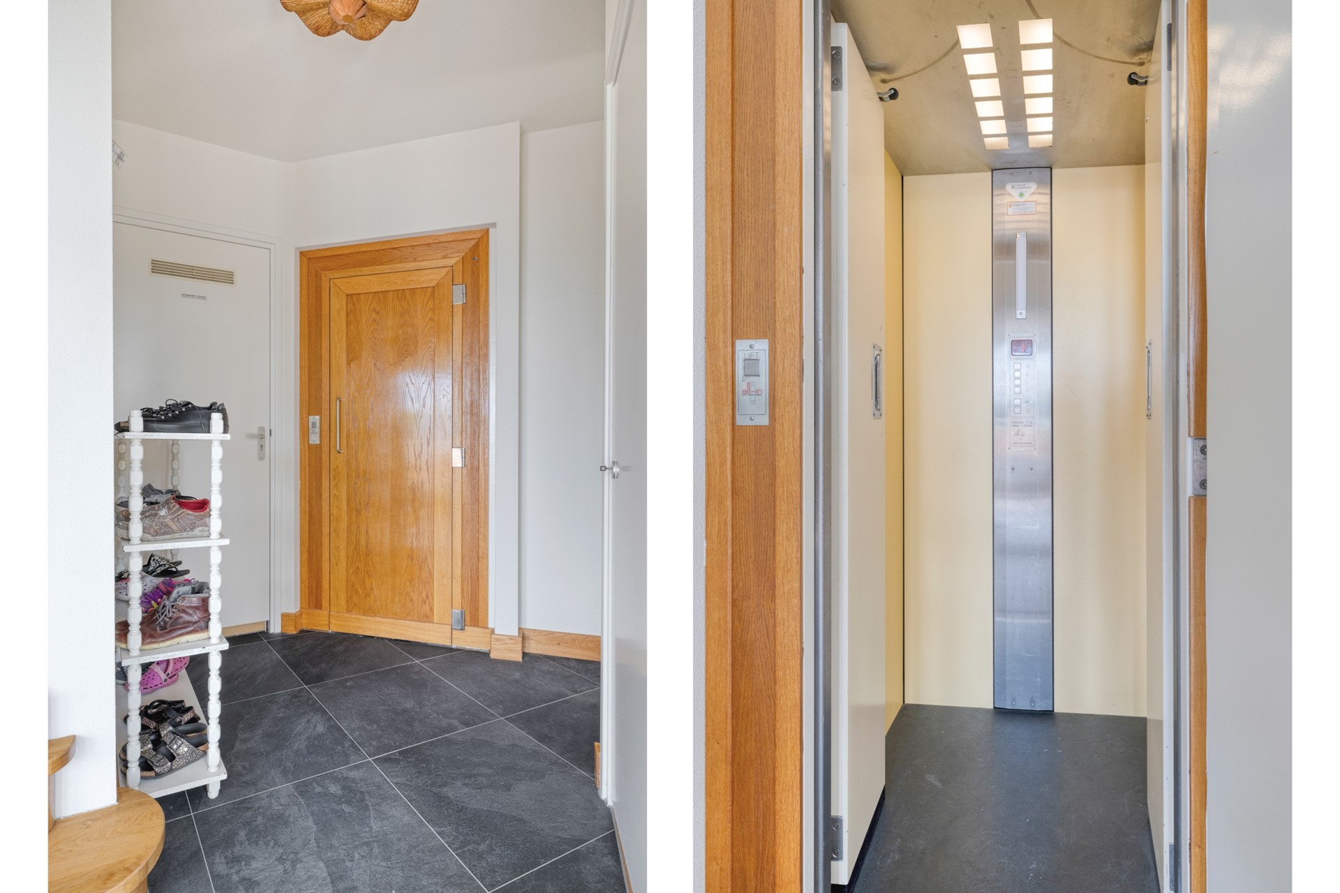 Parkeer jullie auto veilig in de eigen garage op -1 niveau (direct aan het water) of op de privé parkeerplaats op straatniveau. Binnen wacht een ruime hal met een verzorgde afwerking: een betegelde vloer, spuitwerk wanden en een spuitwerk plafond. De hal is voorzien van een meterkast en biedt toegang tot de eerste verdieping middels een vaste trapopgang en een privé lift (enkel voor jullie gebruik, wat een luxe!).