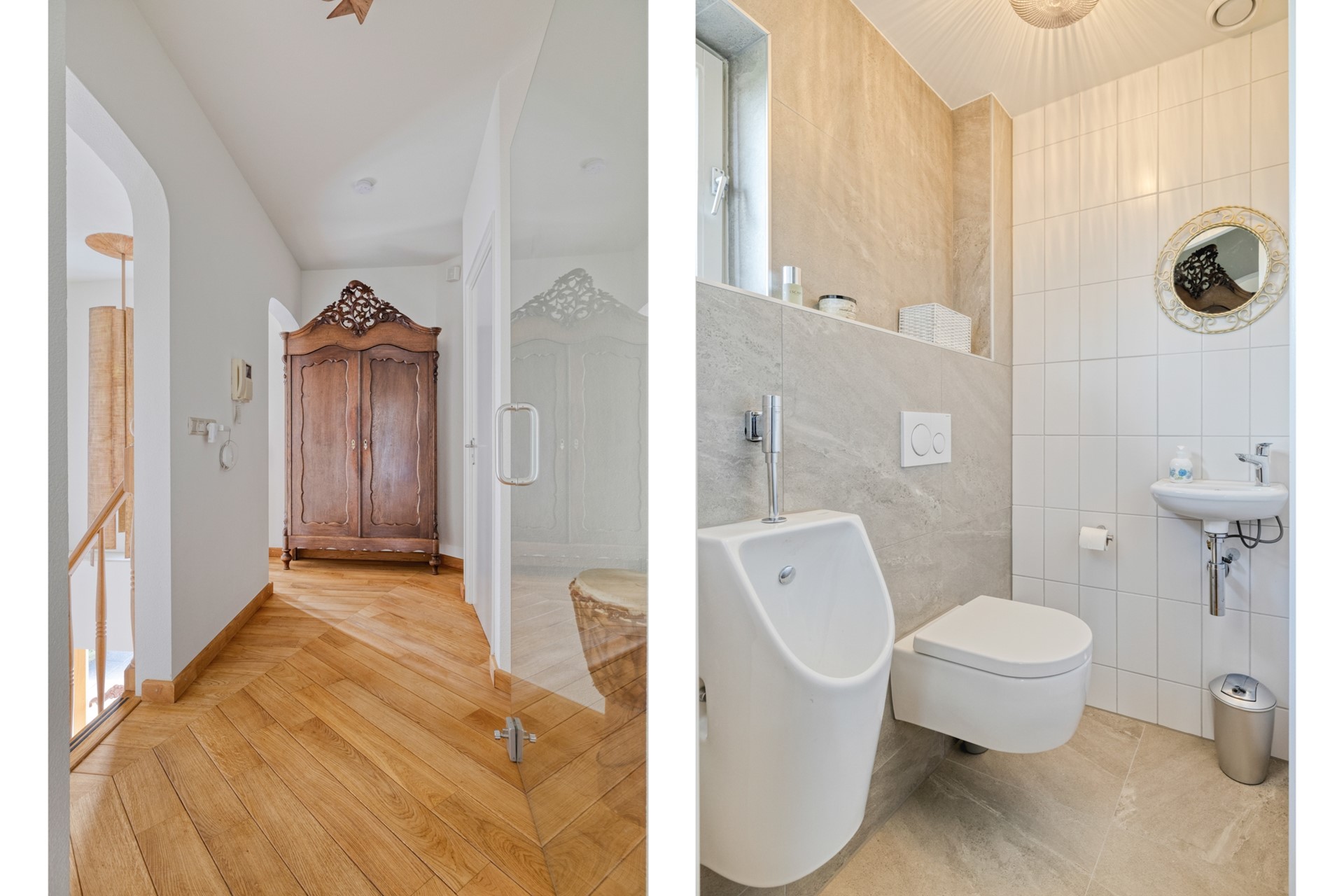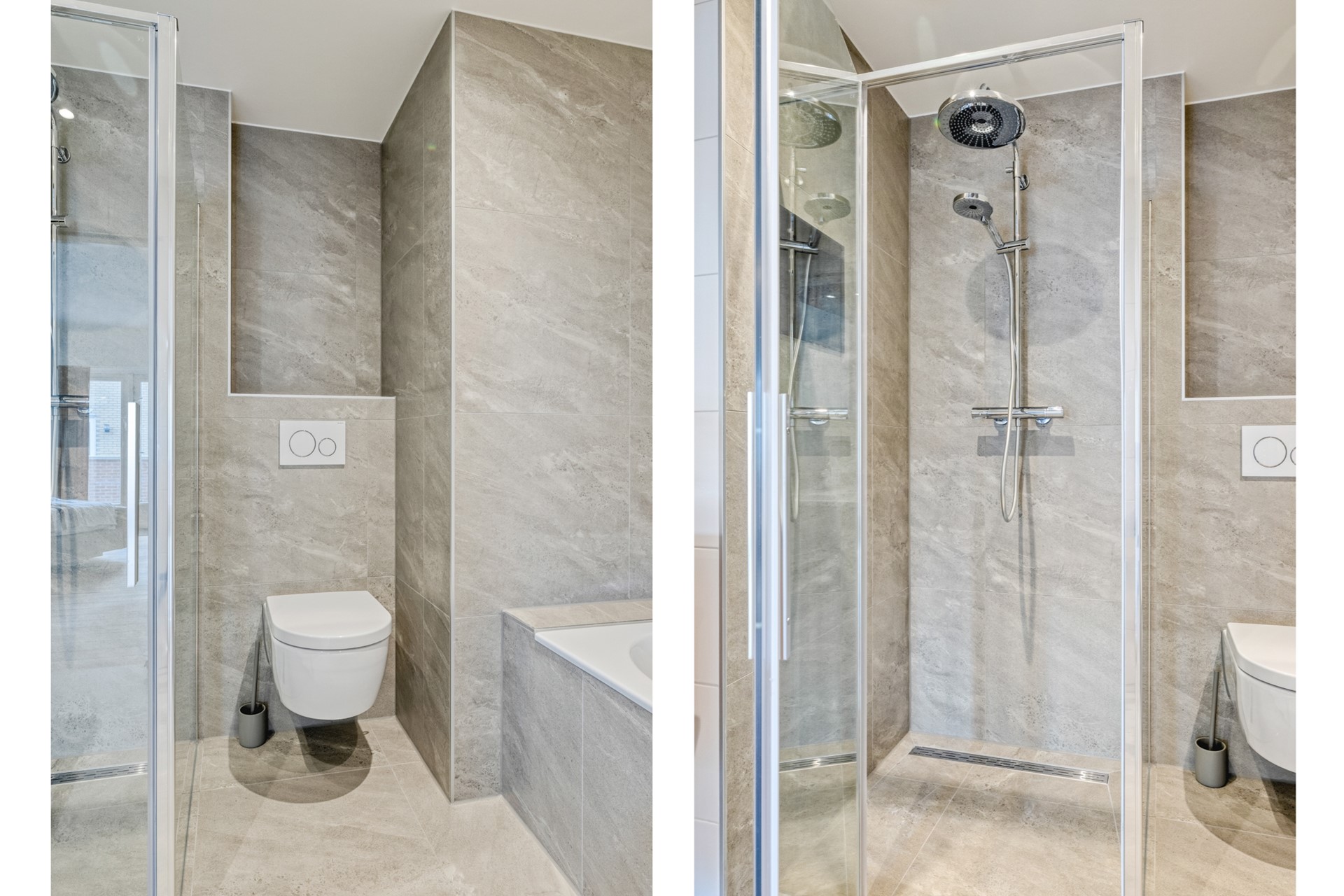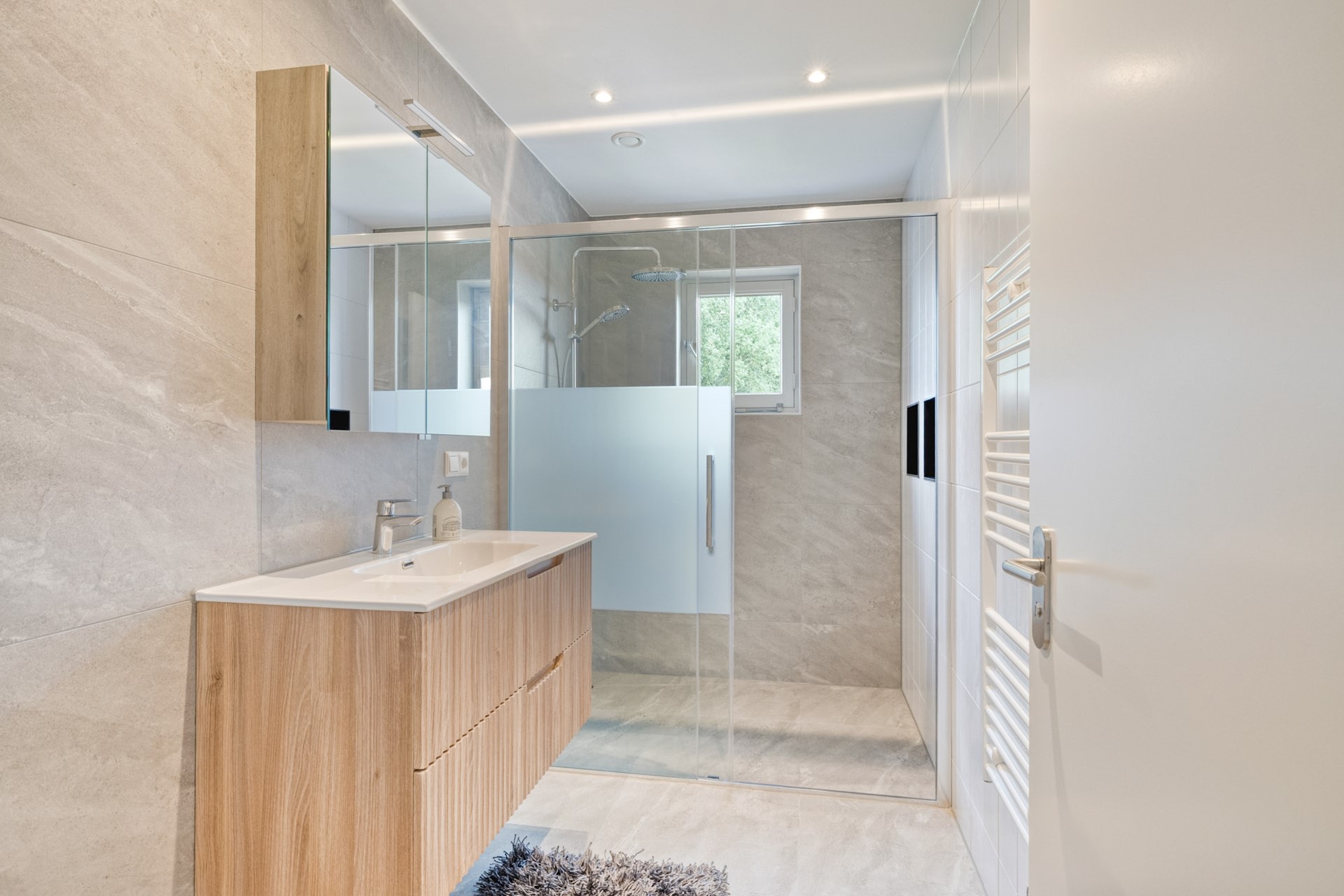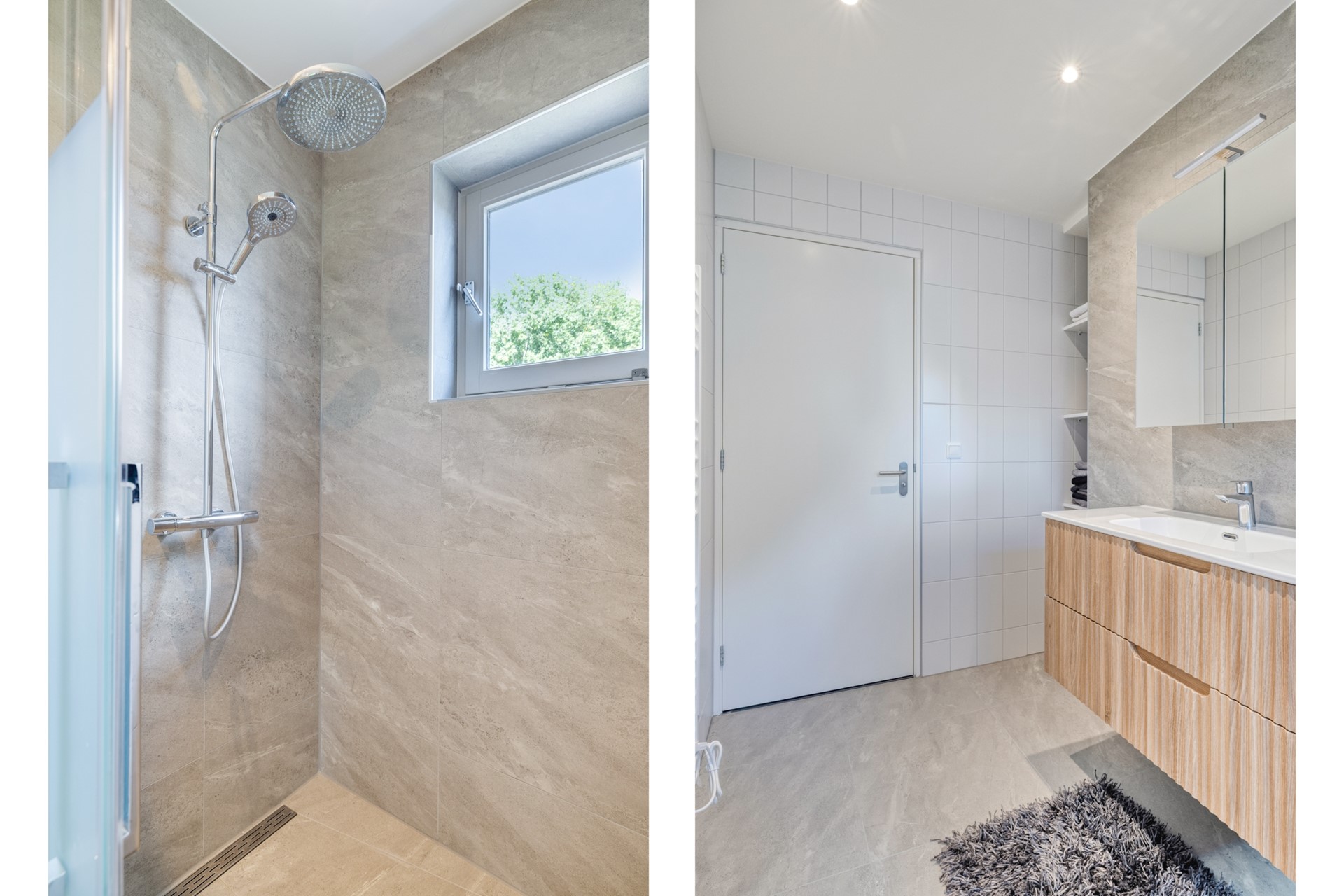 Met twee badkamers is er volop comfort en privacy, ideaal voor gezinnen, gasten of gewoon om even helemaal tot rust te komen. Deze badkamer, volledig vernieuwd in 2025, straalt tijdloze luxe uit. De badkamer is afgewerkt met een betegelde vloer en wanden, en een spuitwerk plafond. De badkamer is voorzien van een wastafelmeubel, riante douche en design radiator.
