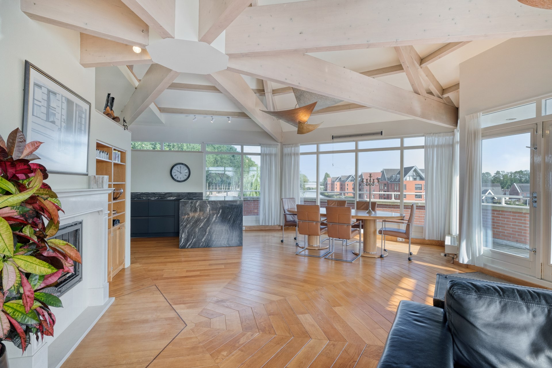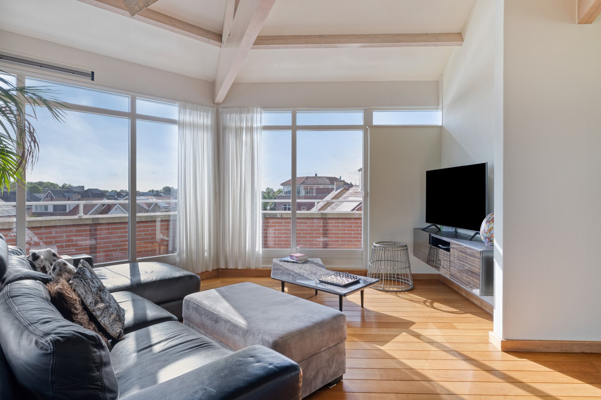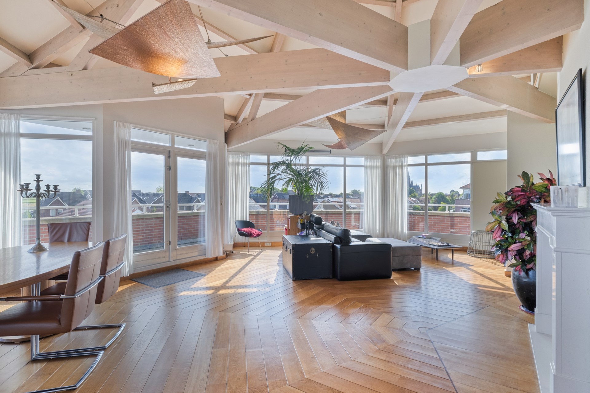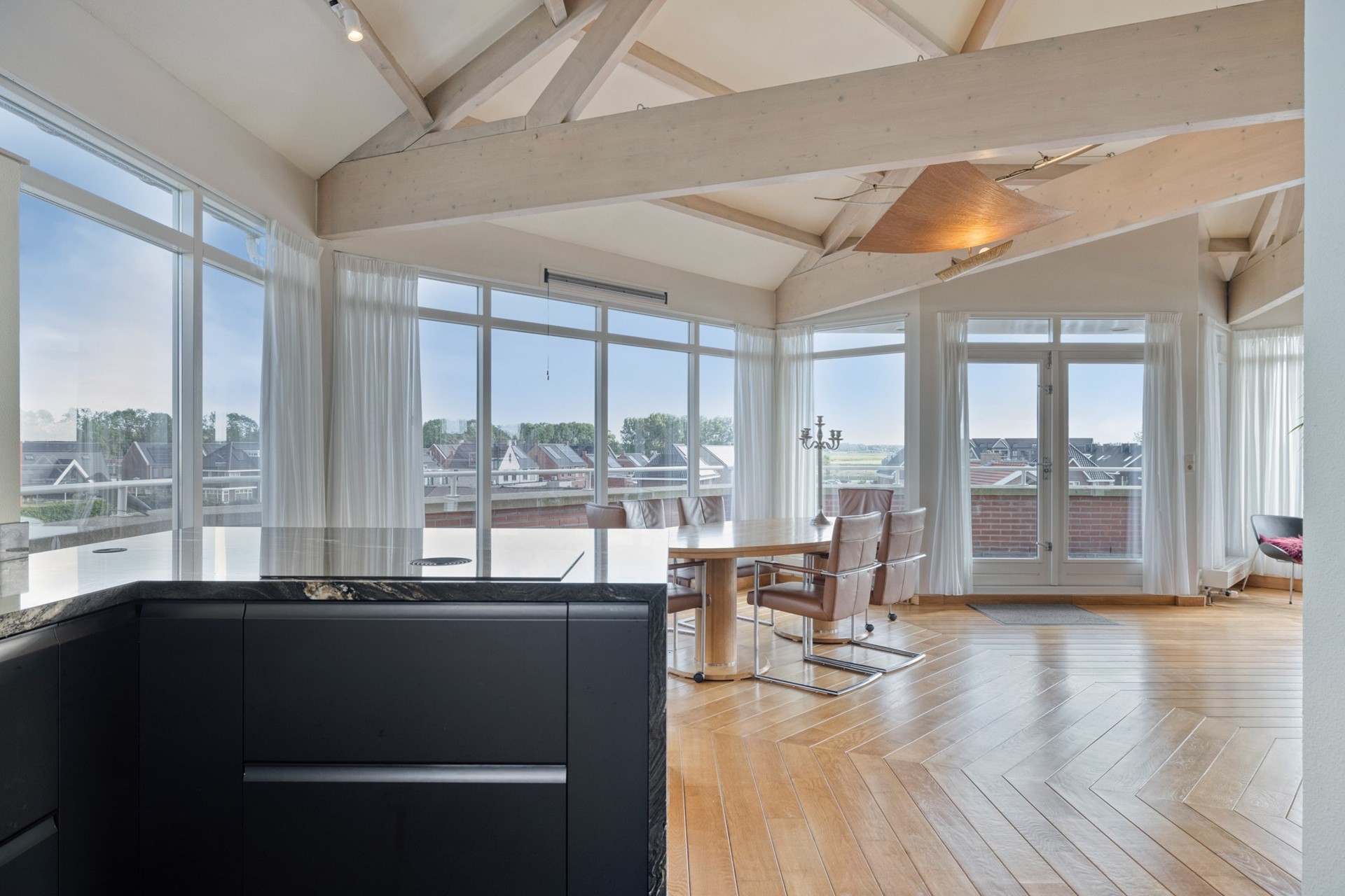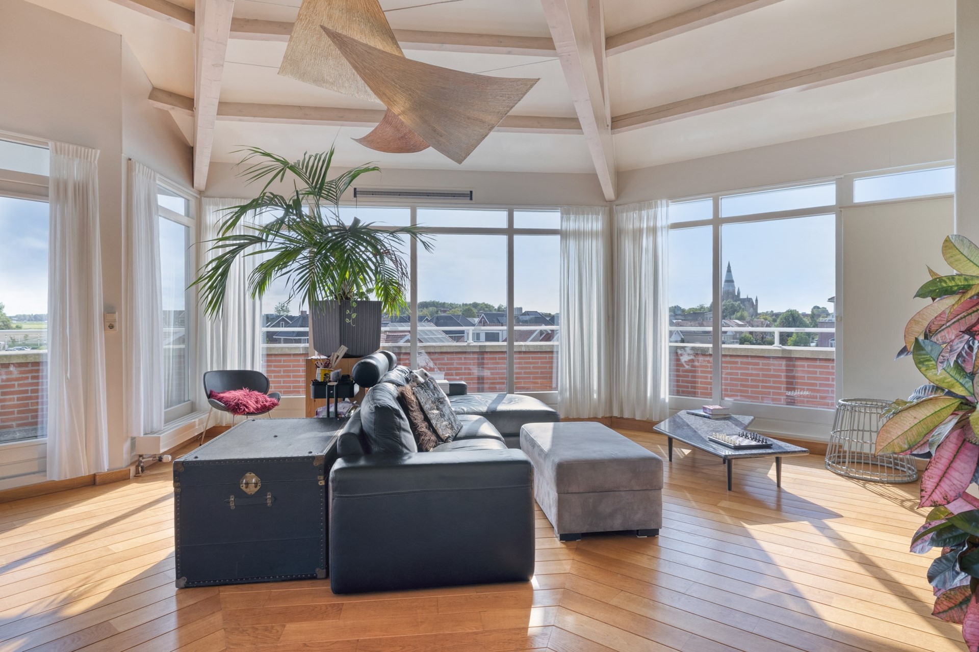 Grote raampartijen laten het daglicht rijkelijk binnenstromen en benadrukken het ware penthouse-gevoel: wonen op niveau met een fantastisch uitzicht. De woonkamer is afgewerkt met een hardhouten vloer, deels spuitwerk en deels glazen wanden en een spuitwerk plafond met karakteristieke balken (een echte eyecatcher). De glazen wanden zorgen voor een overvloed aan licht en een open uitstraling, terwijl de balken juist warmte en charme toevoegen. Een perfecte combinatie van modern en sfeervol.