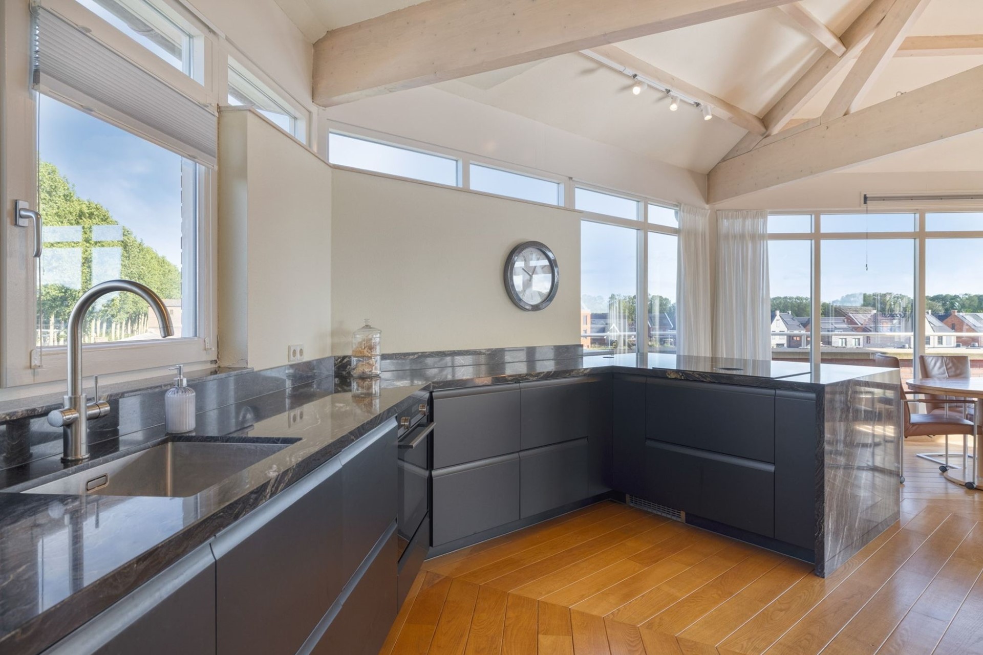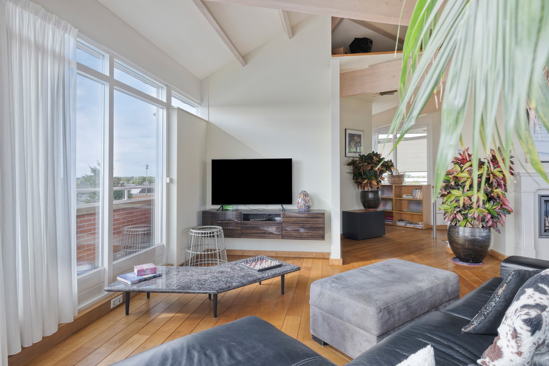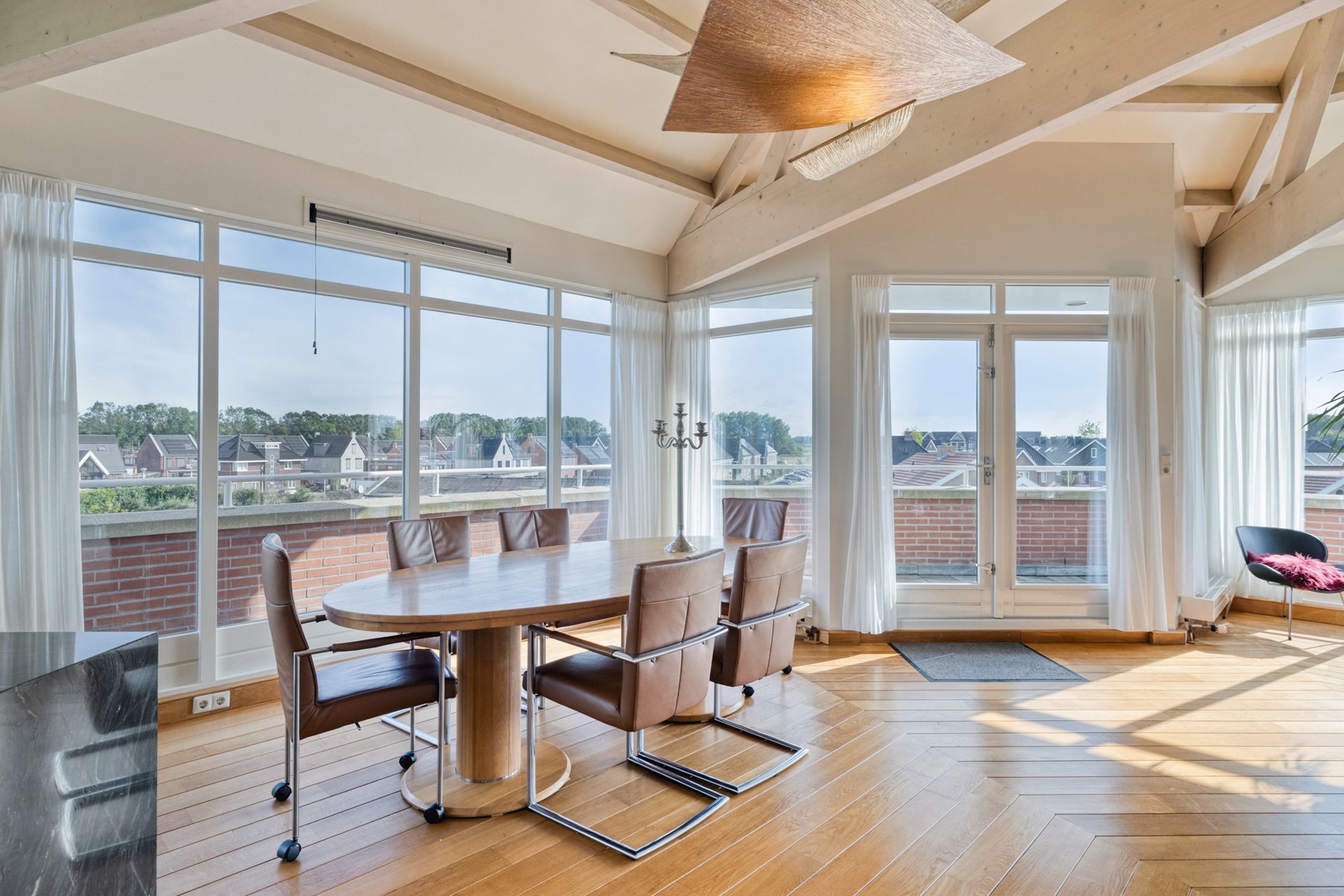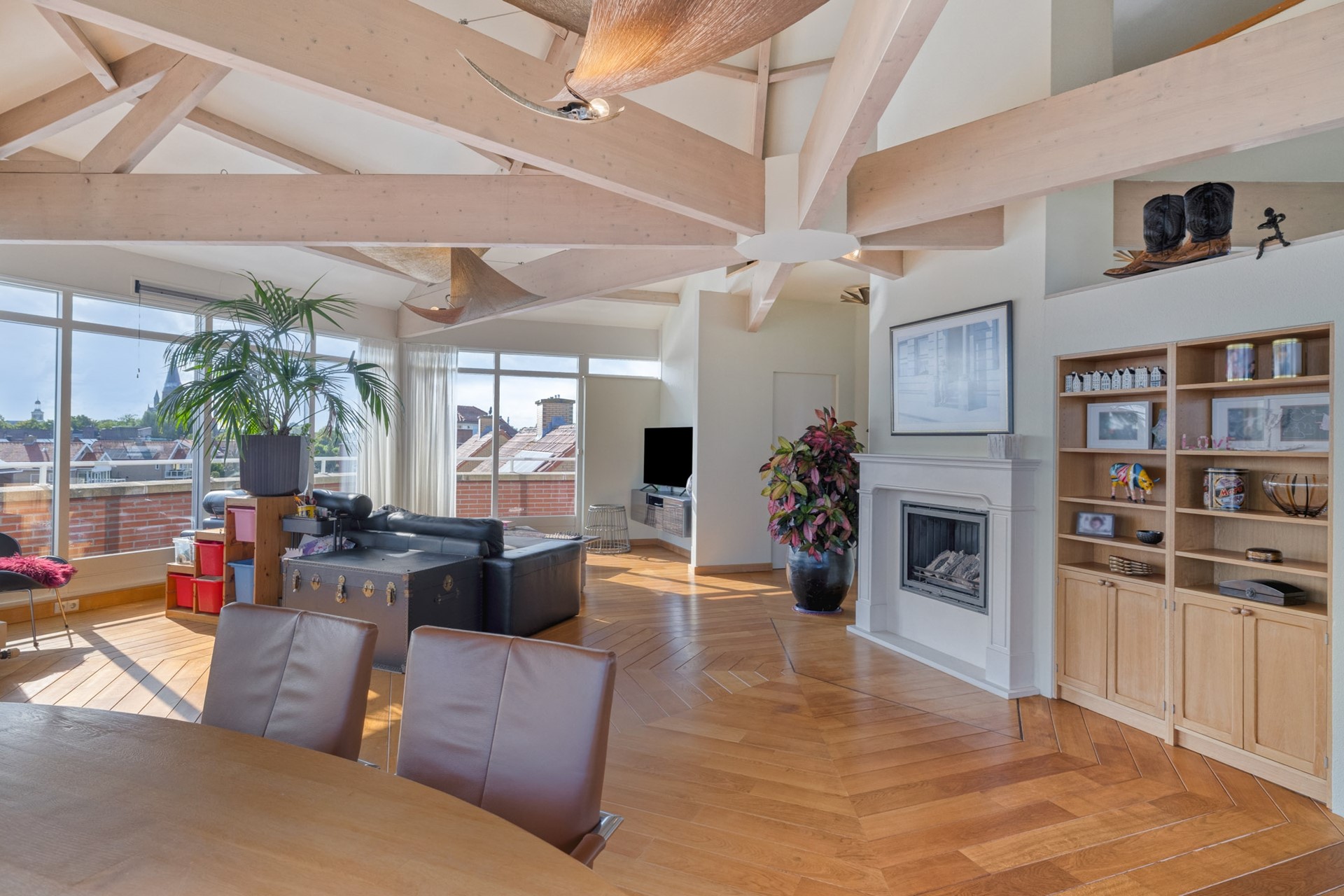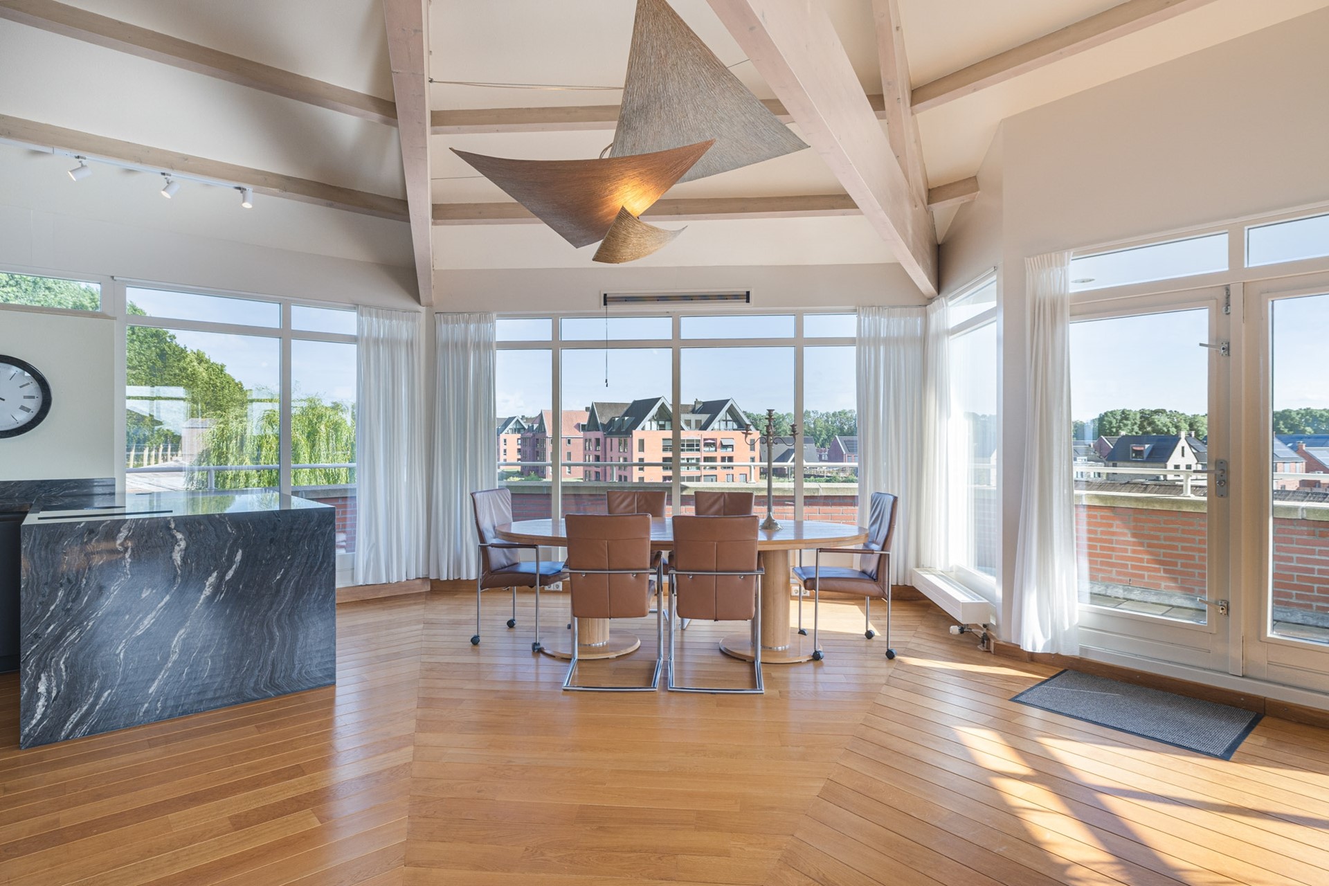 Grote raampartijen laten het daglicht rijkelijk binnenstromen en benadrukken het ware penthouse-gevoel: wonen op niveau met een fantastisch uitzicht. De woonkamer is afgewerkt met een hardhouten vloer, deels spuitwerk en deels glazen wanden en een spuitwerk plafond met karakteristieke balken (een echte eyecatcher). De glazen wanden zorgen voor een overvloed aan licht en een open uitstraling, terwijl de balken juist warmte en charme toevoegen. Een perfecte combinatie van modern en sfeervol.