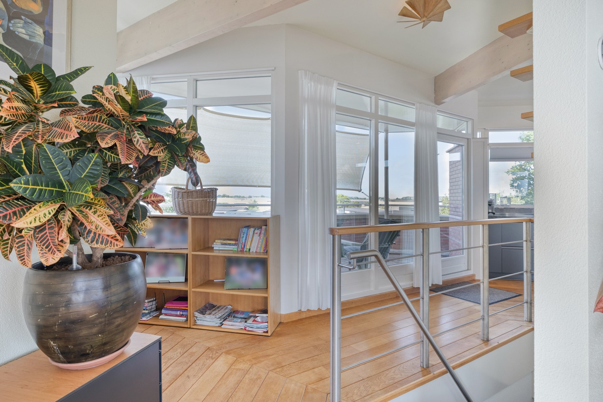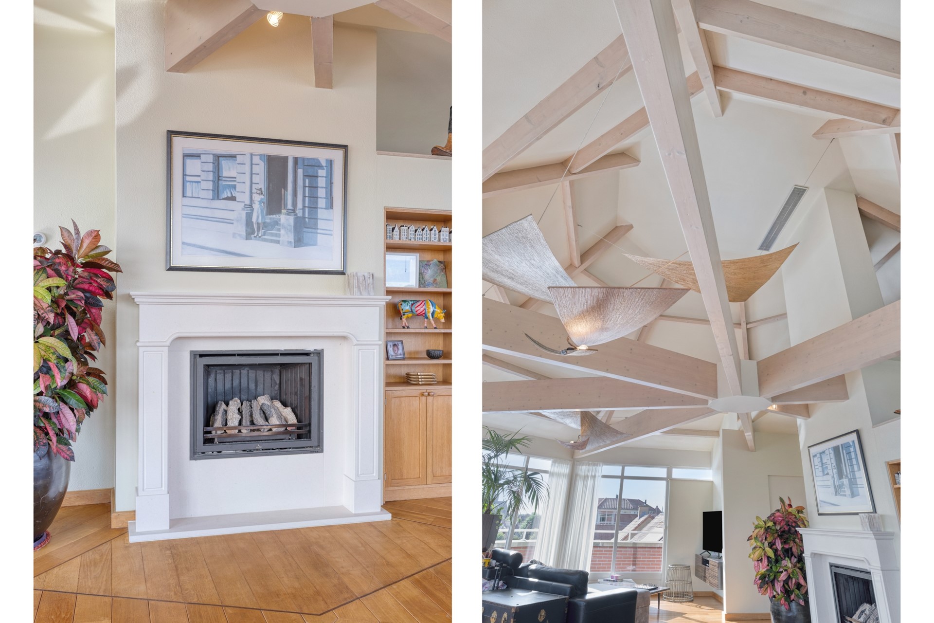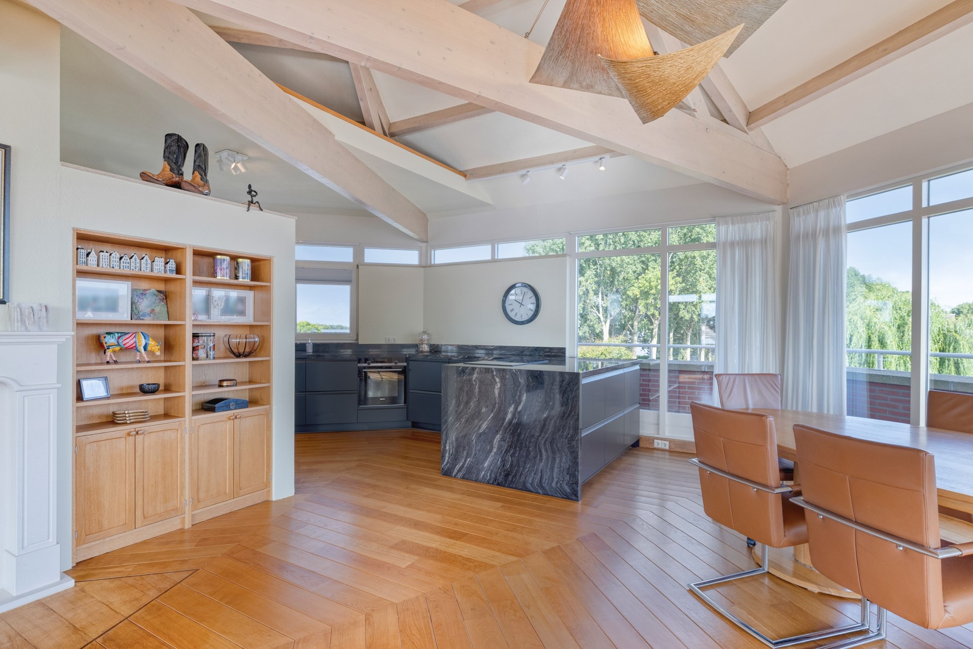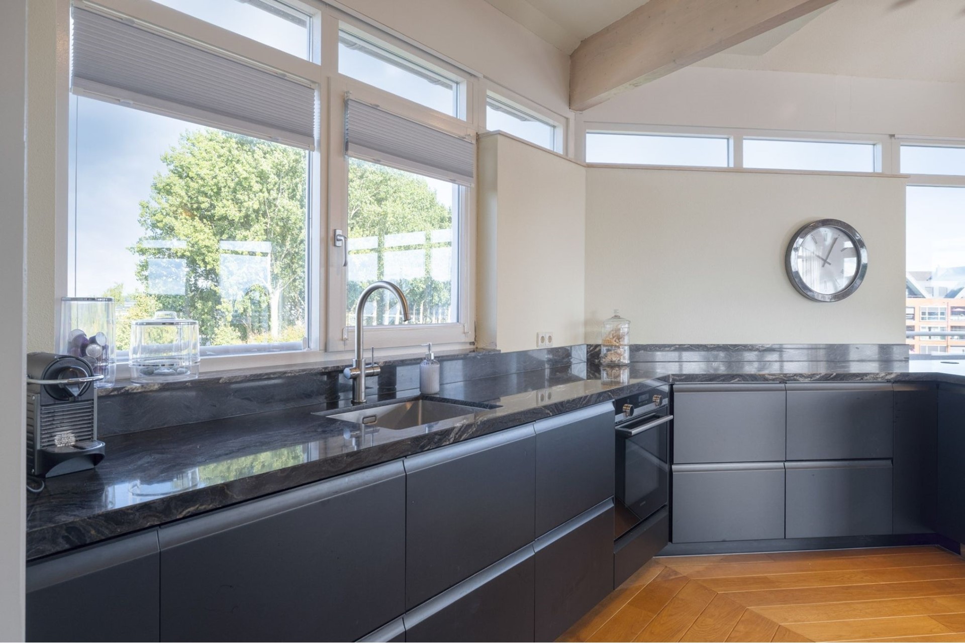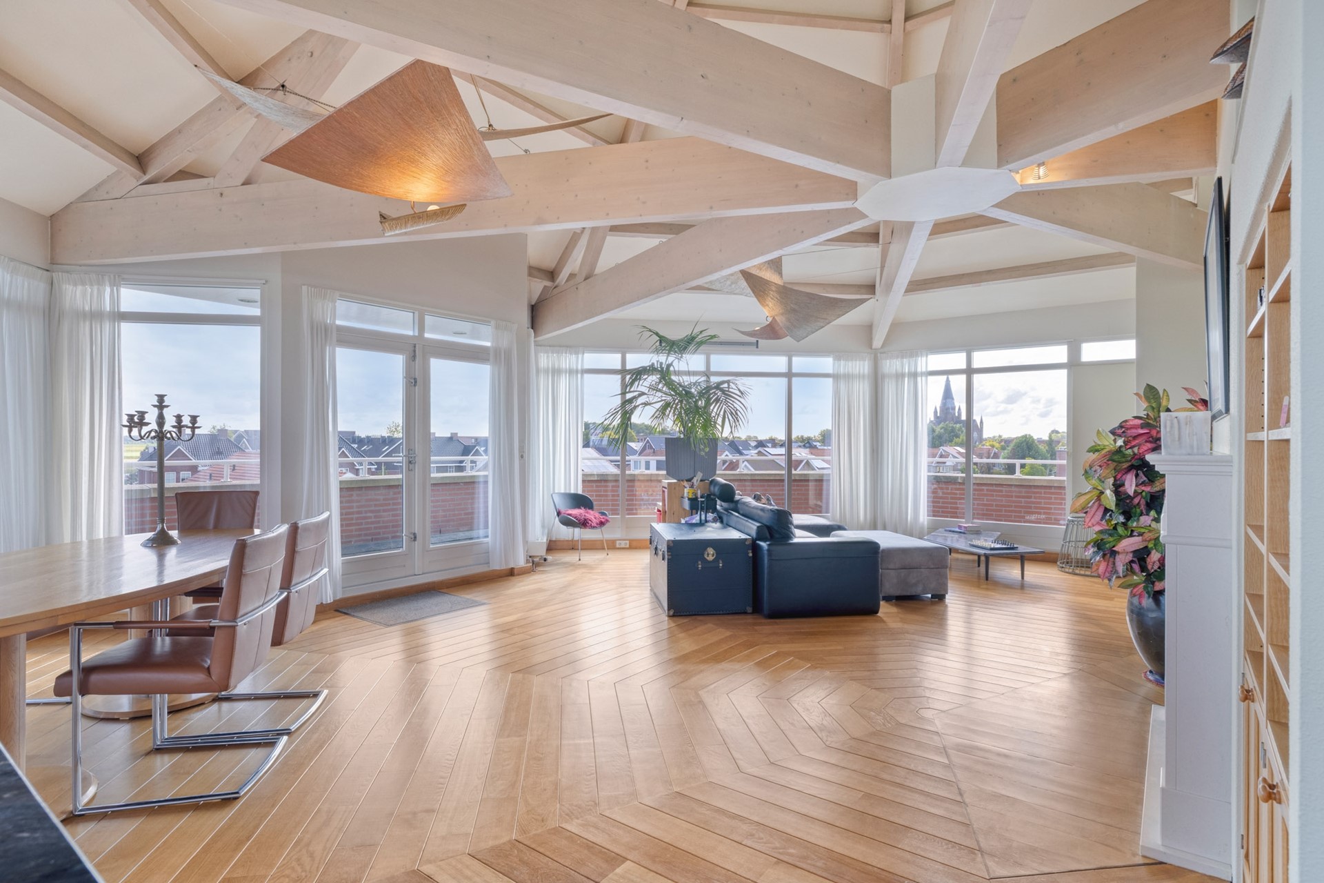 Grote raampartijen laten het daglicht rijkelijk binnenstromen en benadrukken het ware penthouse-gevoel: wonen op niveau met een fantastisch uitzicht. De woonkamer is afgewerkt met een hardhouten vloer, deels spuitwerk en deels glazen wanden en een spuitwerk plafond met karakteristieke balken (een echte eyecatcher). De glazen wanden zorgen voor een overvloed aan licht en een open uitstraling, terwijl de balken juist warmte en charme toevoegen. Een perfecte combinatie van modern en sfeervol.