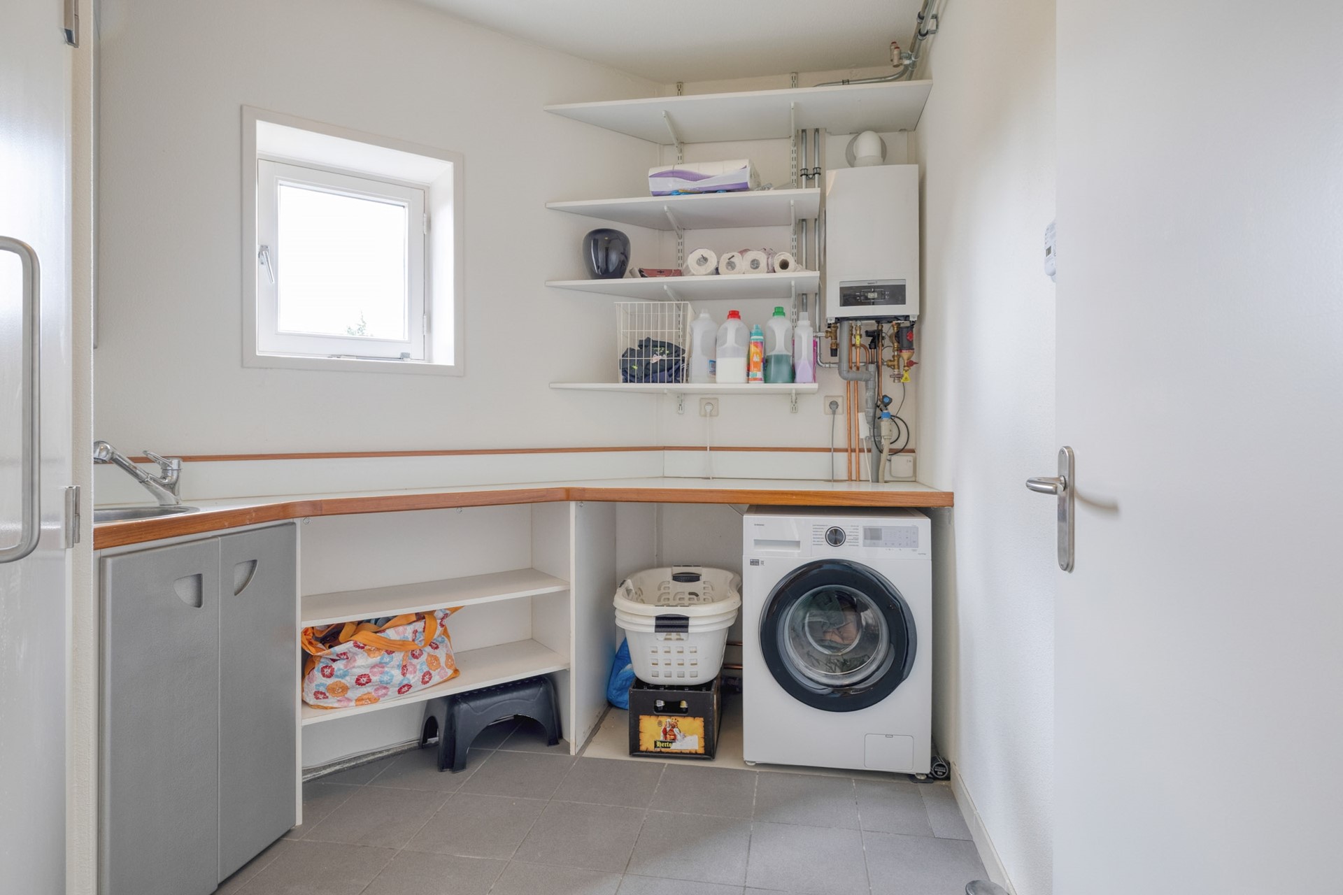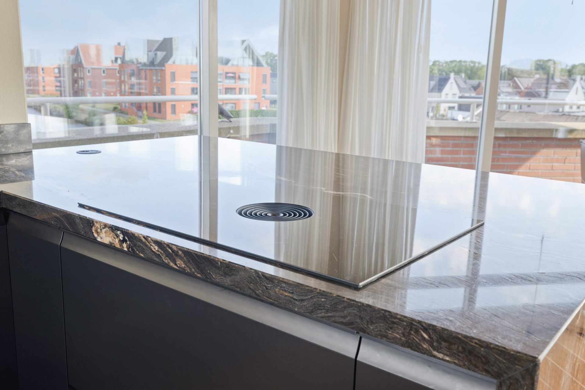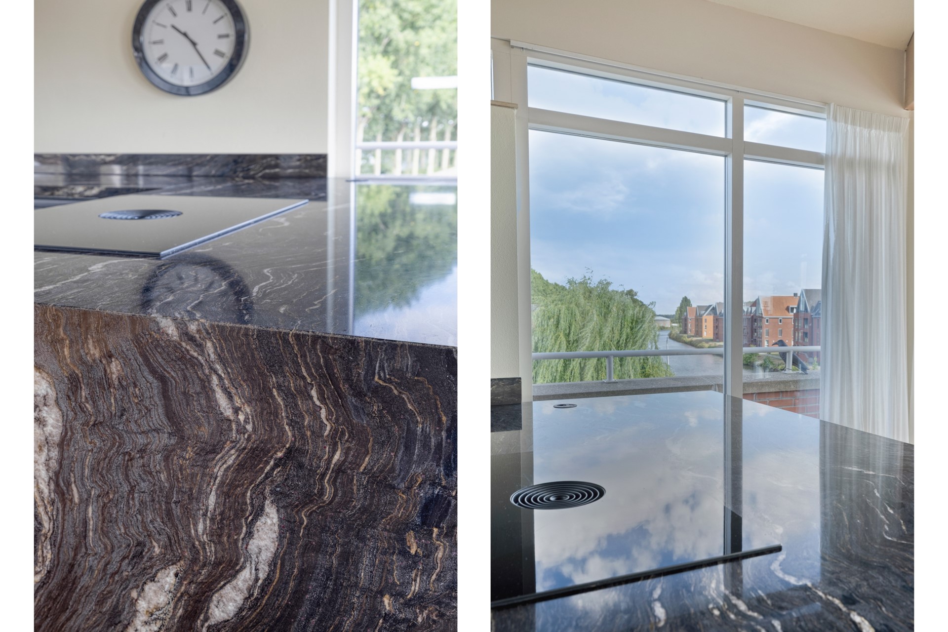 Wauw, wat een prachtige keuken! Volledig vernieuwd in 2025 en uitgevoerd met een stijlvol natuurstenen werkblad. Deze moderne leefkeuken is van alle gemakken voorzien zoals o.a.: een combi-oven, een inductiekookplaat met geïntegreerde afzuiging, een vaatwasser en een royale spoelunit. Terwijl er gekookt wordt, valt het oog telkens weer op het schitterende uitzicht over het water – koken wordt hier een beleving op zich.