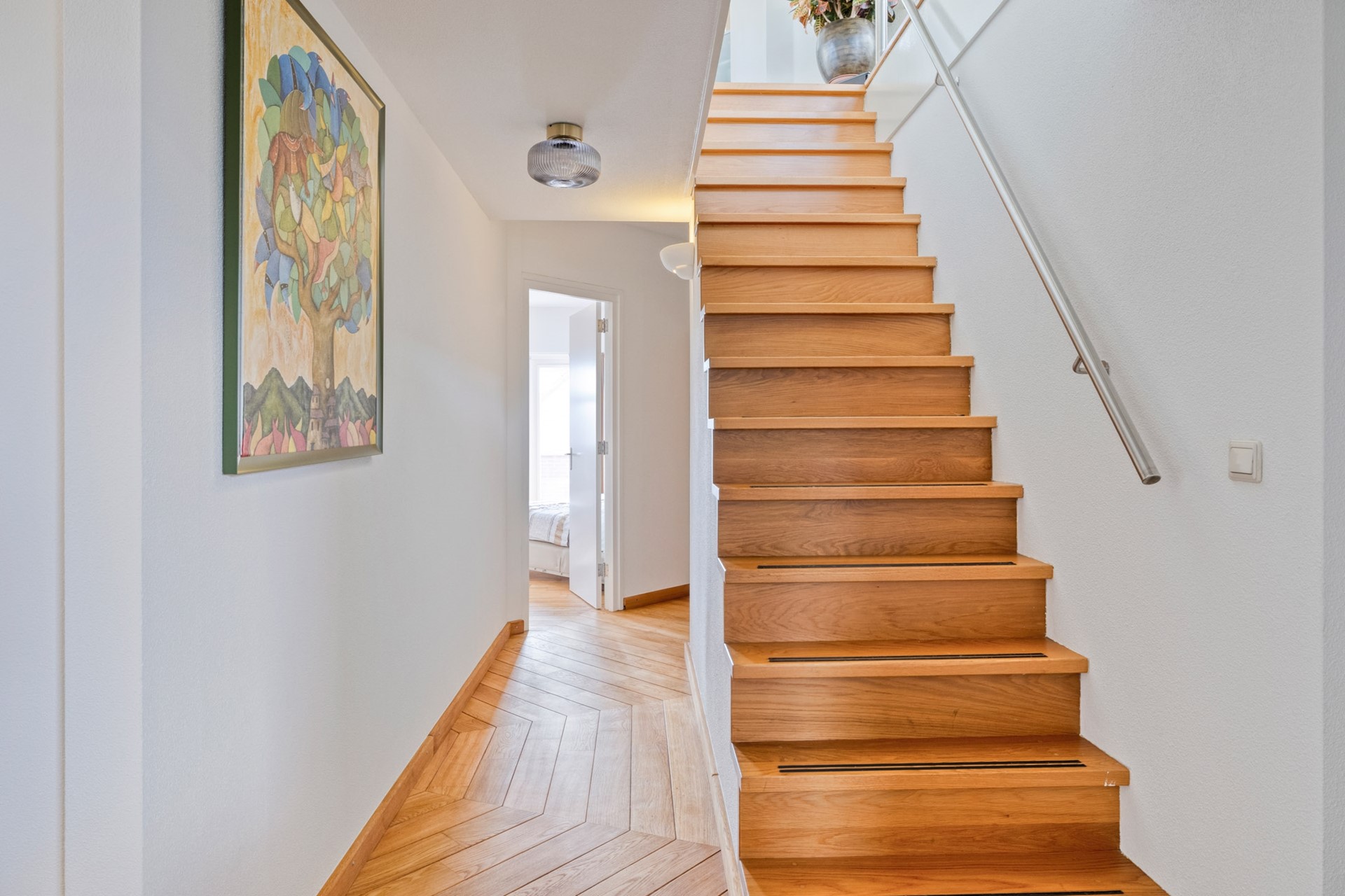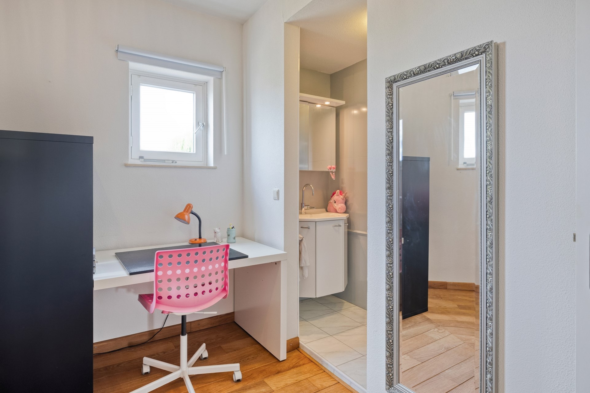 De vierde slaapkamer is afgewerkt met een hardhouten vloer, gestucte wanden en een gestuct plafond. De slaapkamer beschikt over een inbouwkast. Vanuit deze kamer is er een prachtig uitzicht over het water, een rustgevend en sfeervol decor dat elke dag een ontspannen start geeft.