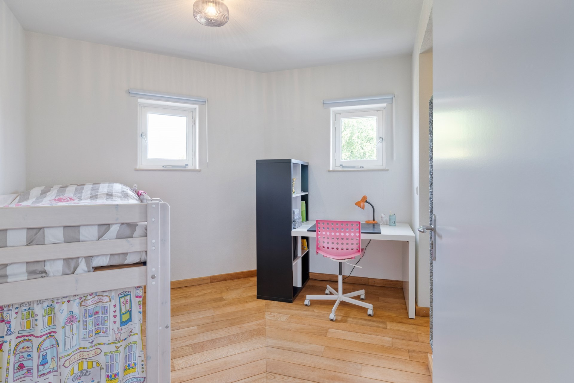 De tweede slaapkamer is afgewerkt met een hardhouten vloer, spuitwerk wanden en een spuitwerk plafond. De slaapkamer beschikt over een wastafelmeubel.