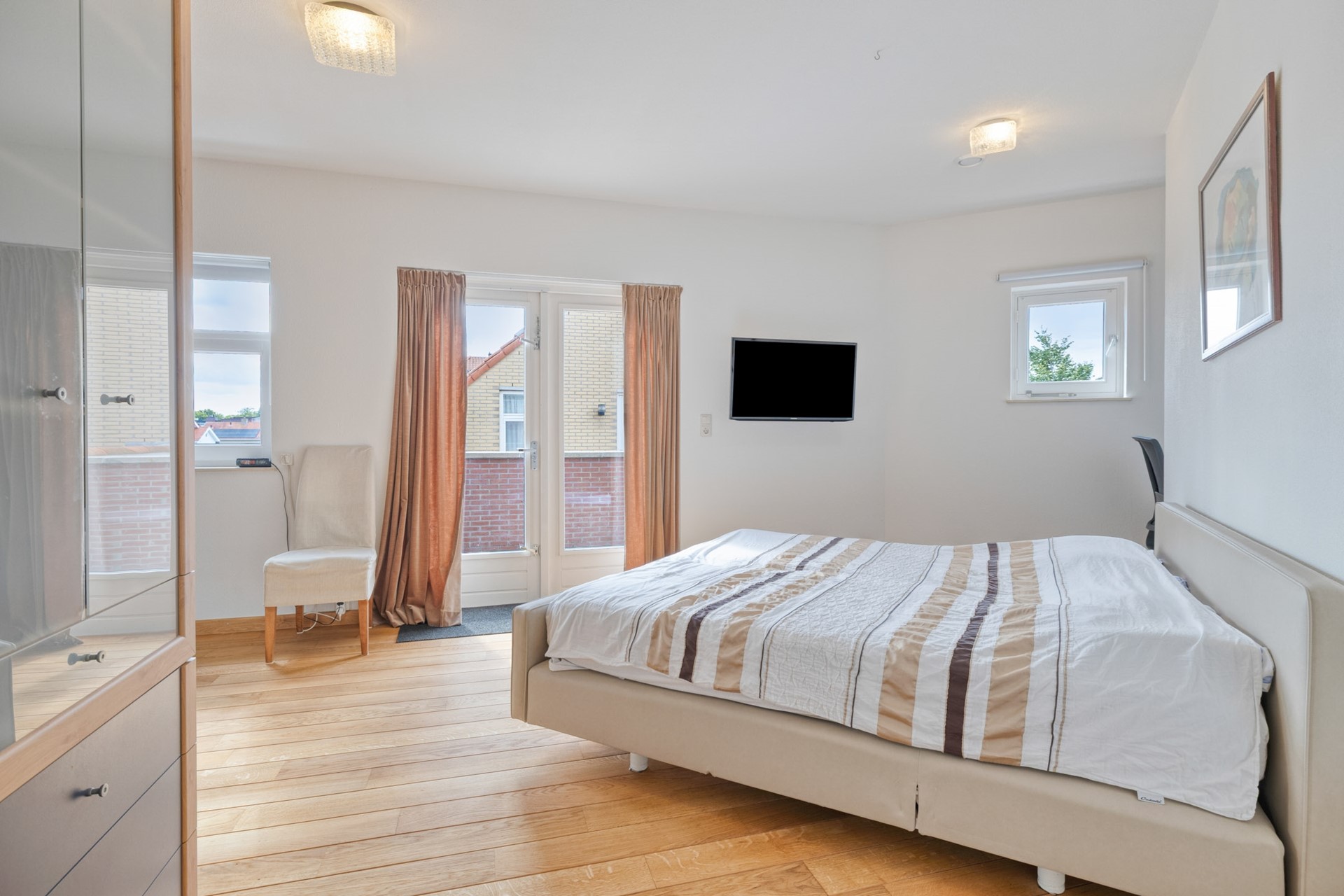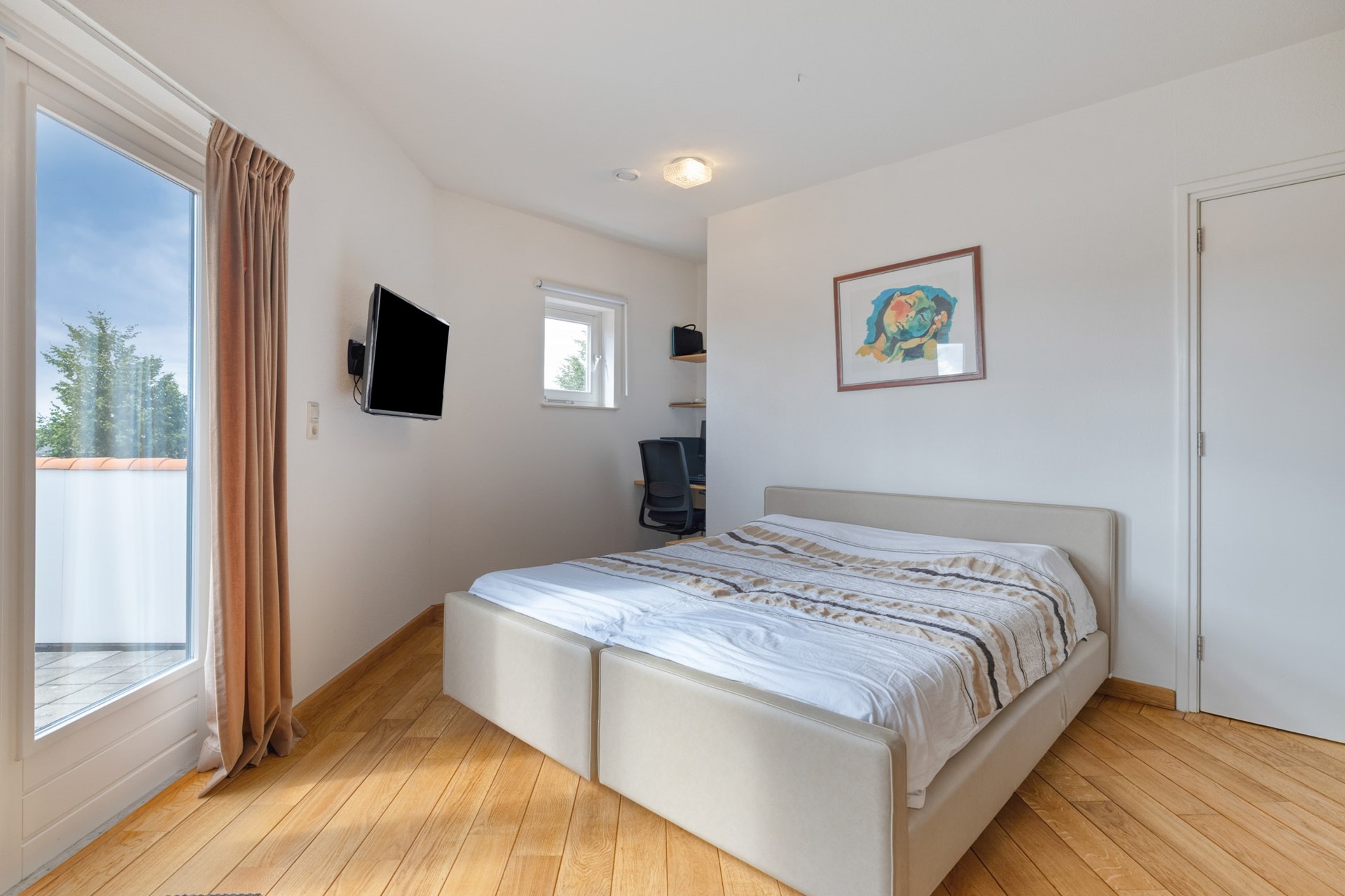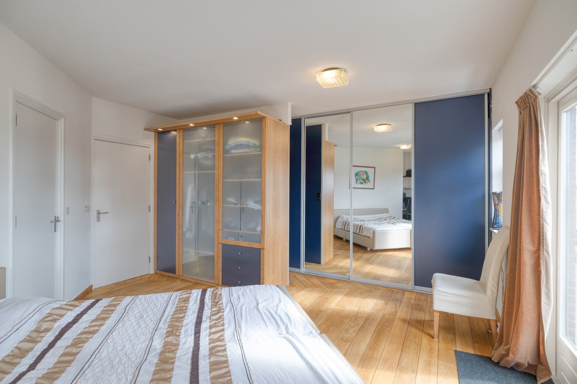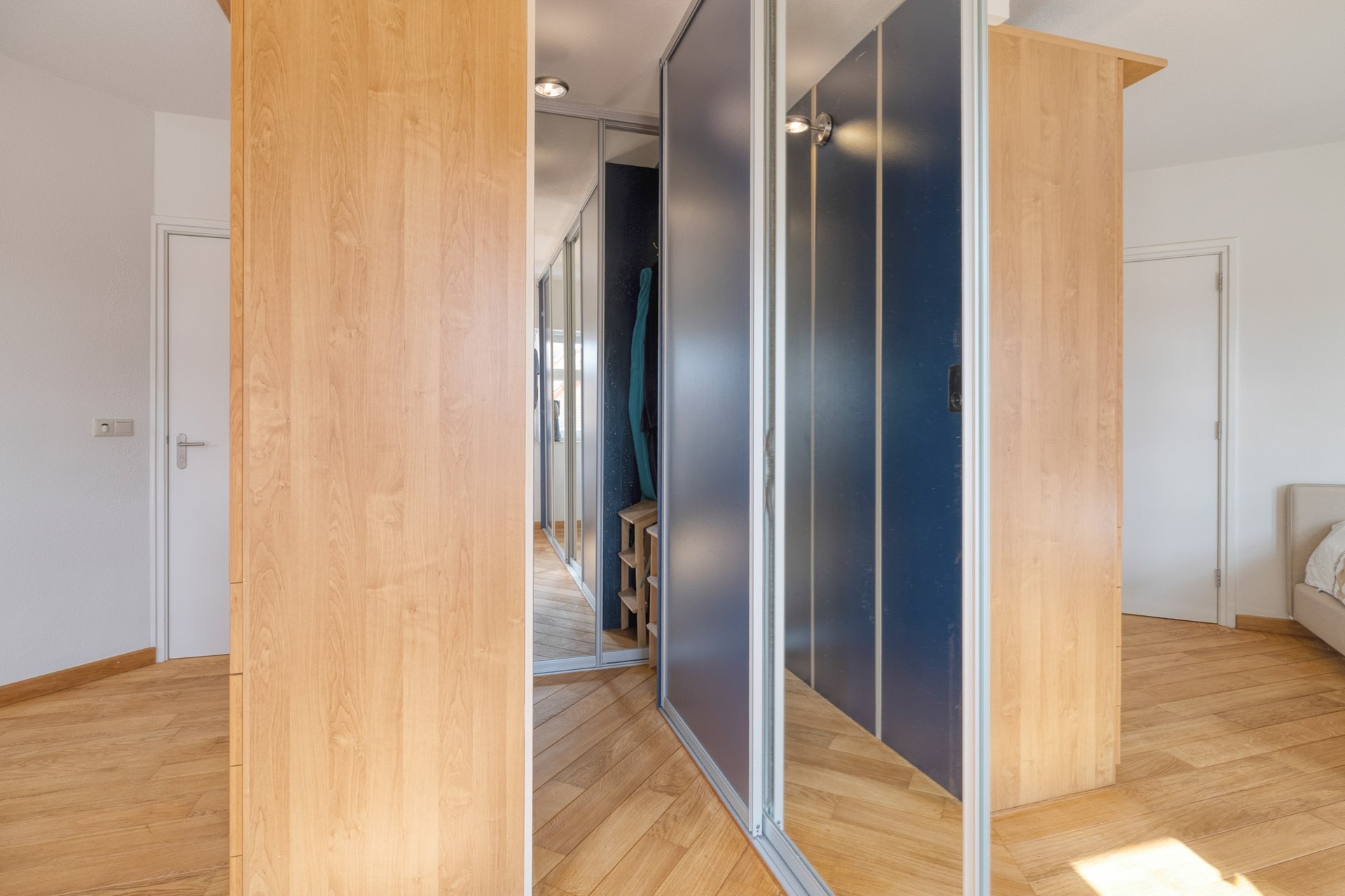 De eerste slaapkamer is afgewerkt met een hardhouten vloer, spuitwerk wanden en een spuitwerk plafond. Naast de mogelijkheid om te slapen is er tevens gedacht aan uw kleding, met de daarvoor gerealiseerde inloopkast. De slaapkamer biedt toegang tot het dakterras en de moderne ensuite badkamer uit 2025.