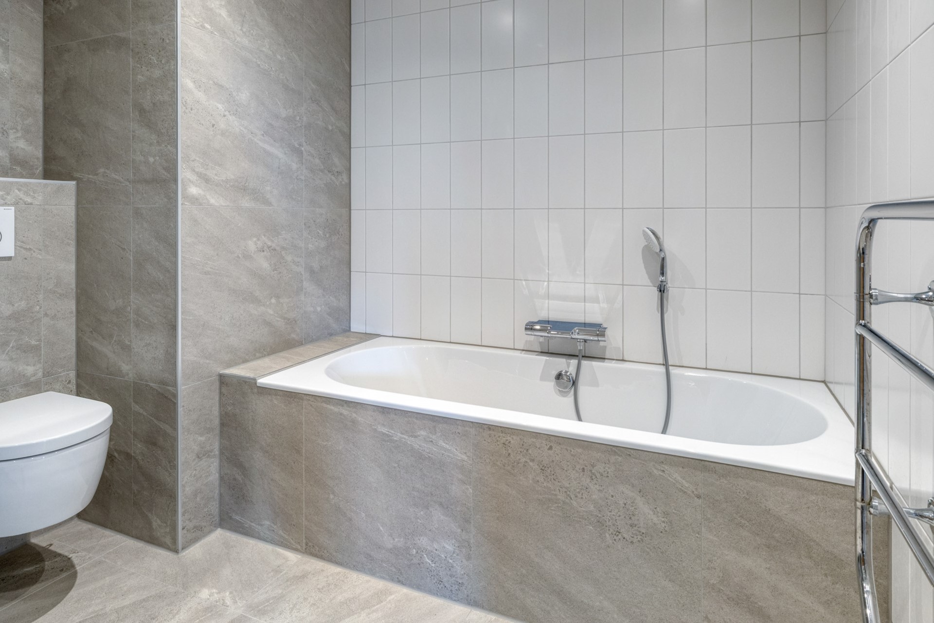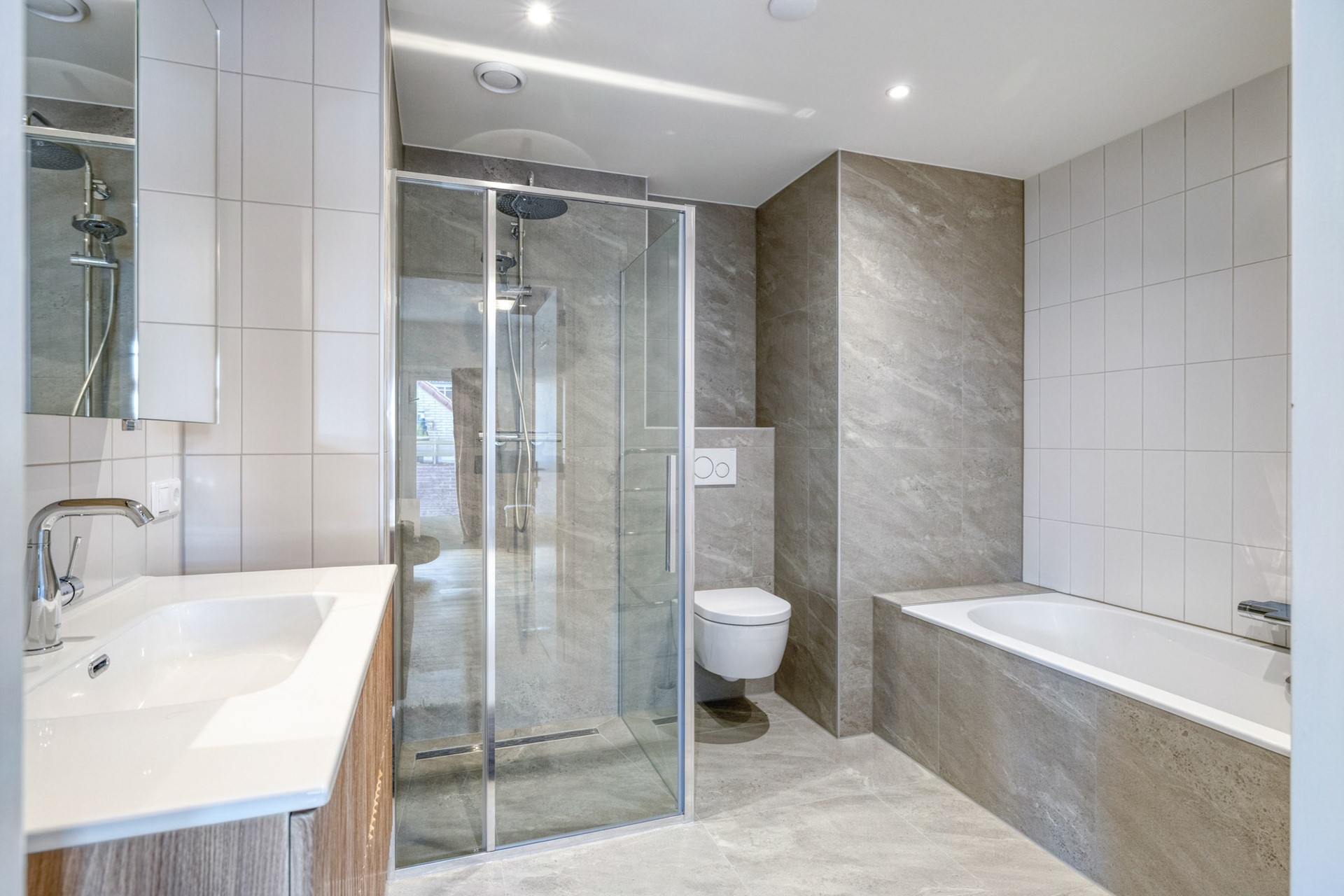 De badkamer is in 2025 volledig vernieuwd en straalt moderne luxe uit. De luxe badkamer is afgewerkt met een betegelde vloer, betegelde wanden en een gestuct plafond. De badkamer is voorzien van een heerlijk ligbad, douche, toilet en wastafelmeubel. Hier komt wellness en woongenot samen.