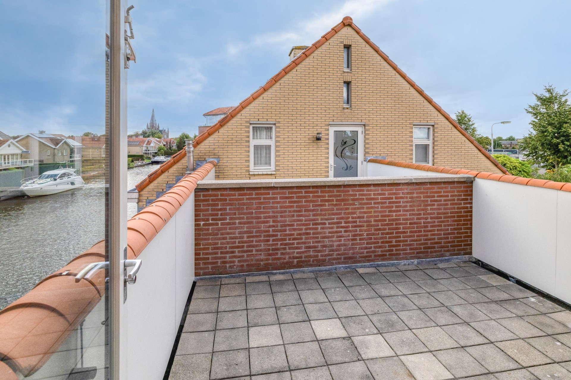 Vanuit de slaapkamer lopen jullie het aangrenzende dakterras op om 's ochtends wakker te worden met een uitzicht over het water. De tweede slaapkamer is afgewerkt met een hardhouten vloer, spuitwerk wanden en een spuitwerk plafond. De slaapkamer beschikt over een wastafelmeubel.