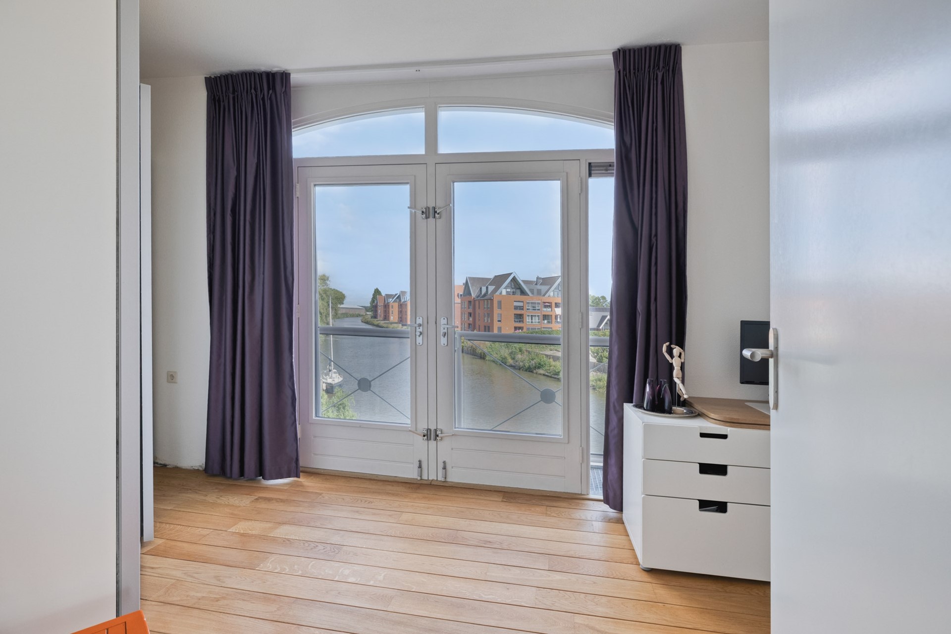 De derde slaapkamer is afgewerkt met een hardhouten vloer, gestucte wanden en een gestuct plafond. Hier kan dagelijks genoten worden van een prachtig uitzicht over de haven van Steenbergen!