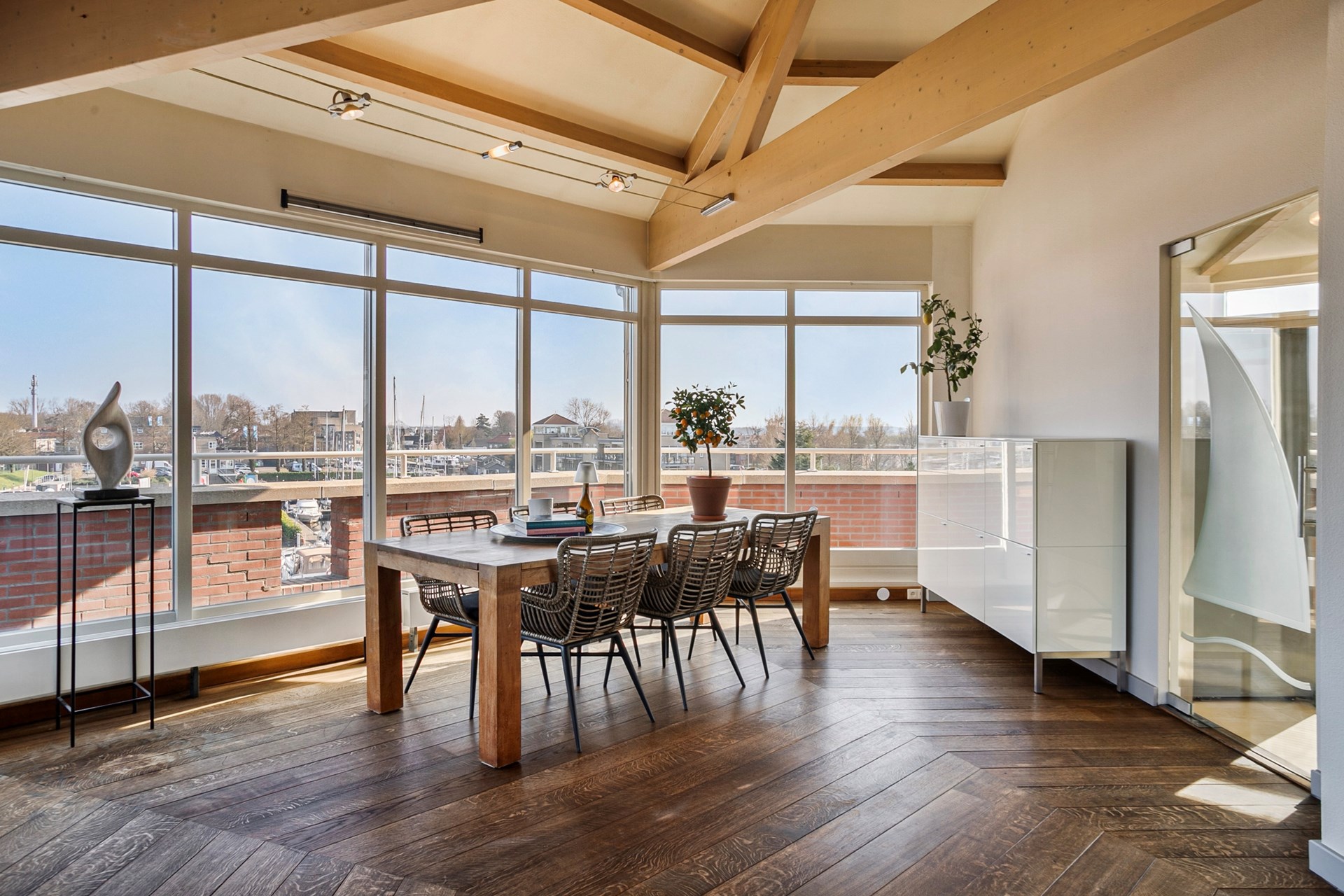 Dineren met uitzicht! De eetkamer met riante raampartijen biedt een spectaculair decor voor elke gelegenheid. Vanuit de eet-/woonkamer is er toegang tot het balkon, waar dagelijks genoten kan worden van het rustgevende uitzicht op voorbijvarende bootjes.