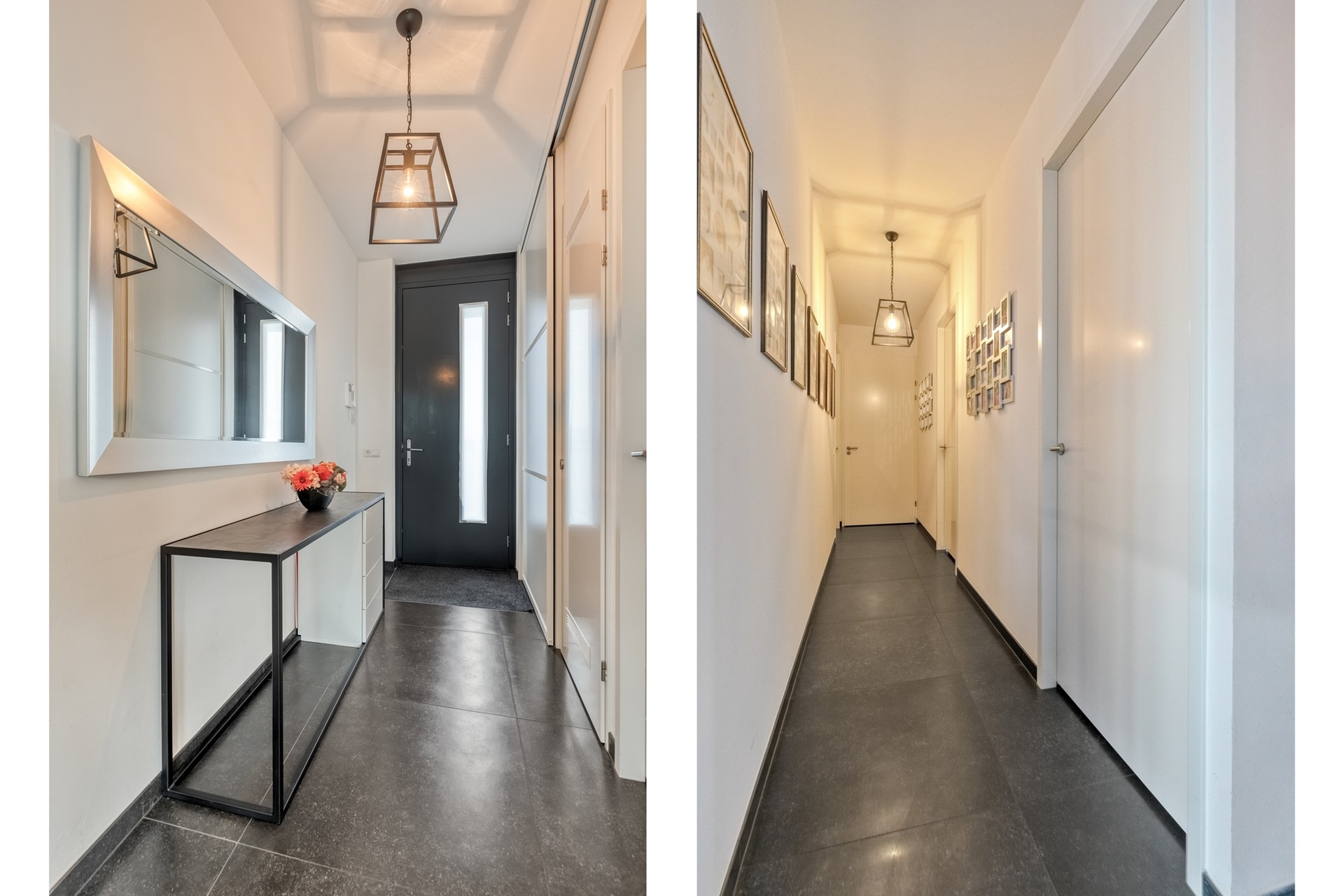 Middels de lift (of de trap als u ambitie heeft) bereikt u de bovenste verdieping van dit moderne appartementencomplex en loopt u over de overdekte galerij richting de entree van het penthouse. De entree c.q. hal is afgewerkt met een betegelde vloer, gestucte wanden en een gestuct plafond. De hal beschikt over een garderobekast, intercom en biedt toegang tot de meterkast, betegeld toilet met fonteintje, de living, berging c.q. technische ruimte, 3 slaapkamers en de badkamer.