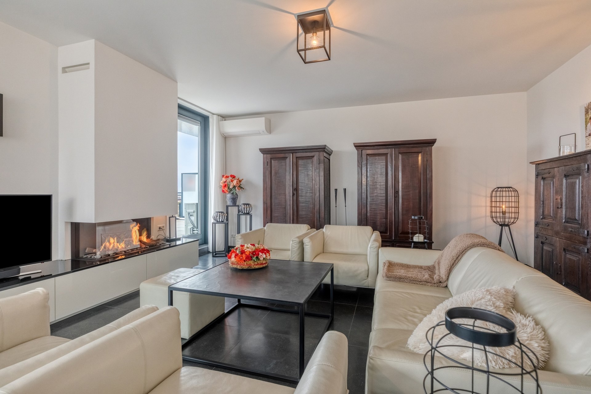 Vanuit de hal komt u de living binnen middels een moderne taatsdeur. Direct bent u onder de indruk van de luxe uitstraling en lichte ruimte. De living is afgewerkt met een luxe betegelde vloer, gestucte wanden en een gestuct plafond. De living is voorzien van een gashaard voor de koude winterdagen en airconditioning horren en elektrische op afstand bestuurbare screens voor de warme zomerdagen. Vanuit de living is er toegang tot het riante dakterras middels twee luxe schuifpuien en een openslaande tuindeur.