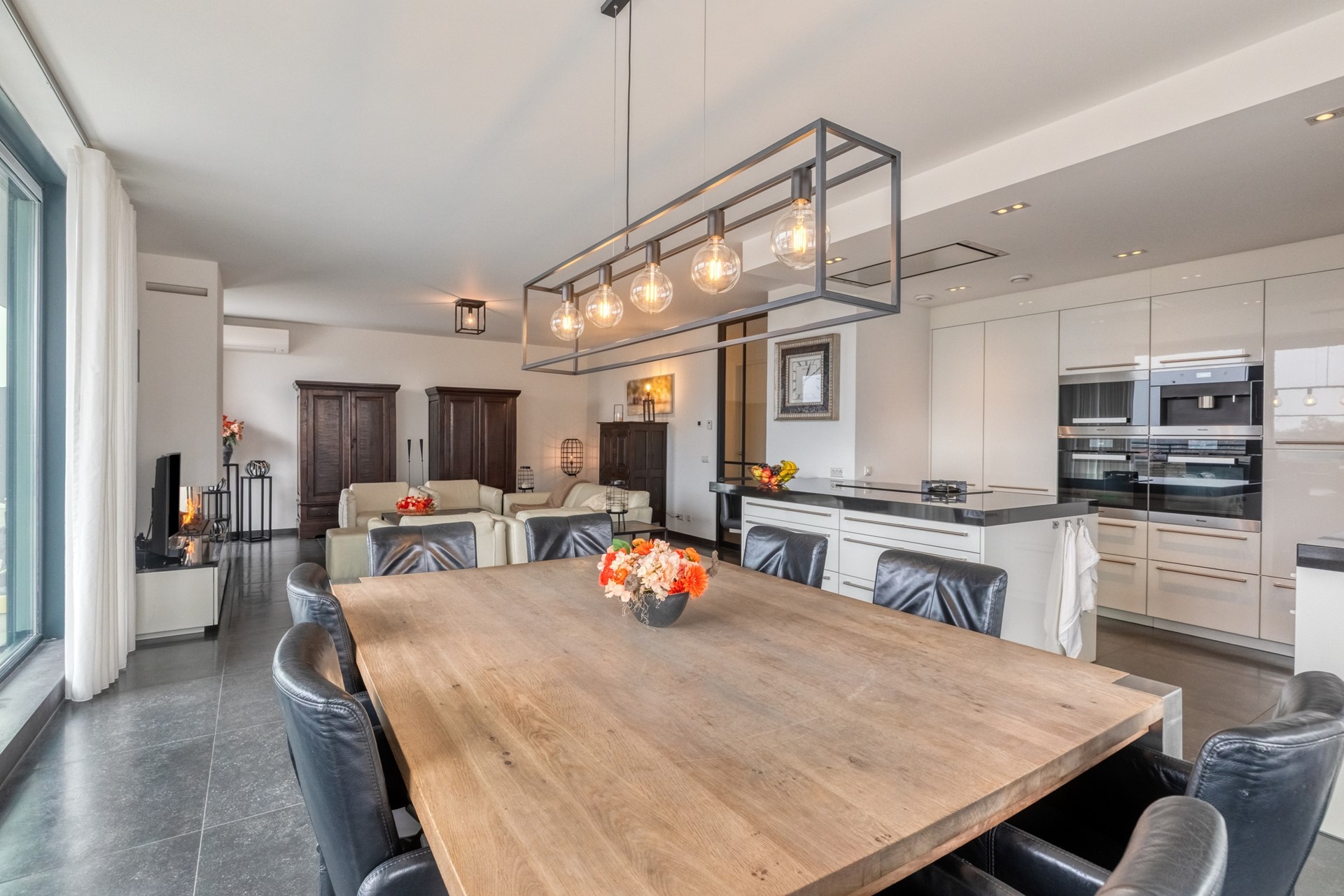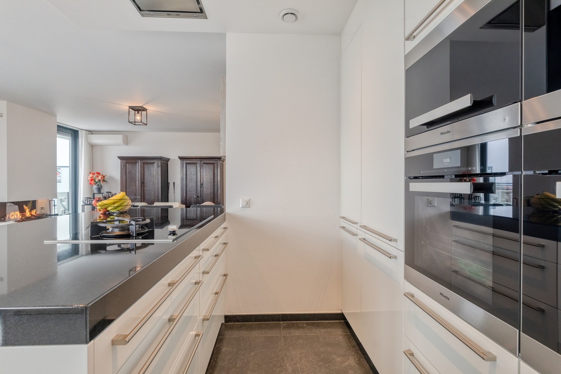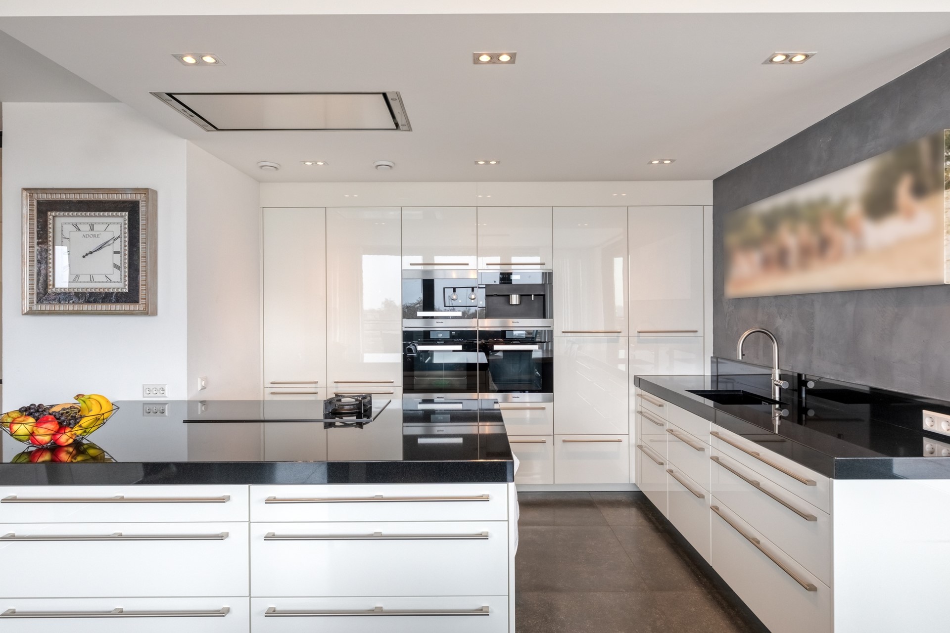 De moderne open keuken is afgewerkt met een betegelde vloer, gestucte wanden en een gestuct plafond met inbouwverlichting. De luxe keukeninrichting (Poggenpohl maatwerk inbouwkeuken) is voorzien van een hoogwaardig granieten keukenblad, spoelbak, koel-/vriescombinatie, 2 elektrische ovens, koffieautomaat, hoge druk stoomoven, vaatwasser, afzuigkap en een kookeiland voorzien van een inductiekookplaat met separate wokbrander (gas).