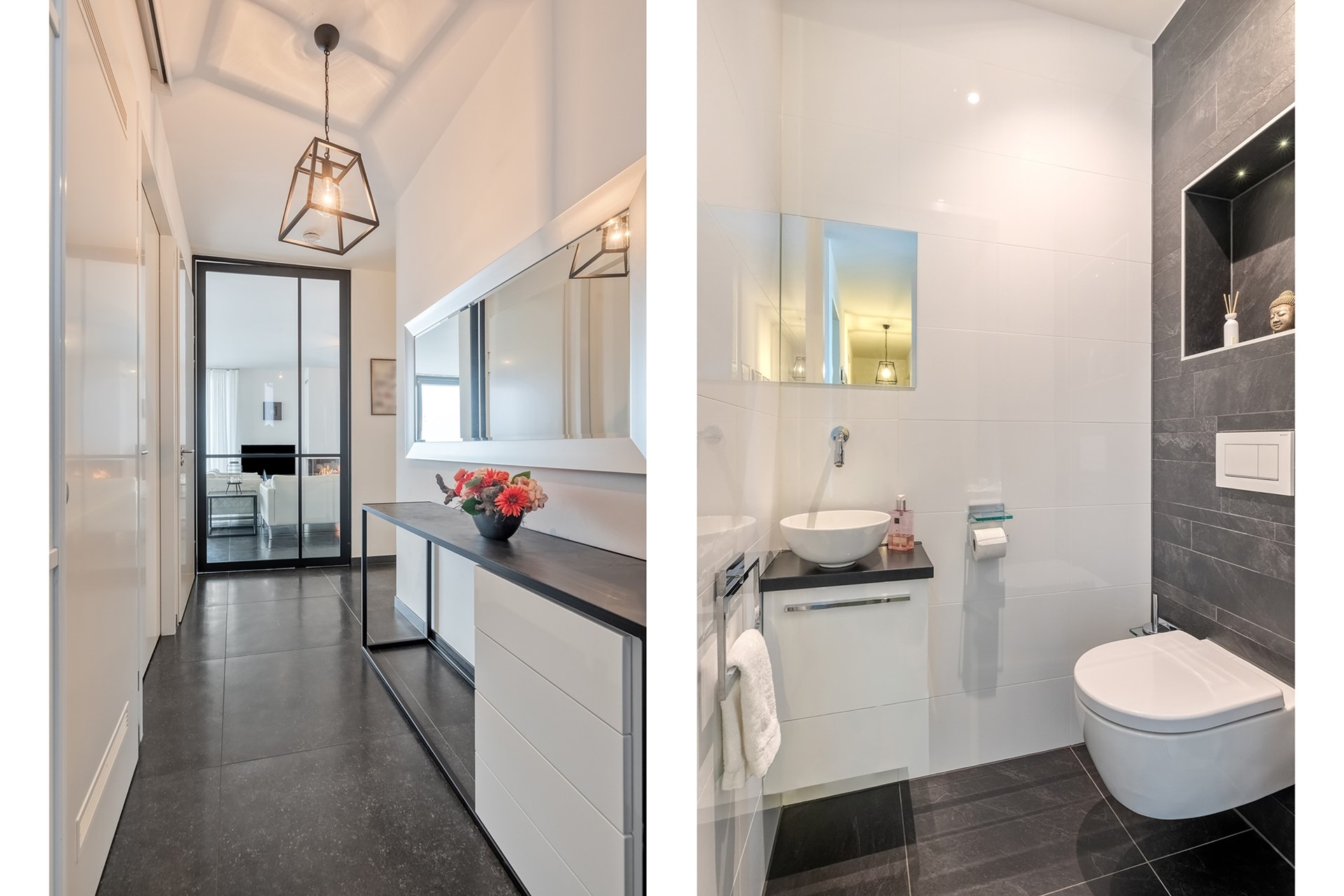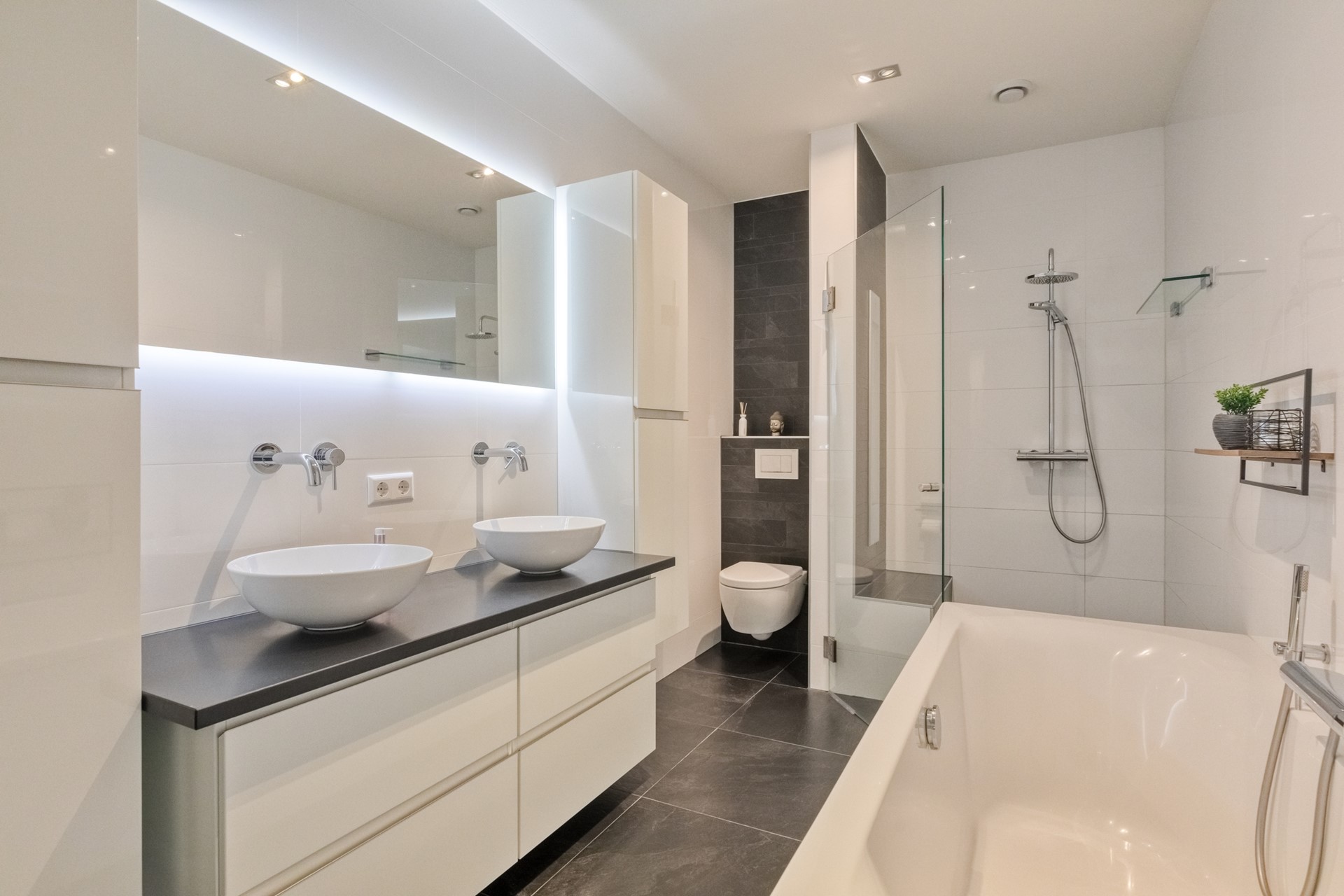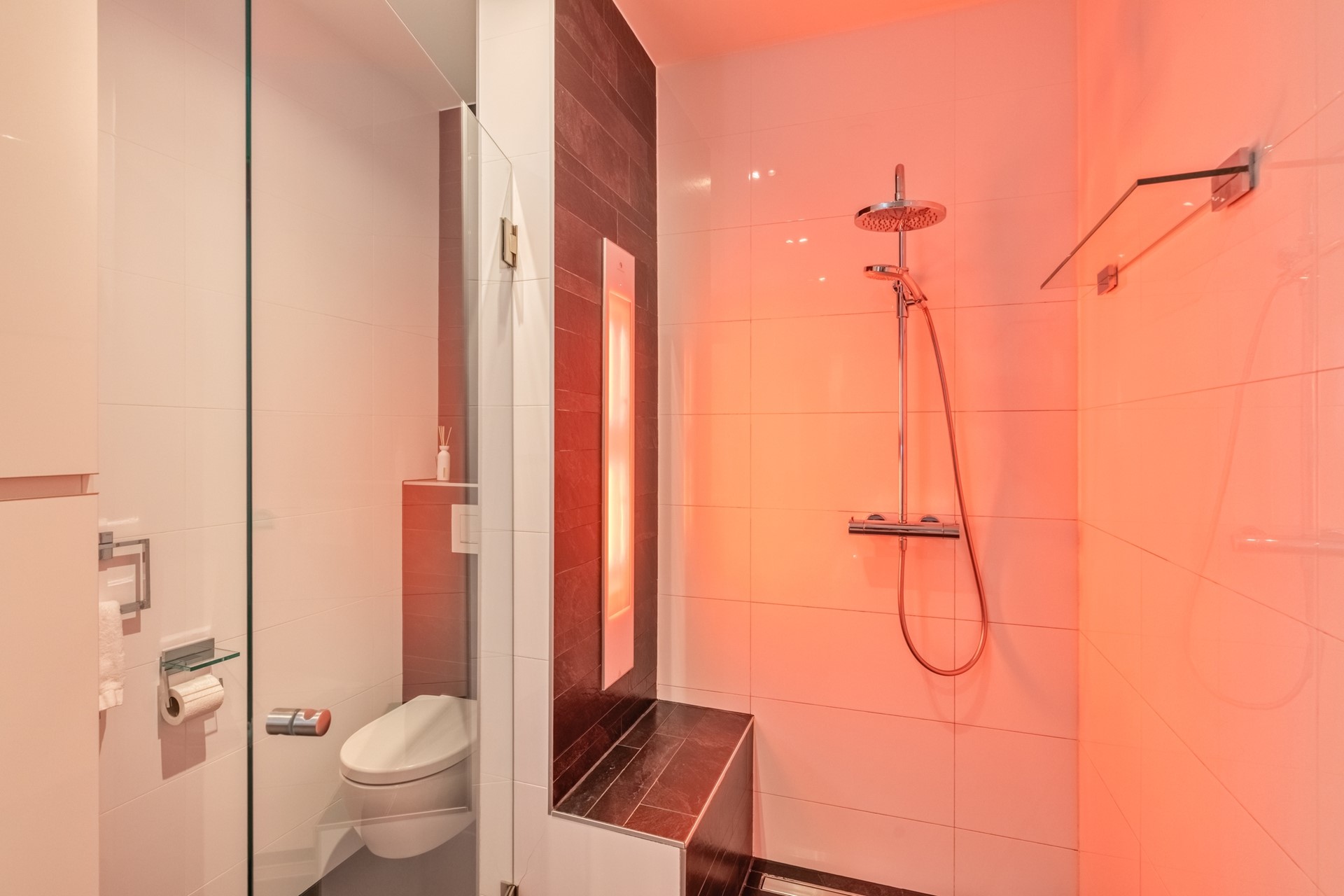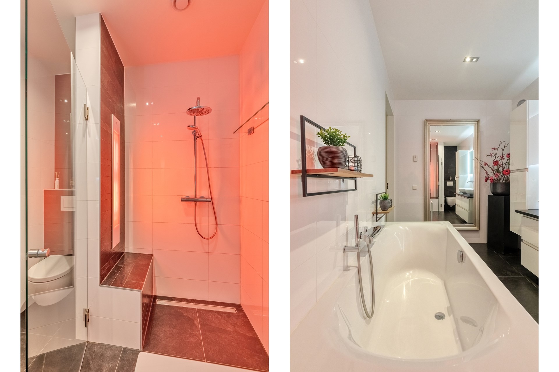 Uw eigen vijfsterrenbadkamer! Het ligbad, de Sunshower en vloerverwarming zorgen voor een ultiem hotelgevoel, elke dag opnieuw. De moderne badkamer is afgewerkt met een betegelde vloer, betegelde wanden een gestuct plafond. De badkamer is voorzien van een ligbad, inloopdouche met Sunshower (infrarood) en zitbankje (incl. vloerverwarming) , 2e toilet, badkamermeubel met dubbele wastafel.