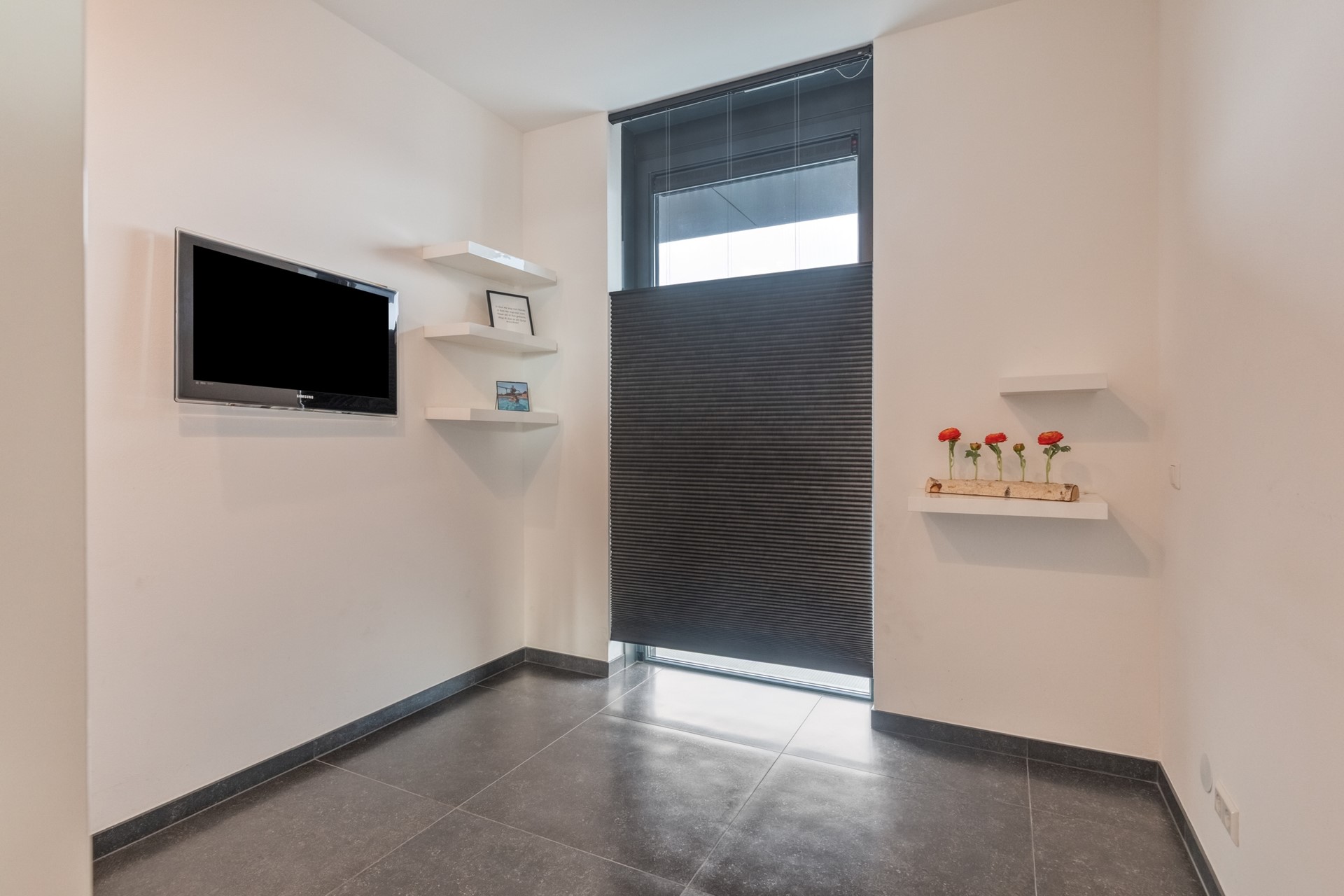 Slaapkamer 3 is afgewerkt met een betegelde vloer, gestucte wanden en een gestuct plafond. De slaapkamer is voorzien van een kastenwand met spots, elektrisch (op afstand) bedienbare luxaflex schermen en horren.