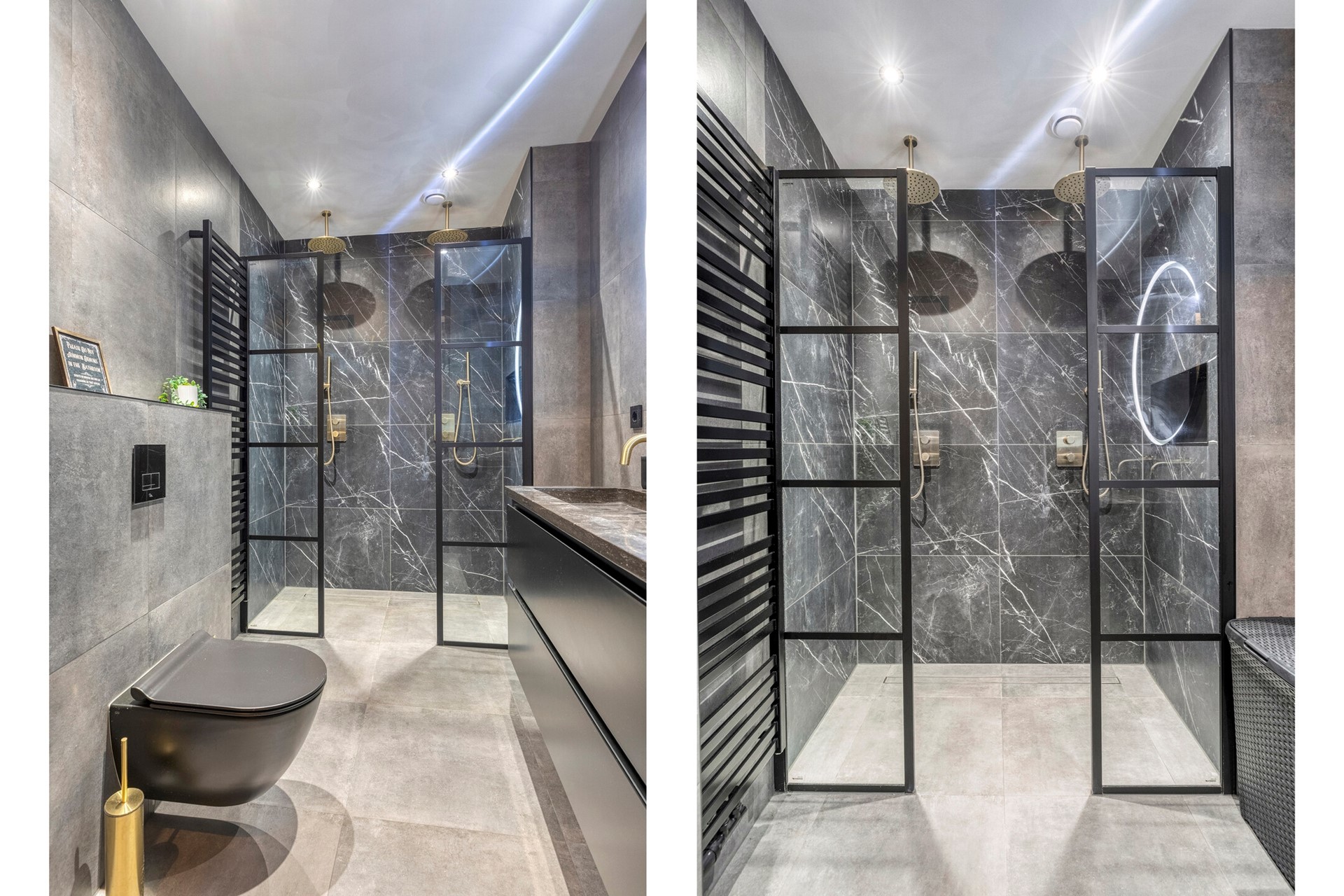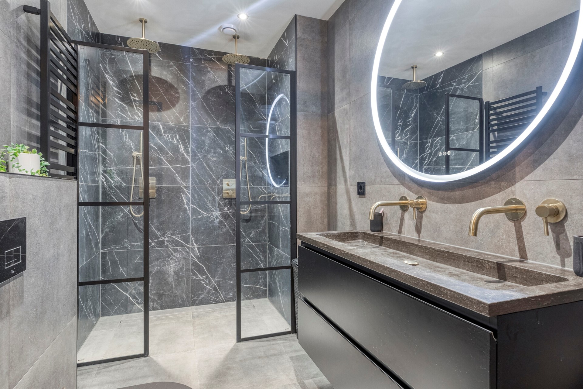 Wauw, wat een eyecatcher! Dit is een badkamer om verliefd op te worden. De badkamer uit 2023 is afgewerkt met een betegelde vloer, betegelde wanden en een gestuct plafond met inbouwverlichting. De badkamer is voorzien van elektrische vloerverwarming, 2e toilet, dubbel wastafelmeubel en niet te vergeten: een dubbele douche!