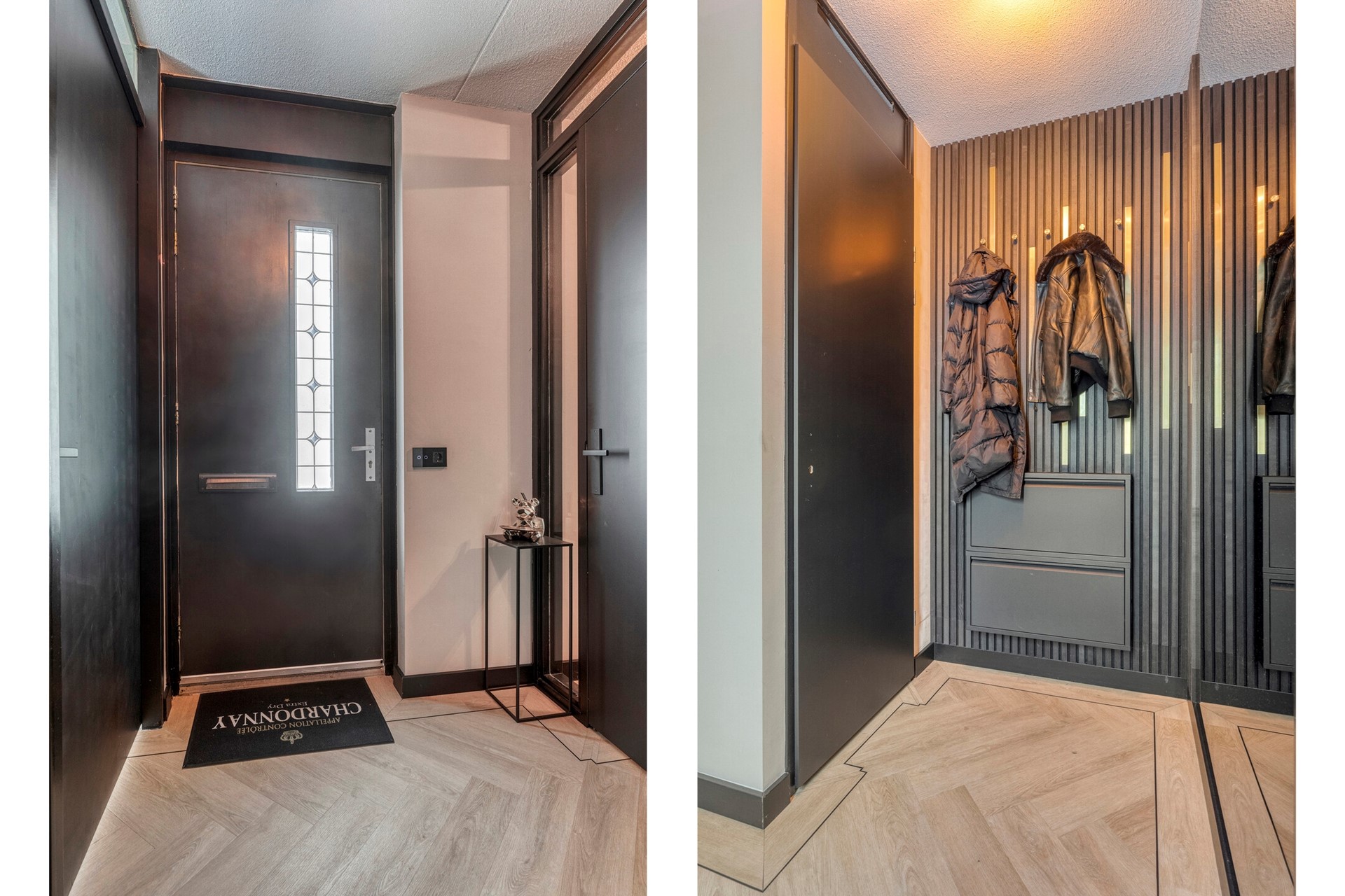 Jullie komen aan in de kindvriendelijke woonwijk, parkeren de auto (op jullie eigen parkeerplaats) en lopen de woning binnen. De hal c.q. entree is afgewerkt met een in visgraat gelegde PVC vloer incl. zwarte bies, gestucte wanden en een spuitwerk plafond. De hal c.q. entree biedt toegang tot het modern betegelde toilet met fonteintje, meterkast, garderobe, multifunctionele ruimte (kamer), woonkamer, keuken en eerste verdieping middels een vaste trapopgang.