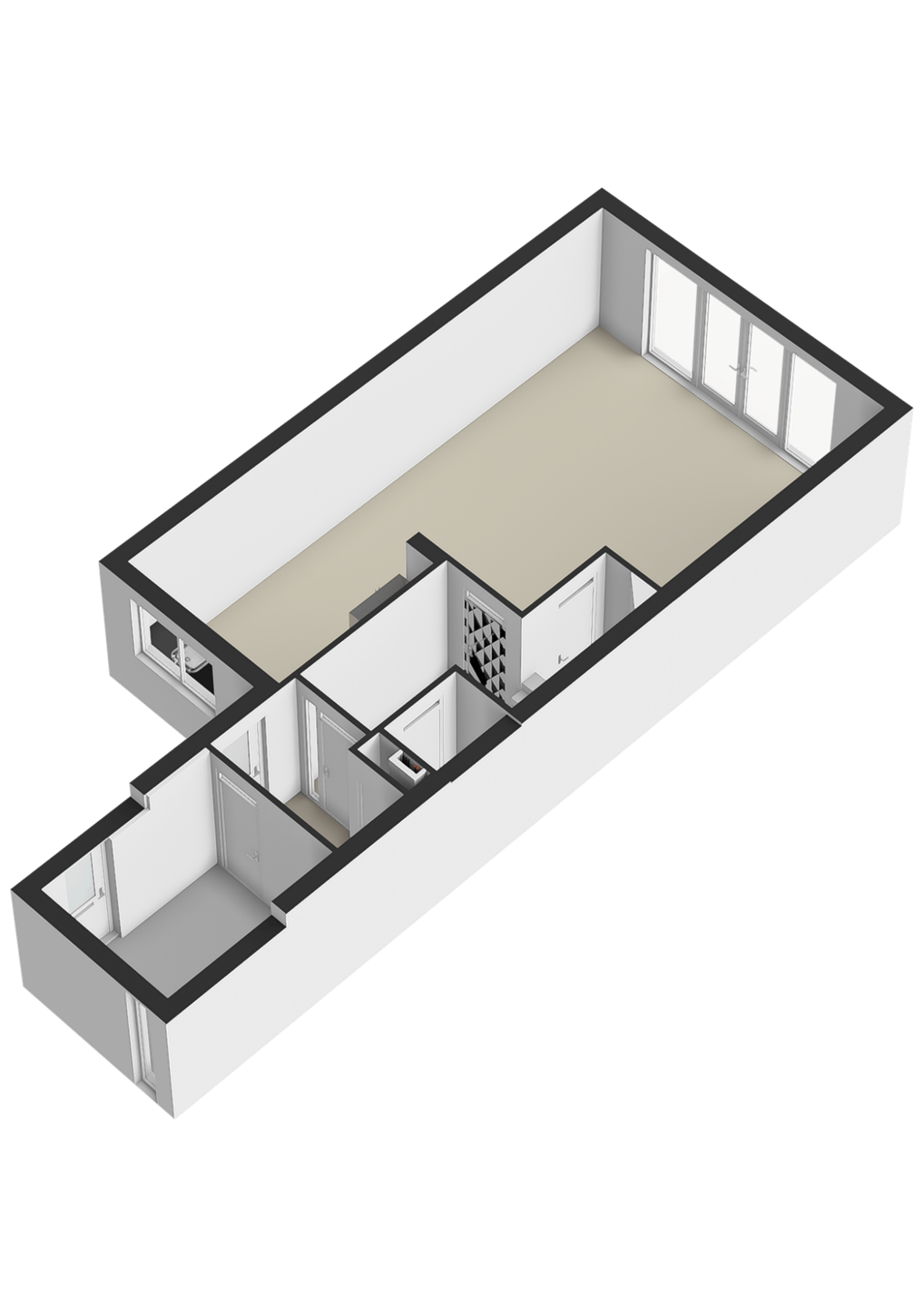 De multifunctionele ruimte (kamer) is afgewerkt met een in visgraat gelegde PVC vloer incl. zwarte bies, gestucte wanden en een spuitwerk plafond. beschikt over een eigen entree, waardoor deze ruimte ook goed in gebruik genomen kan worden voor kantoor/praktijk aan huis.