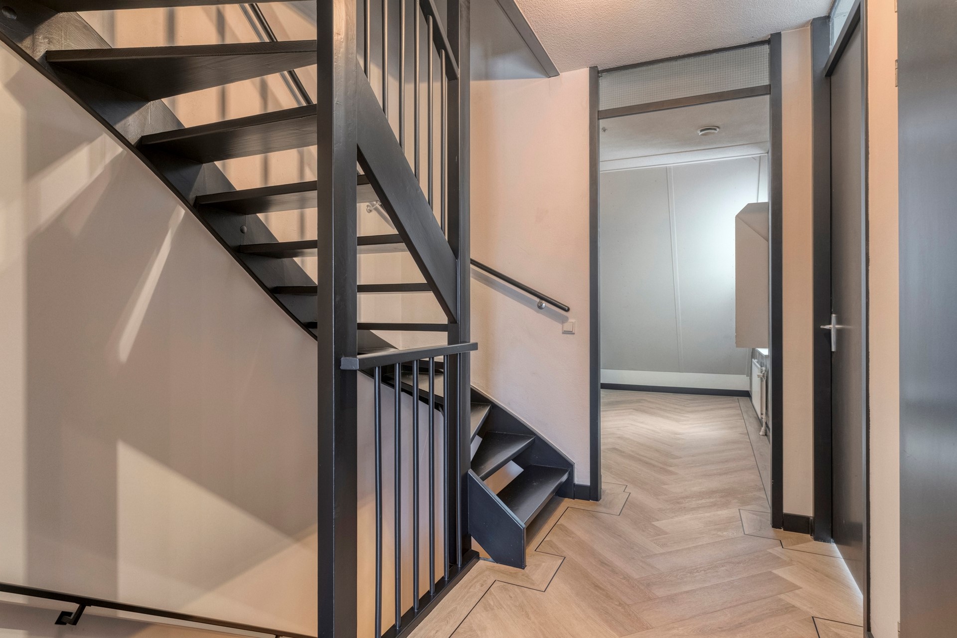 Middels de vaste trap op de begane grond bereiken jullie de overloop op de eerste verdieping. De overloop is afgewerkt met een in visgraat gelegde PVC vloer incl. zwarte bies, gestucte wanden en een spuitwerk plafond. De overloop biedt toegang tot 3 slaapkamers, de moderne badkamer en tweede verdieping middels een vaste trapopgang.