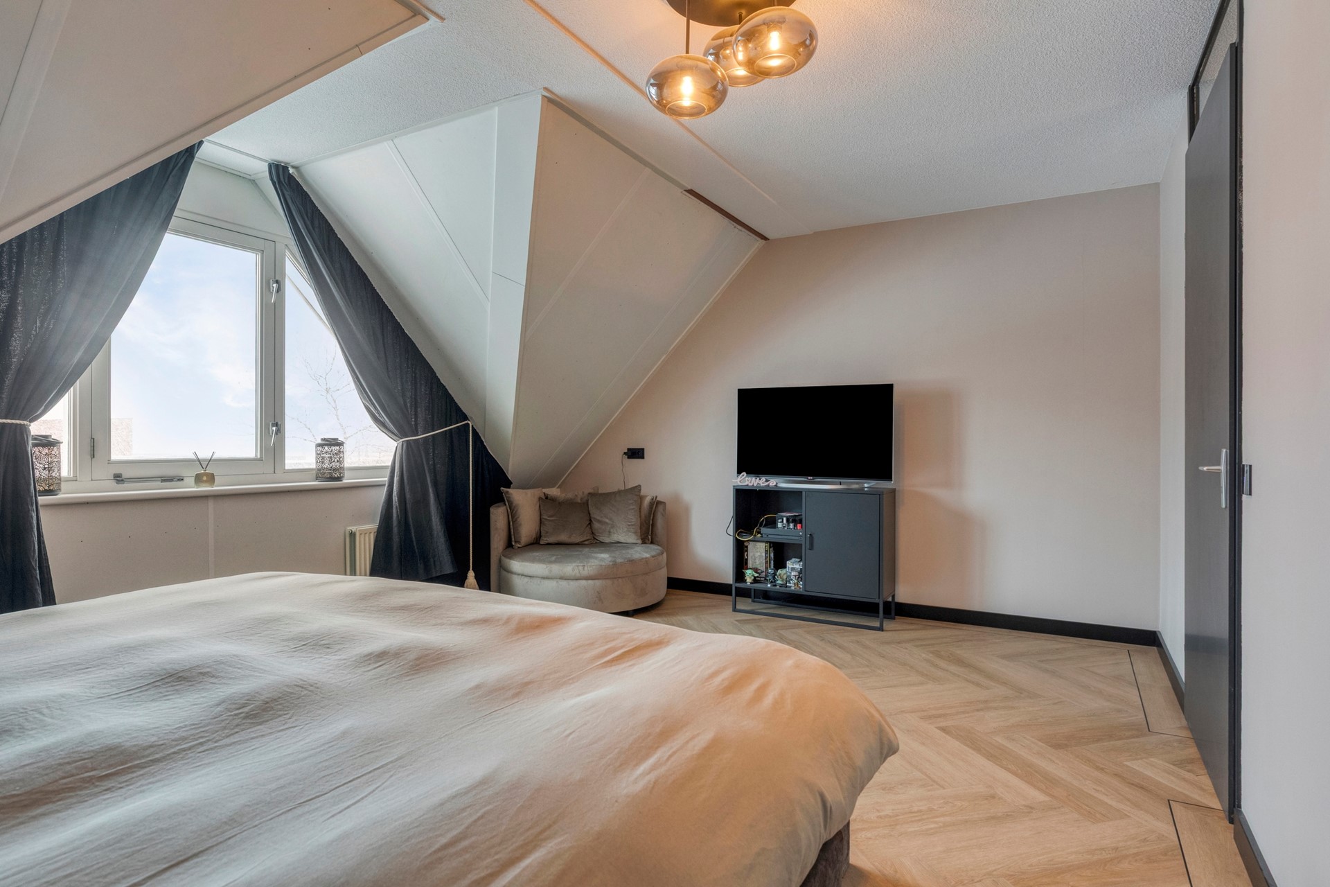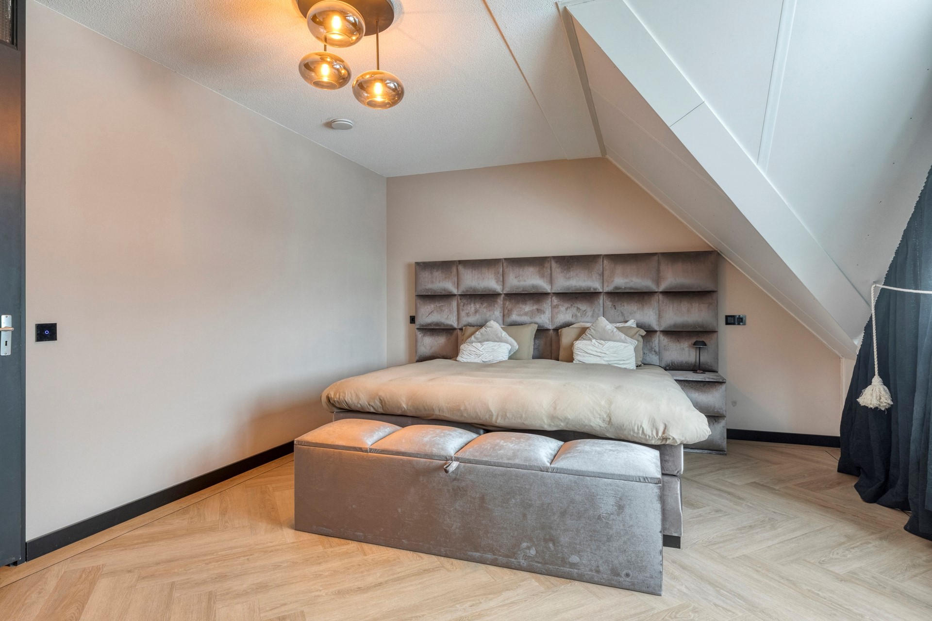 Slaapkamer 1 is afgewerkt met een visgraat gelegde PVC vloer incl. zwarte bies, gestucte wanden en een spuitwerk plafond.