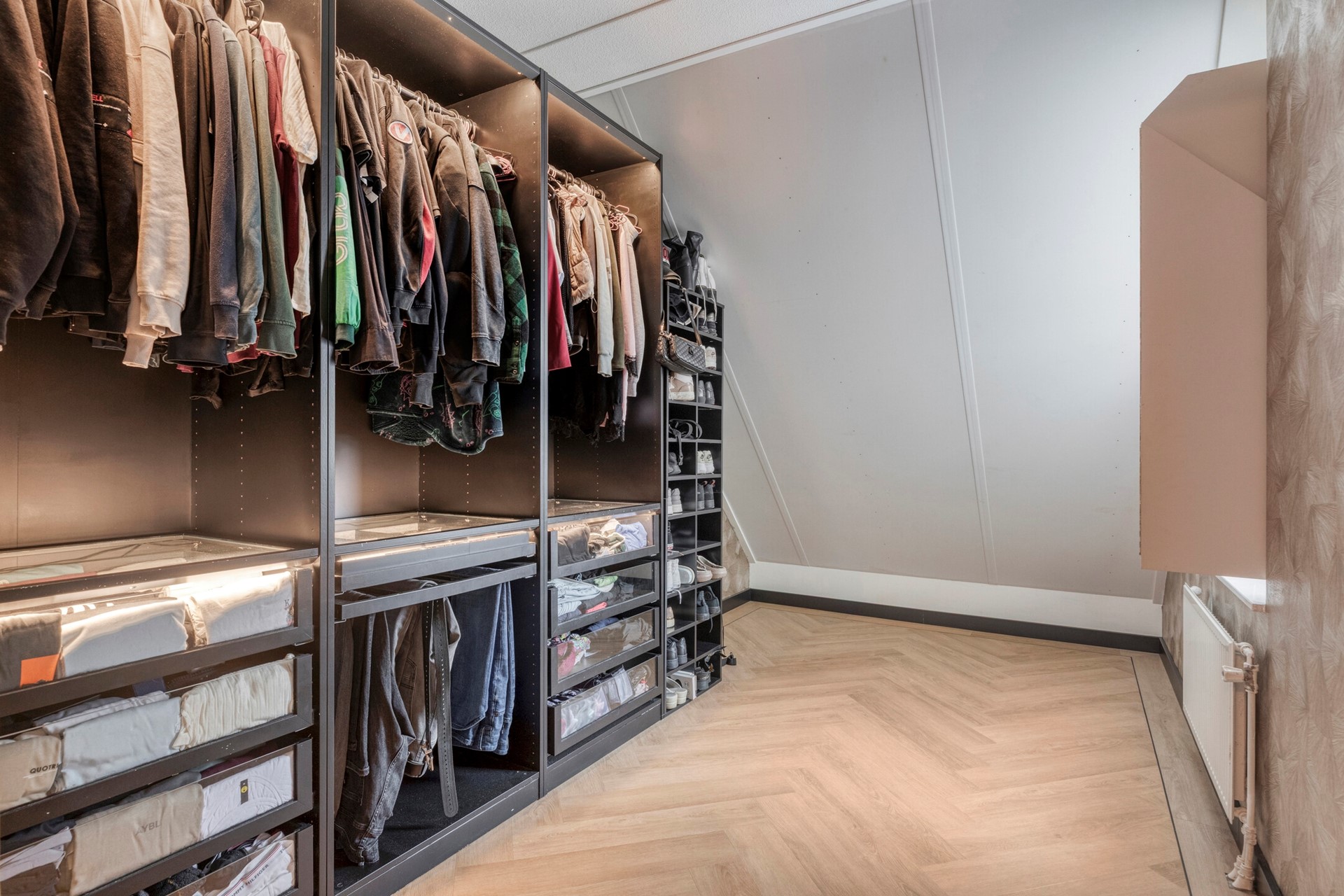 Slaapkamer 3 is afgewerkt met een visgraat gelegde PVC vloer incl. zwarte bies, behangen wanden en een spuitwerk plafond.