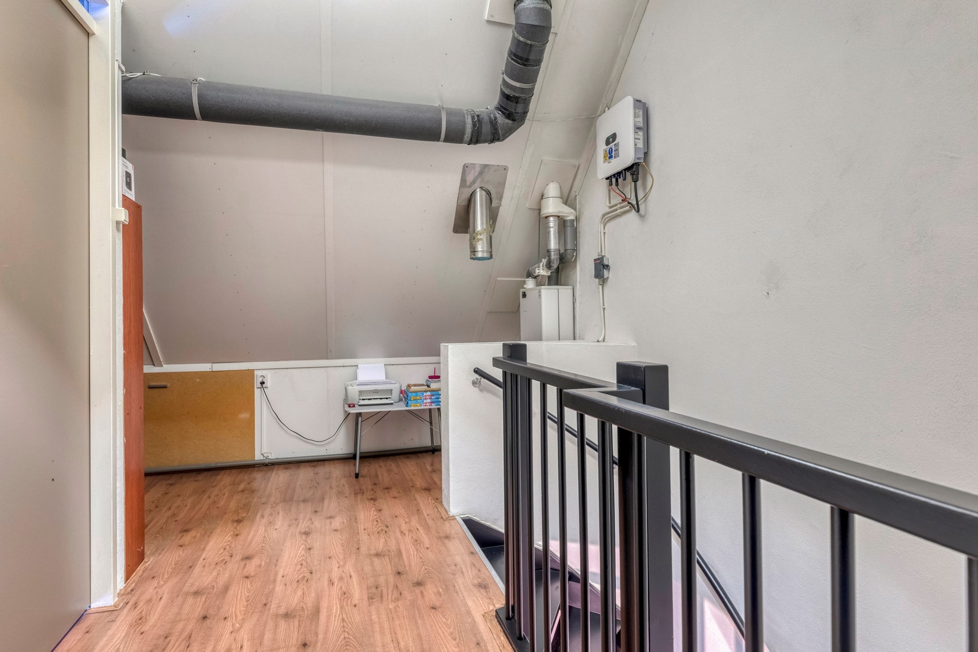 Middels de vaste trapopgang op de eerste verdieping bereiken jullie de overloop op de tweede verdieping. De overloop is afgewerkt met een laminaat vloer, gestucte wanden en plafondplaten. De overloop is voorzien van knieschotkasten, omvormer t.b.v. de zonnepanelen, aansluiting witgoed, CV-Ketel (Intergas, 2011), MV-Unit en biedt toegang tot de 4e slaapkamer.