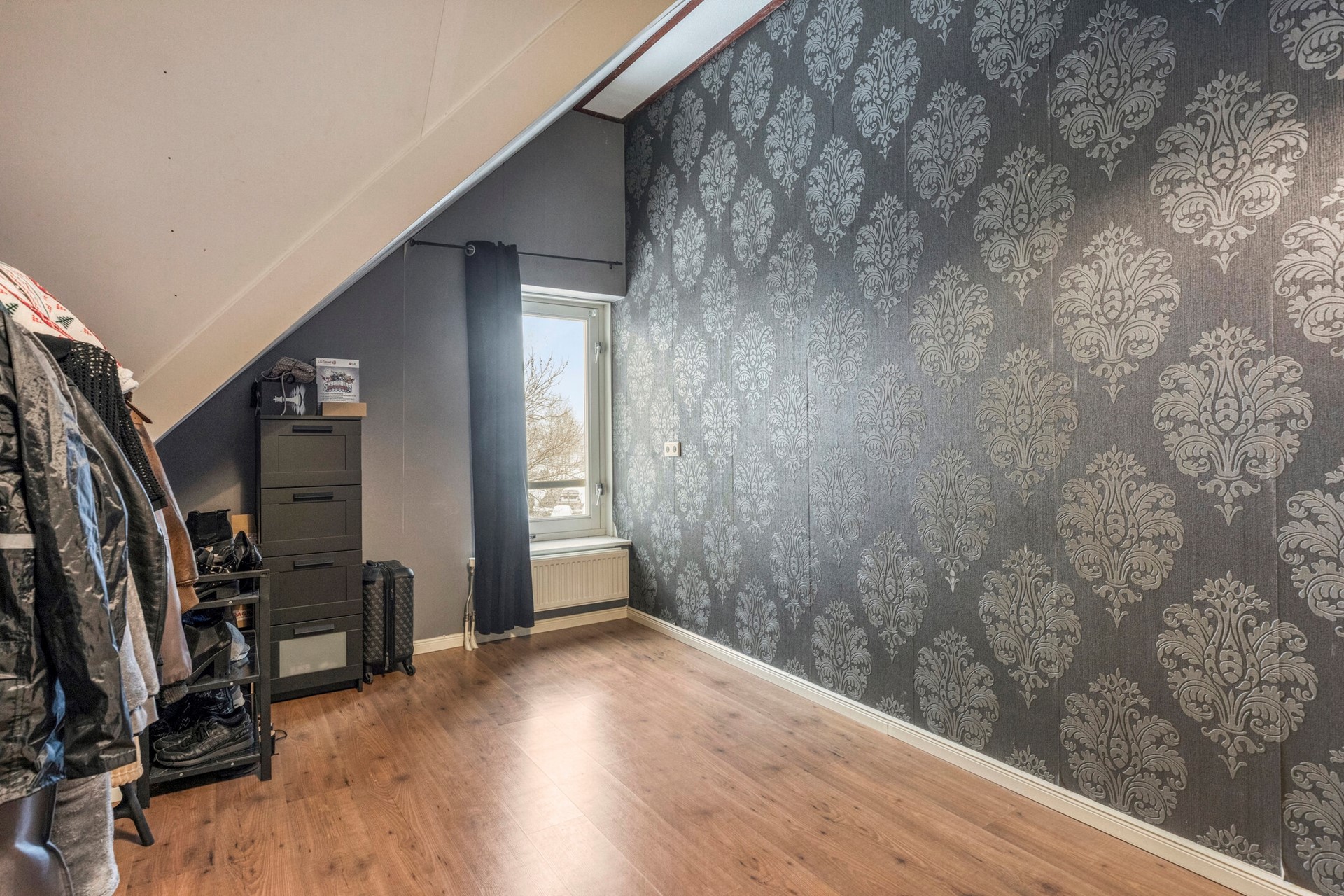 Slaapkamer 4 is afgewerkt met een laminaat vloer, behangen wanden en plafondplaten.