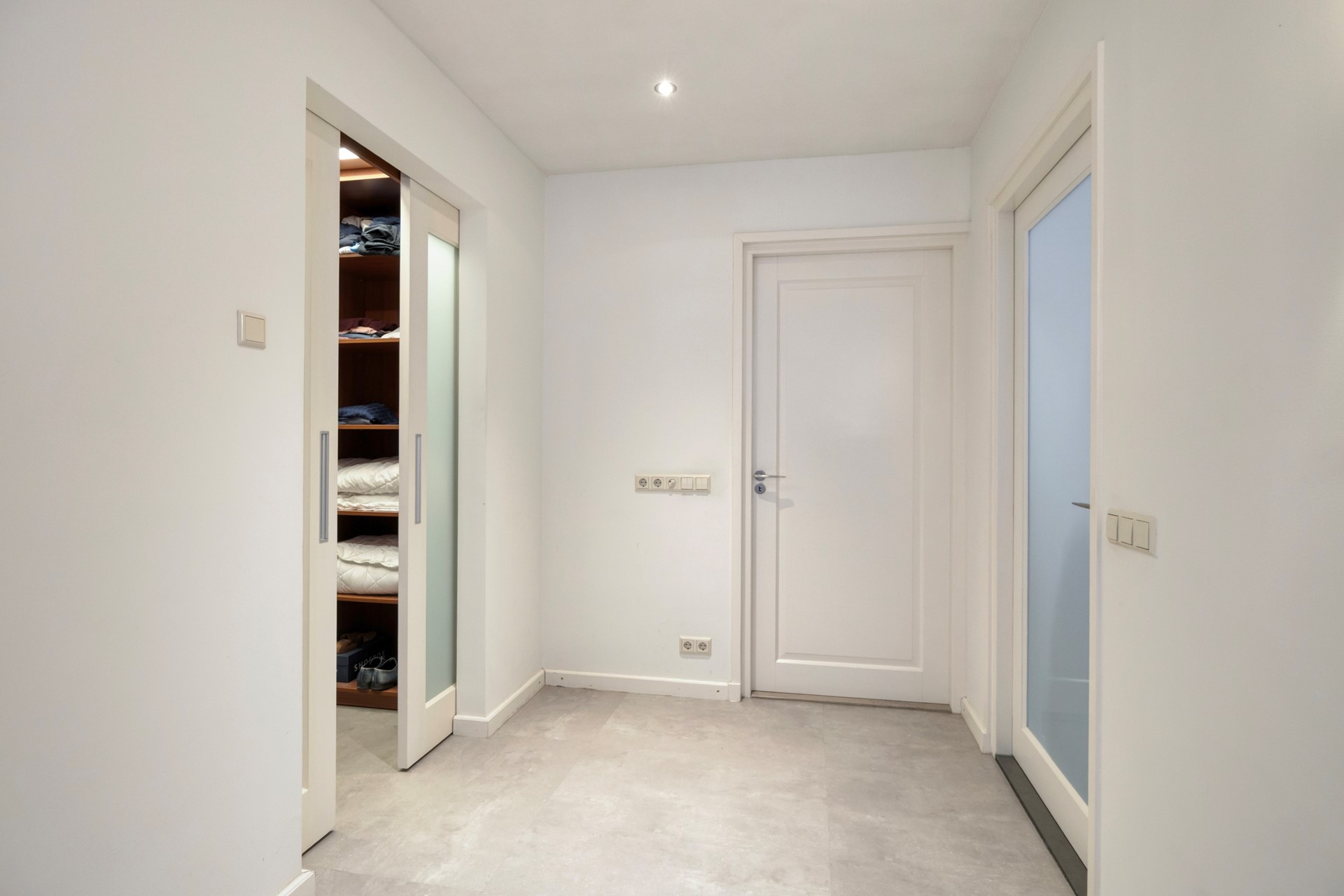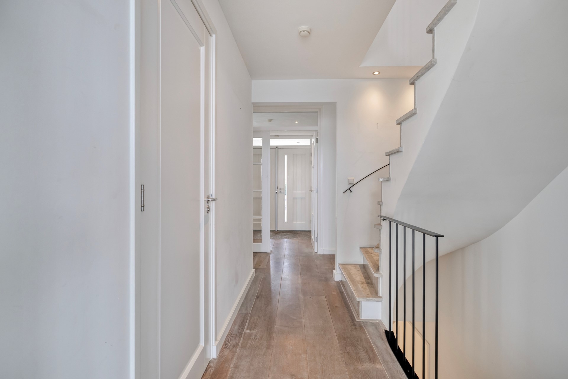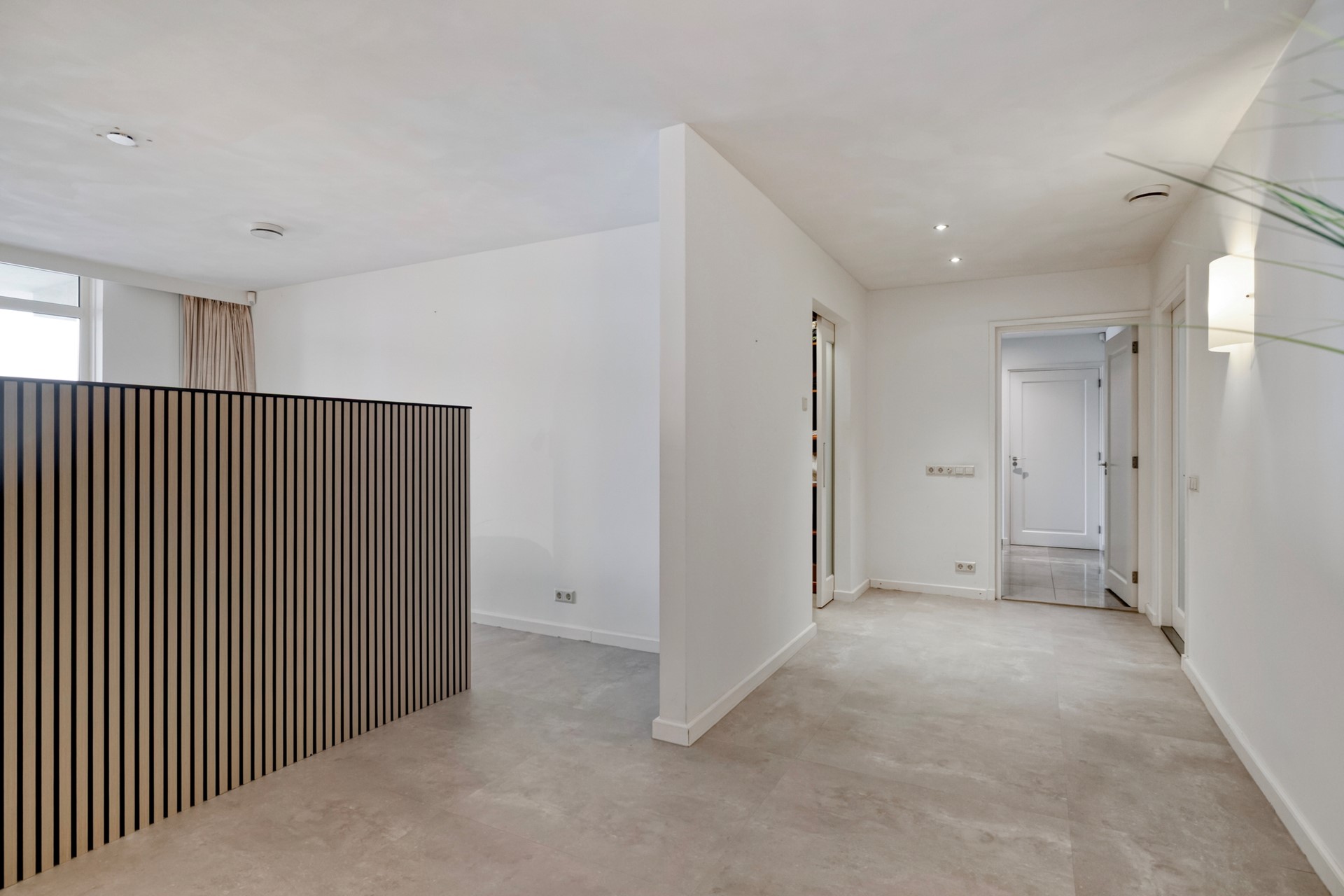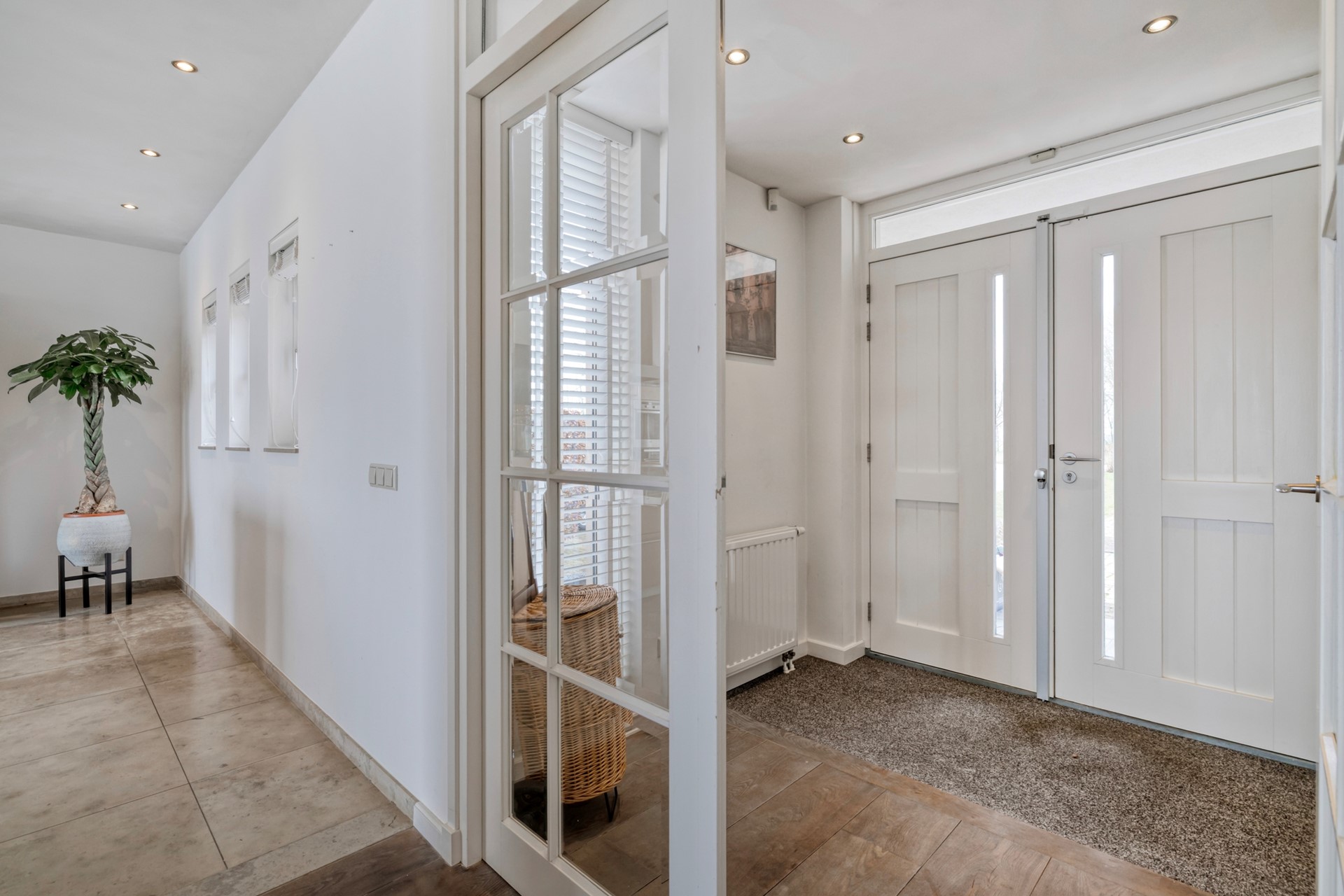 De entree verwelkomt u met een lichte, luxe uitstraling en een gevoel van ruimte. De entree is afgewerkt met een houten vloer, gestucte wanden en een gestuct plafond. De entree biedt toegang tot de meterkast, riante woonkamer en open woonkeuken.