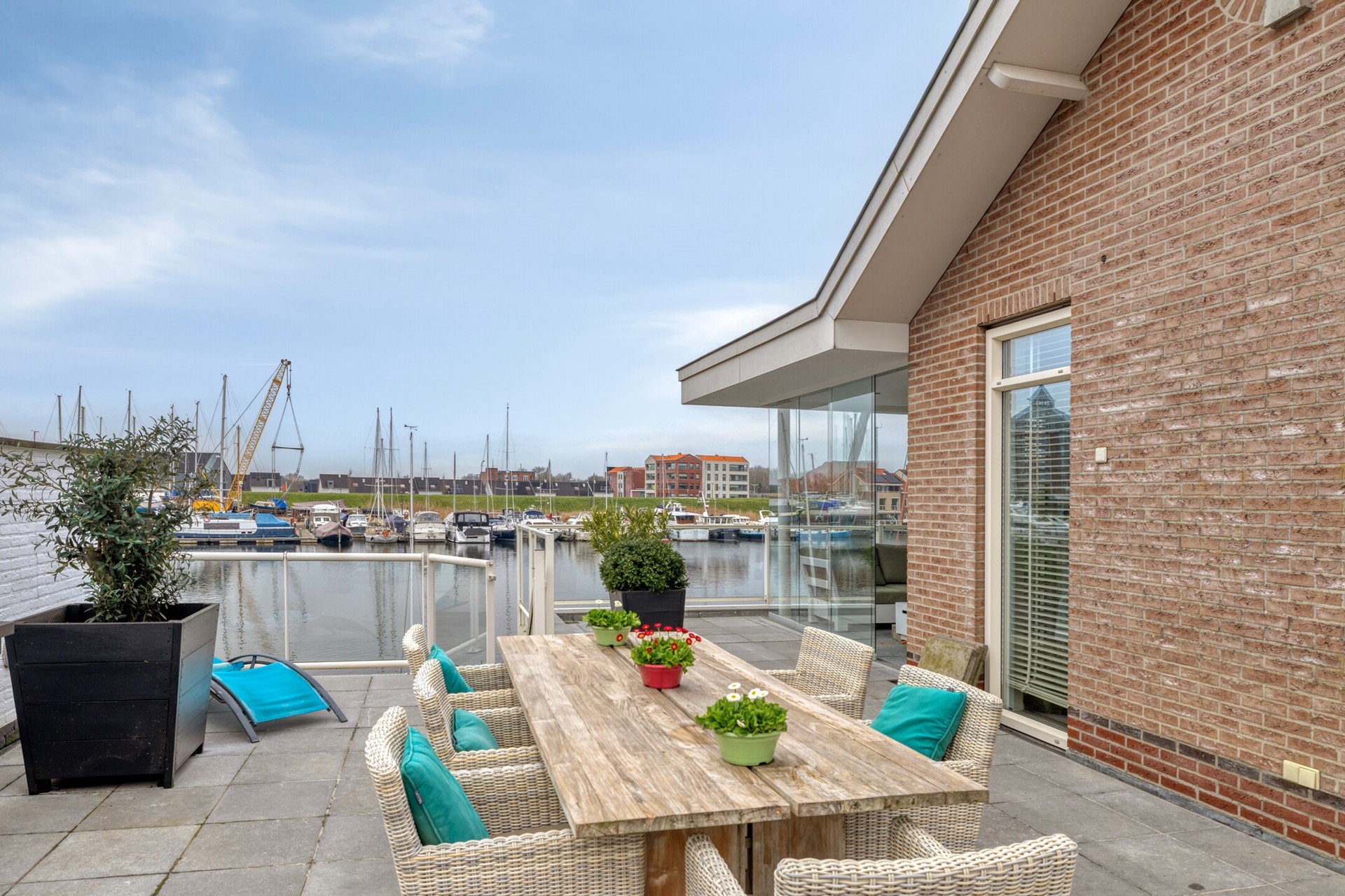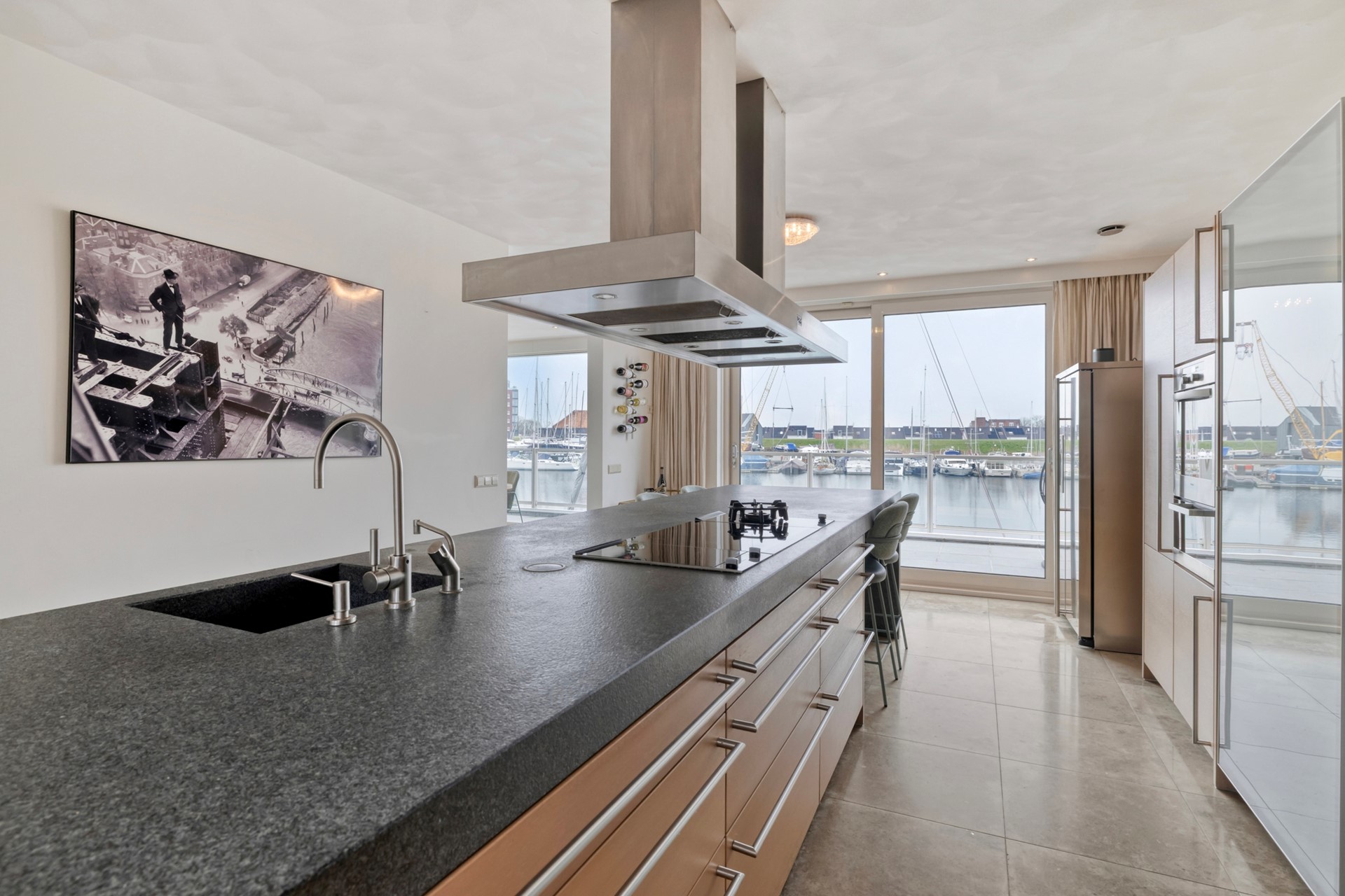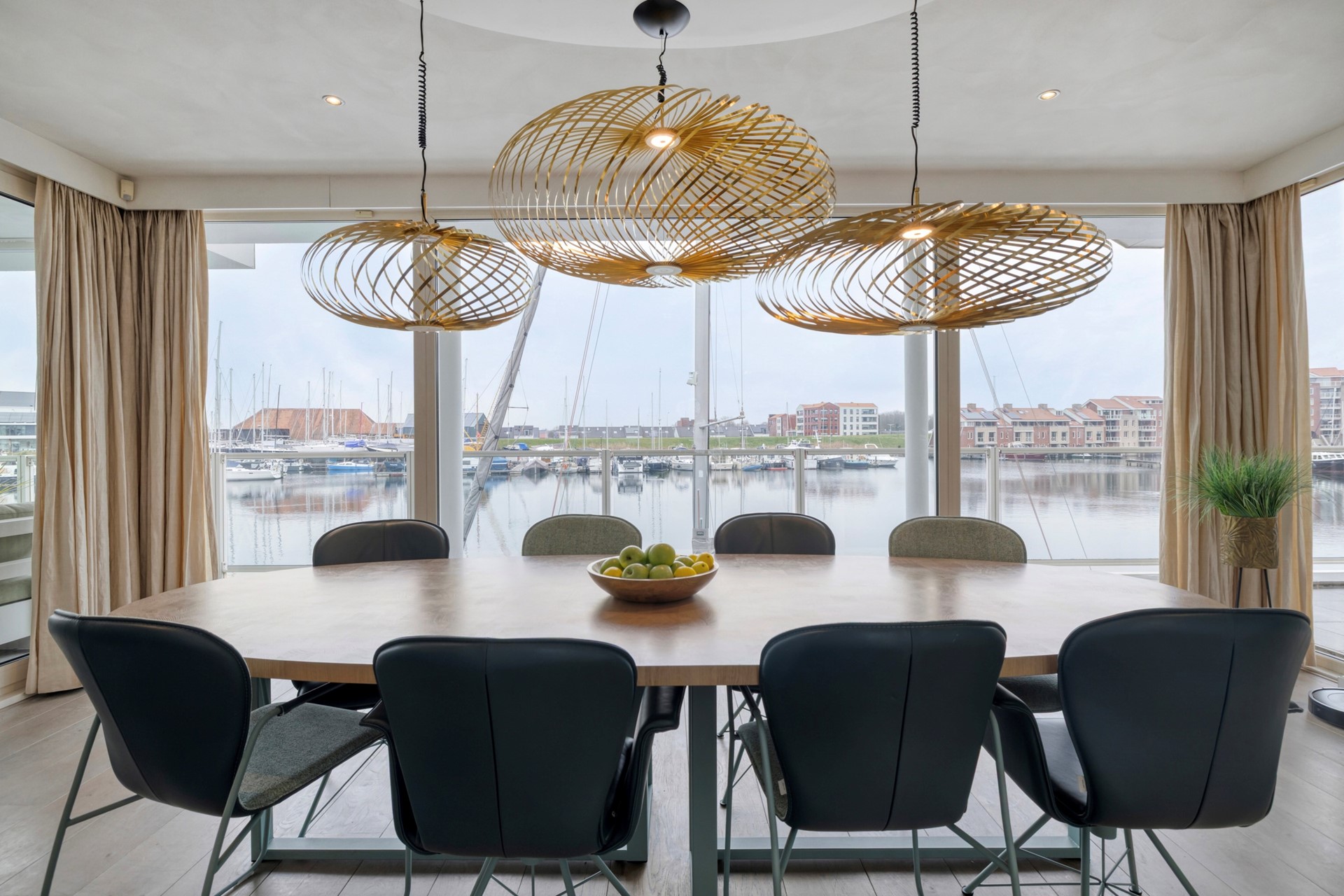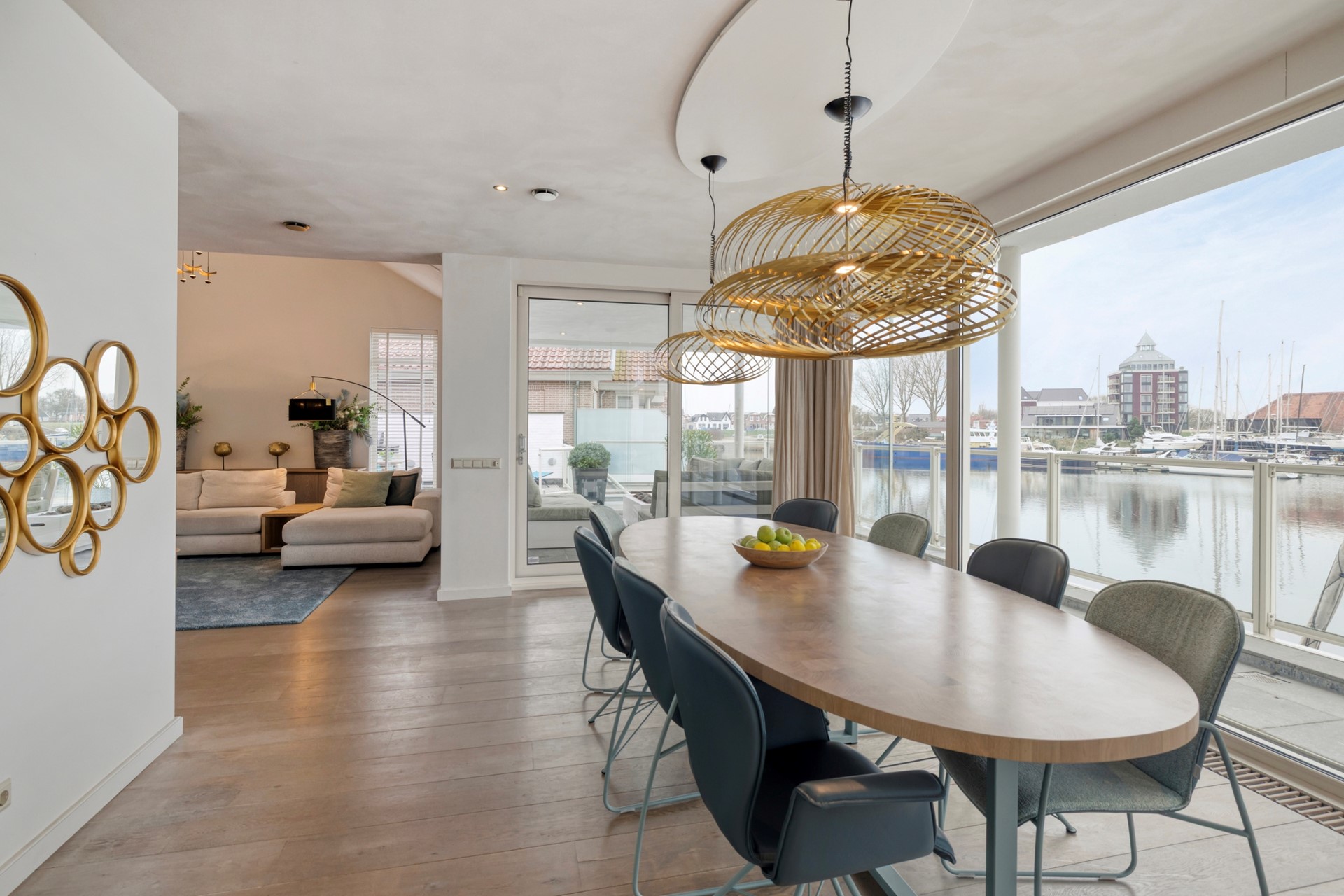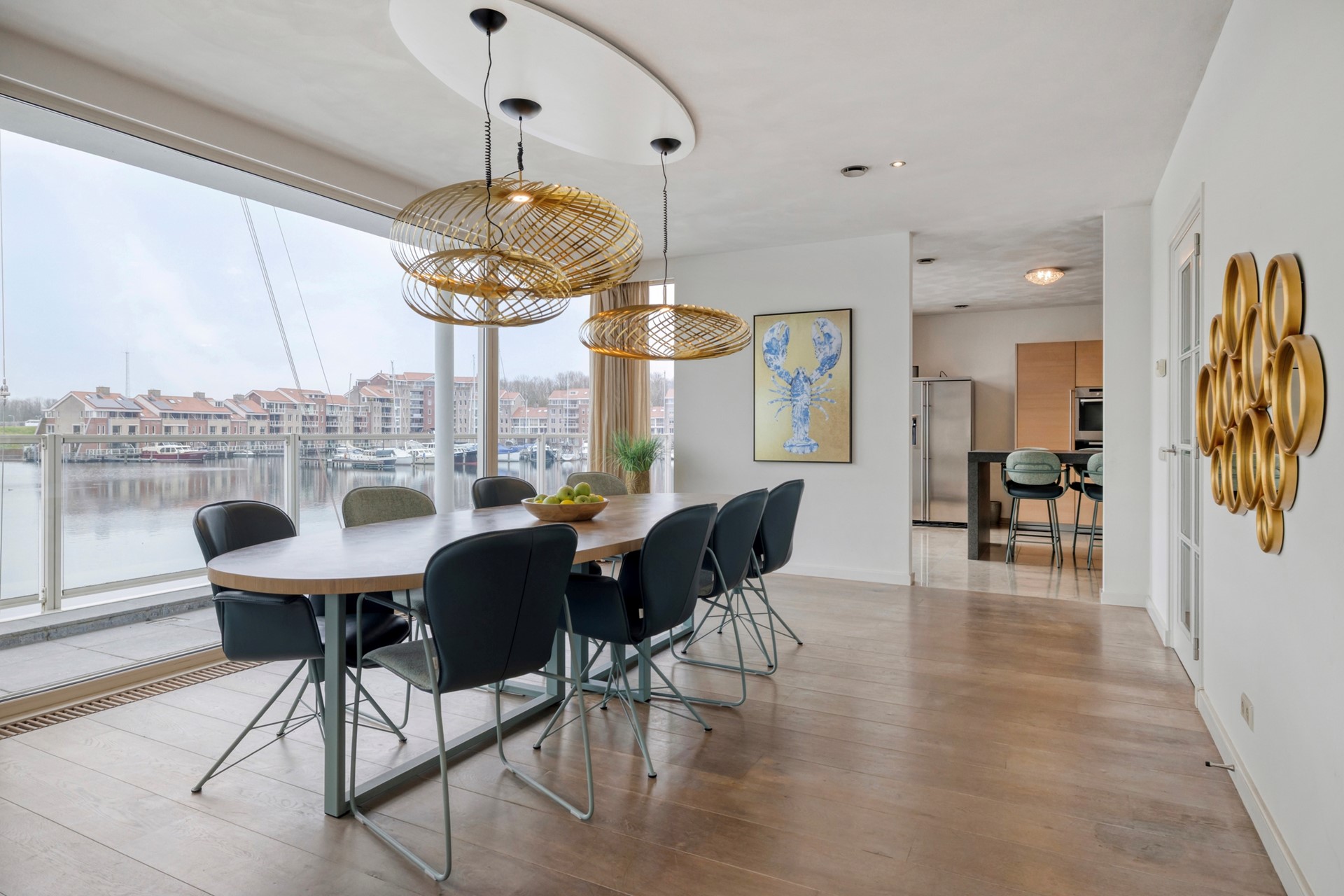 De eetkamer is afgewerkt met een houten vloer, gestucte wanden en een gestuct plafond. Dankzij de grote raampartijen geniet u hier van een prachtig uitzicht over de glinsterende haven en voorbijvarende bootjes. Middels de schuifpui loopt u zo door naar de lichte, zonnige serre, waardoor binnen en buiten naadloos in elkaar overlopen. De eetkamer nodigt uit tot gezellige diners en onvergetelijke momenten met familie en vrienden.