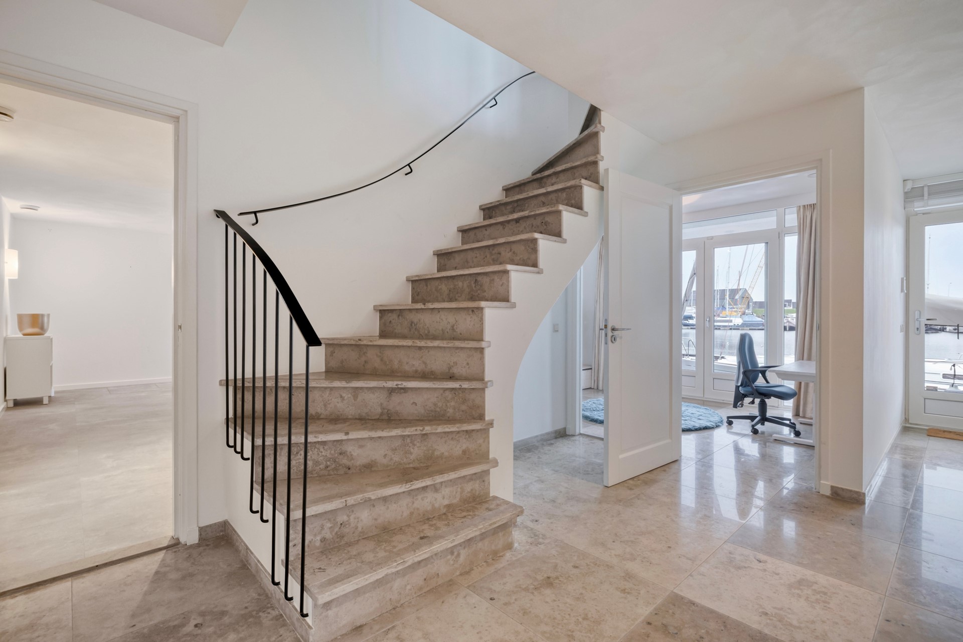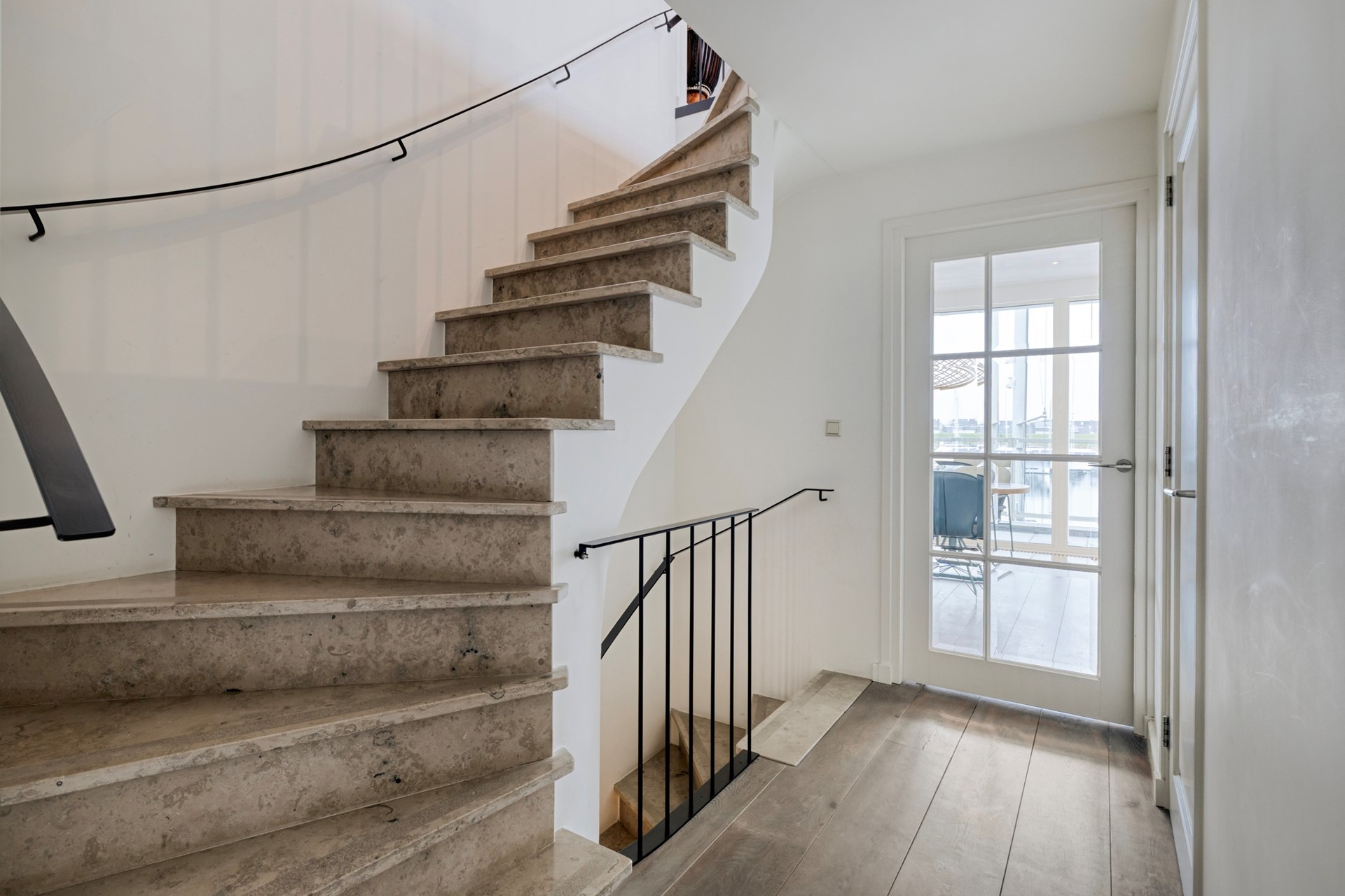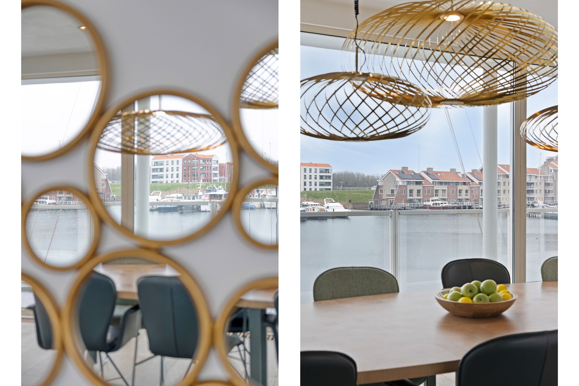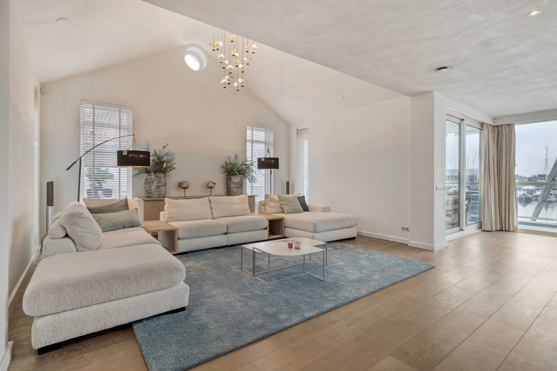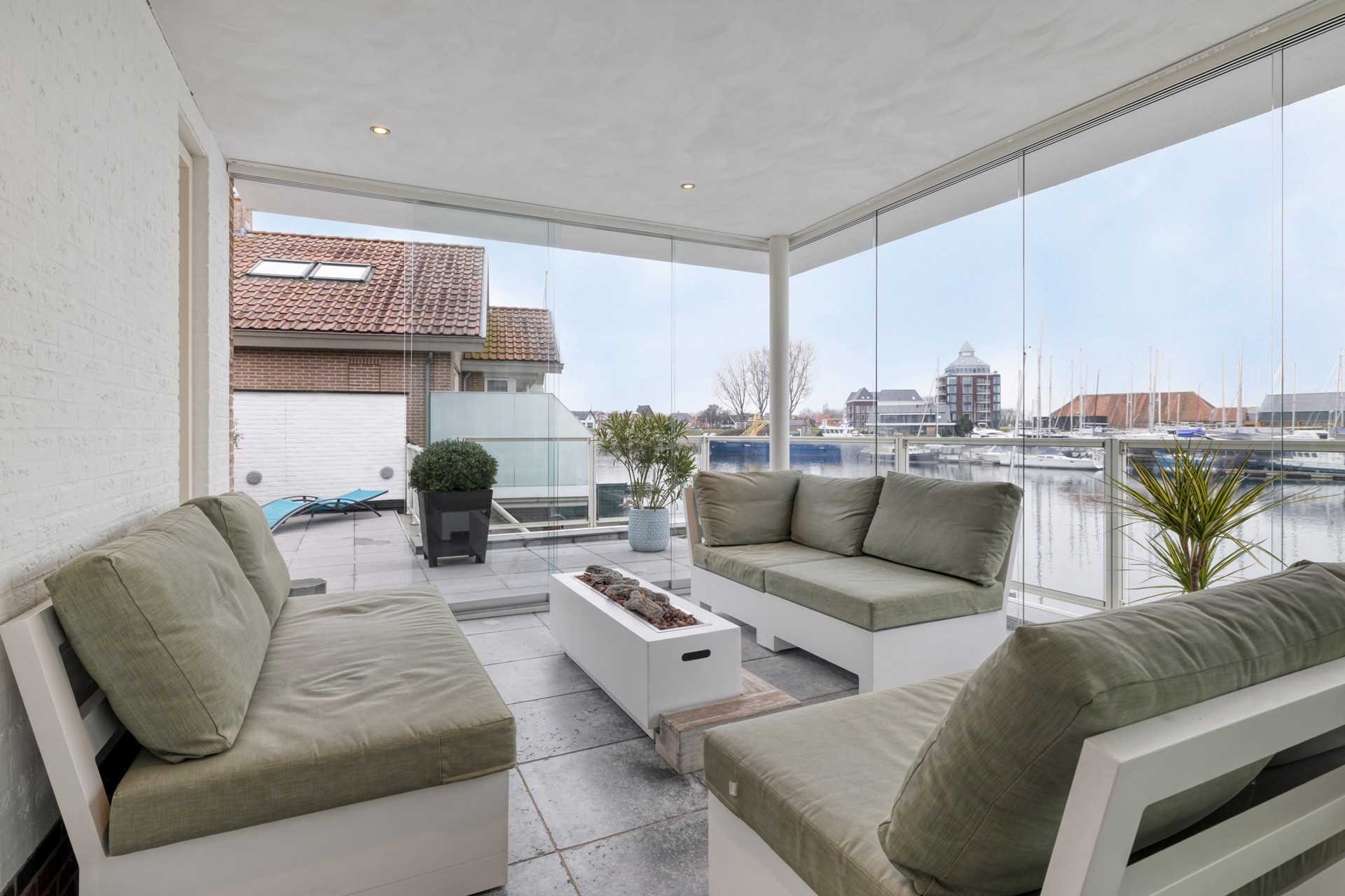 De eetkamer is afgewerkt met een houten vloer, gestucte wanden en een gestuct plafond. Dankzij de grote raampartijen geniet u hier van een prachtig uitzicht over de glinsterende haven en voorbijvarende bootjes. Middels de schuifpui loopt u zo door naar de lichte, zonnige serre, waardoor binnen en buiten naadloos in elkaar overlopen. De eetkamer nodigt uit tot gezellige diners en onvergetelijke momenten met familie en vrienden.