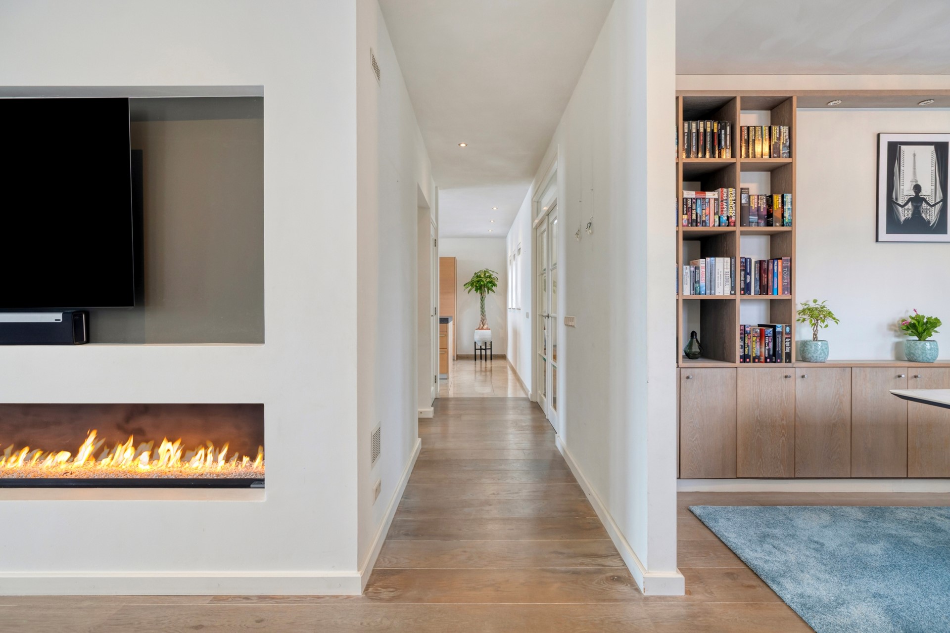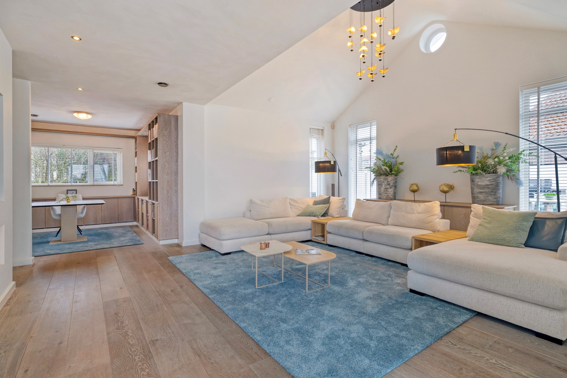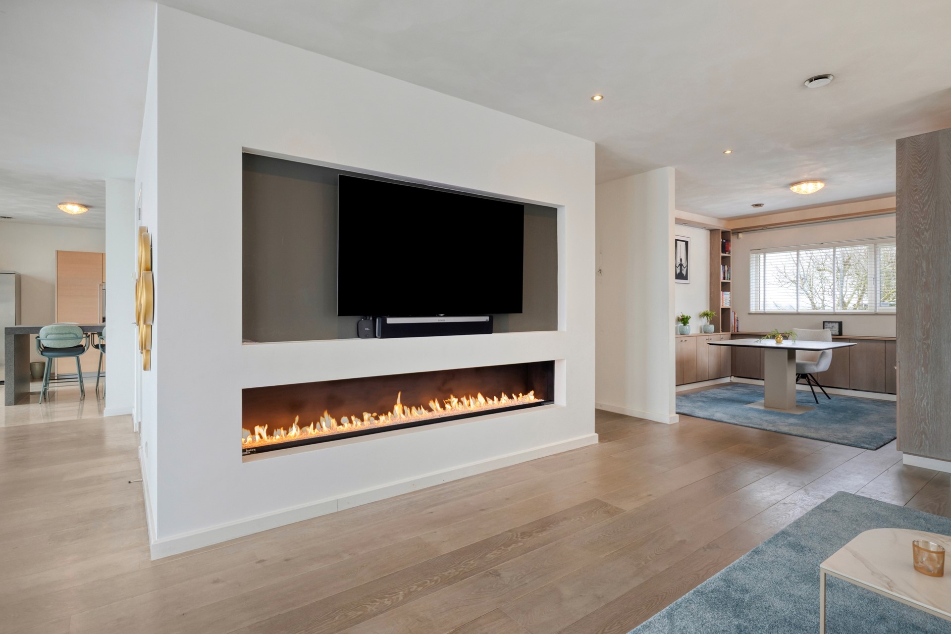 Bij binnenkomst in de woonkamer bent u direct onder de indruk van de architectuur en lichte ruimte. De luxe living is afgewerkt met een houten vloer, gestucte wanden en een gestuct plafond. De gashaard vormt het stralende middelpunt van de kamer en creëert een warme, uitnodigende sfeer. De woonkamer biedt toegang tot de eetkamer, woonkeuken en de kantoorruimte.