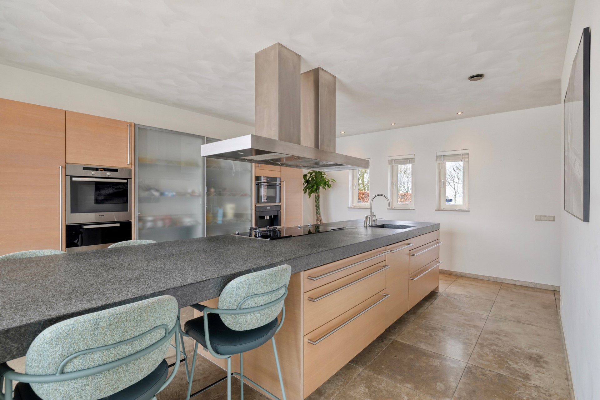 De open woonkeuken, het hart van het huis, is een ware eyecatcher. De open woonkeuken is afgewerkt met een marmeren vloer, gestucte wanden en een gestuct plafond. De recht opgestelde Poggenpohl keukeninrichting is voorzien van een koffiemachine, granieten keukenblad, koelkast, vriezer, 2 heteluchtovens, warmhoutladen, vaatwasser en kookeiland met inductie kookplaat, wokbrander en grill, afzuigkap en een spoelbak met Quooker.