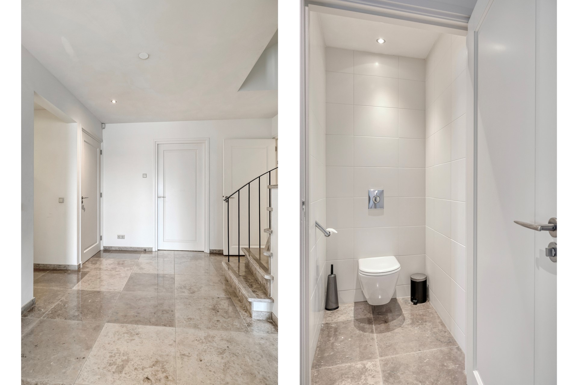 Vanuit de eetkamer is er toegang tot de hal c.q. overloop die toegang biedt tot o.a. het souterrain en de eerste verdieping. De hal is afgewerkt met een houten vloer, gestucte wanden en plafond. De hal biedt tevens toegang tot het modern betegelde toilet met fonteintje.