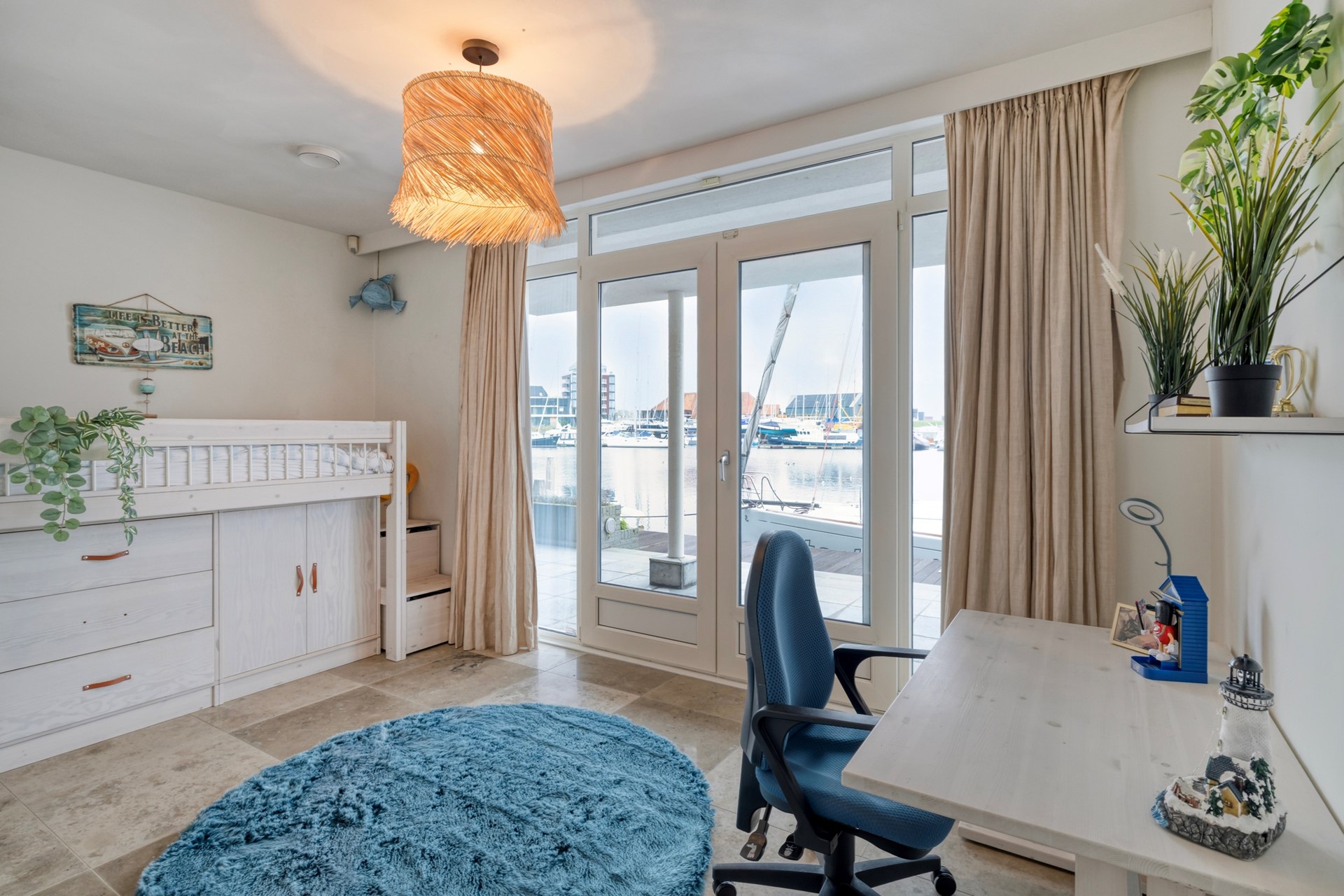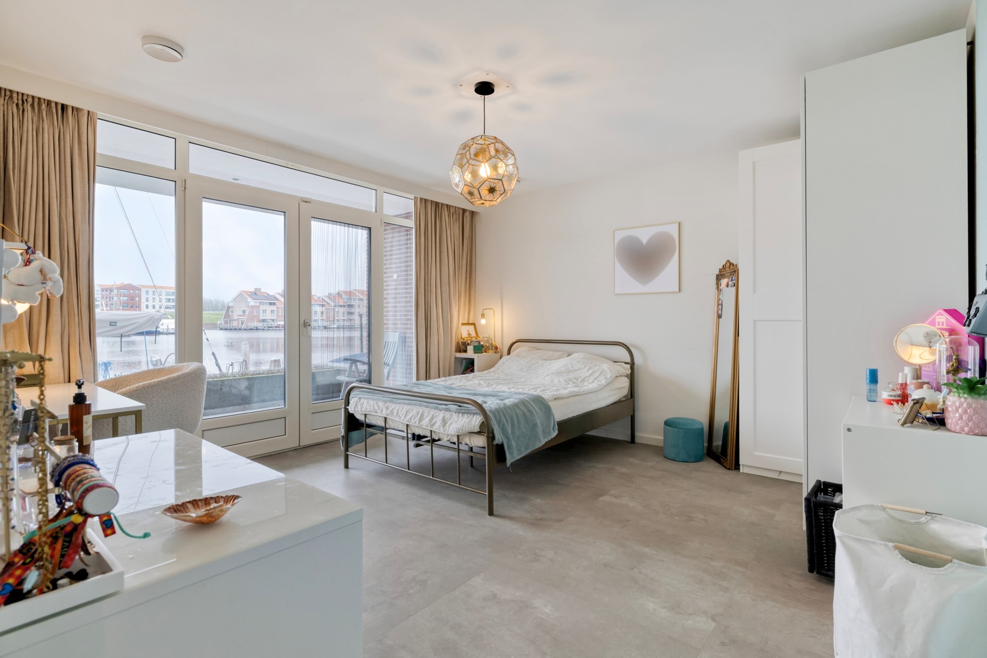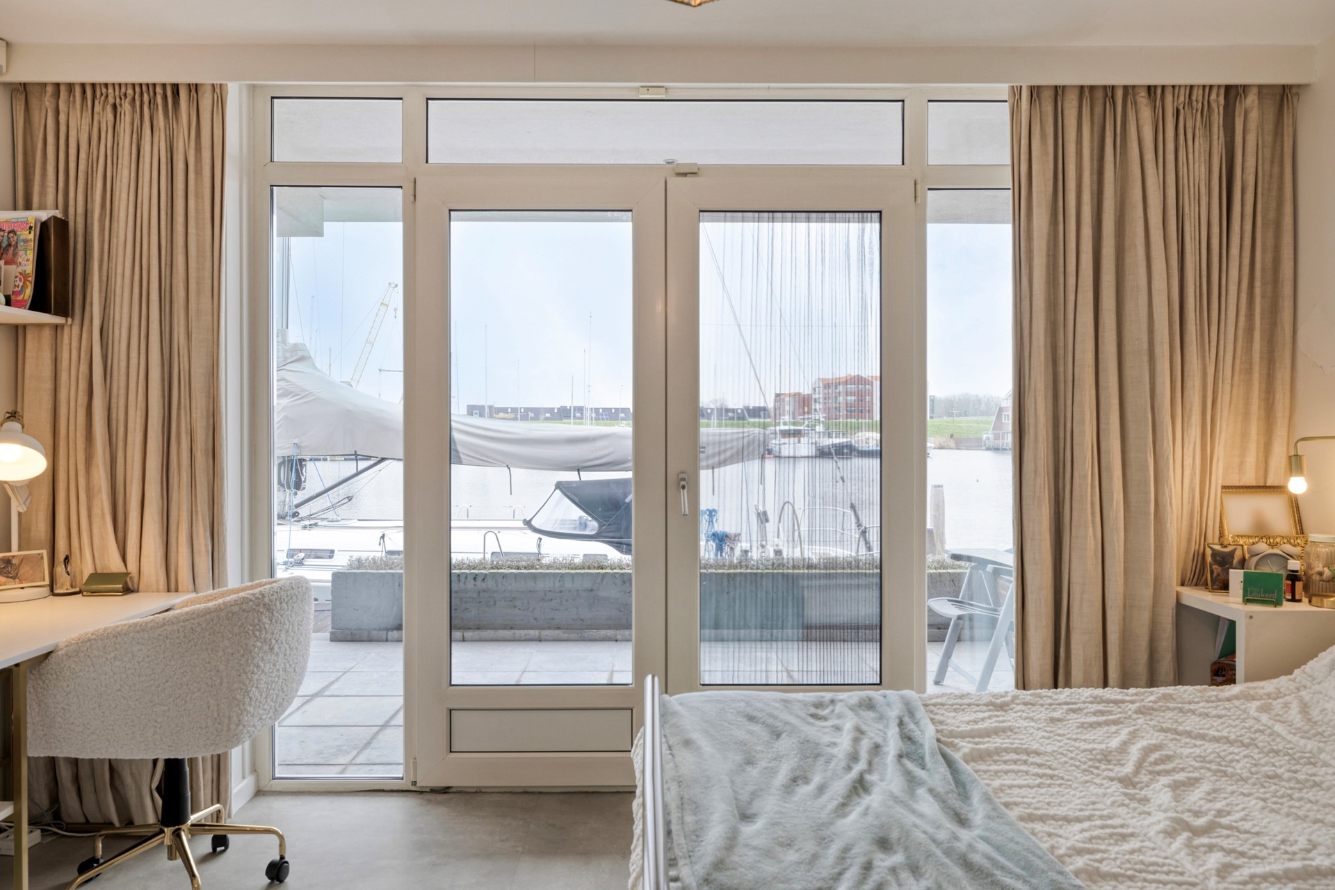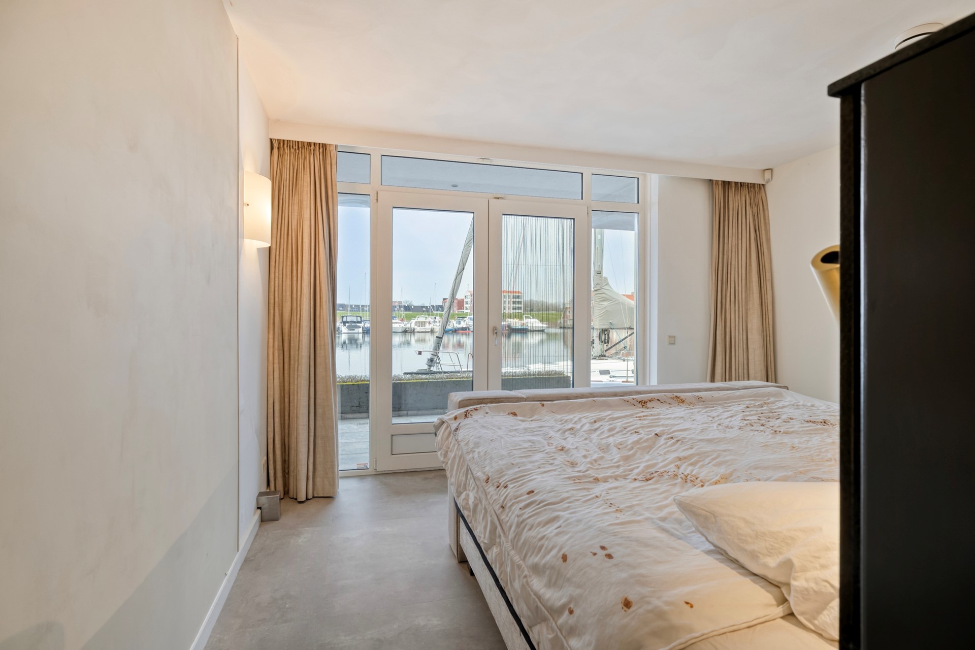 Slaapkamer 1 is afgewerkt met een betegelde vloer, gestucte wanden en plafond. De slaapkamer biedt toegang tot de steiger middels openslaande tuindeuren voorzien van 1 plissé hor.